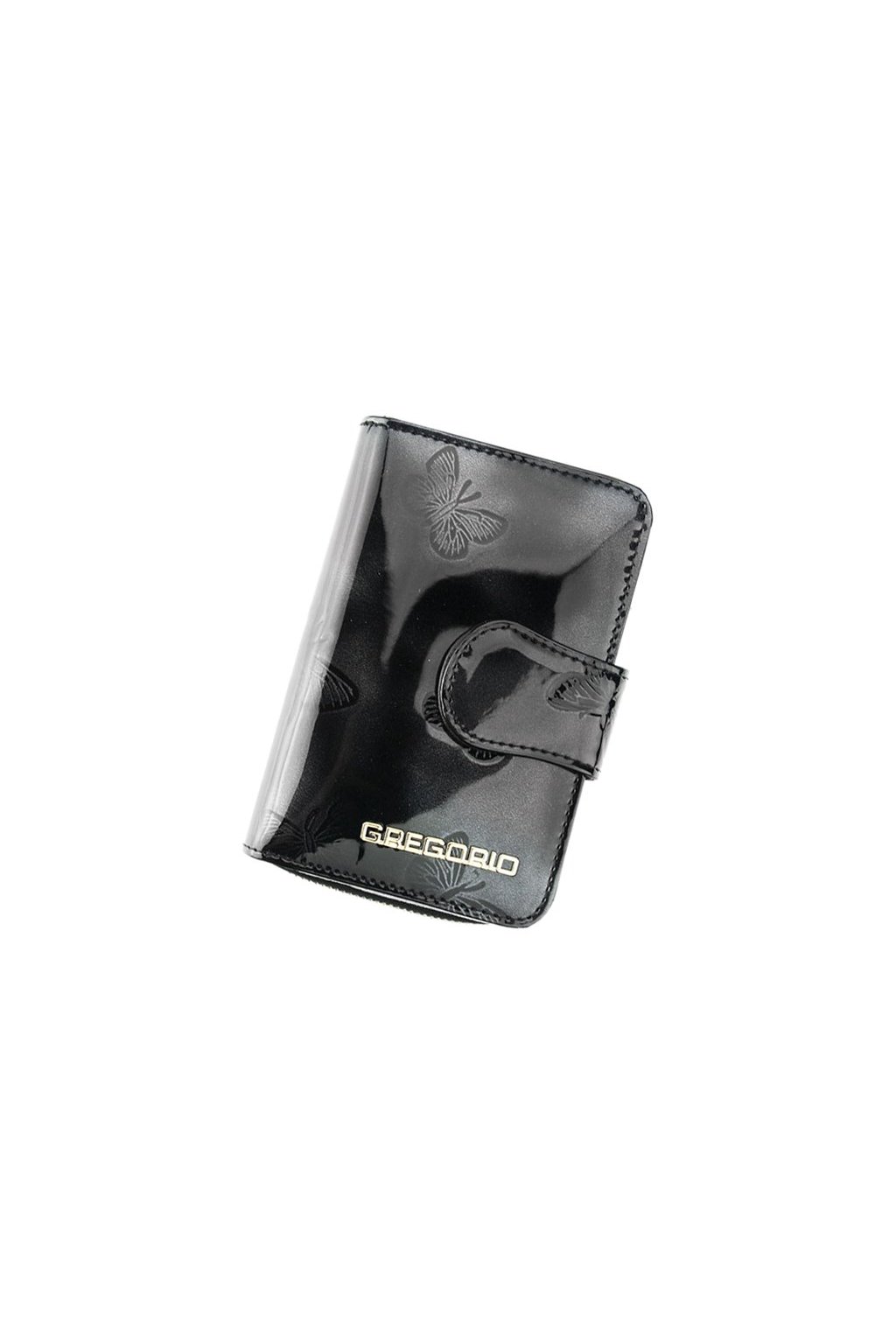 Nieduży portfel damski, wykonany z najwyższej jakości naturalnej, włoskiej skóry licowej lakierowanej, z wytłoczonym wzorem motyli.