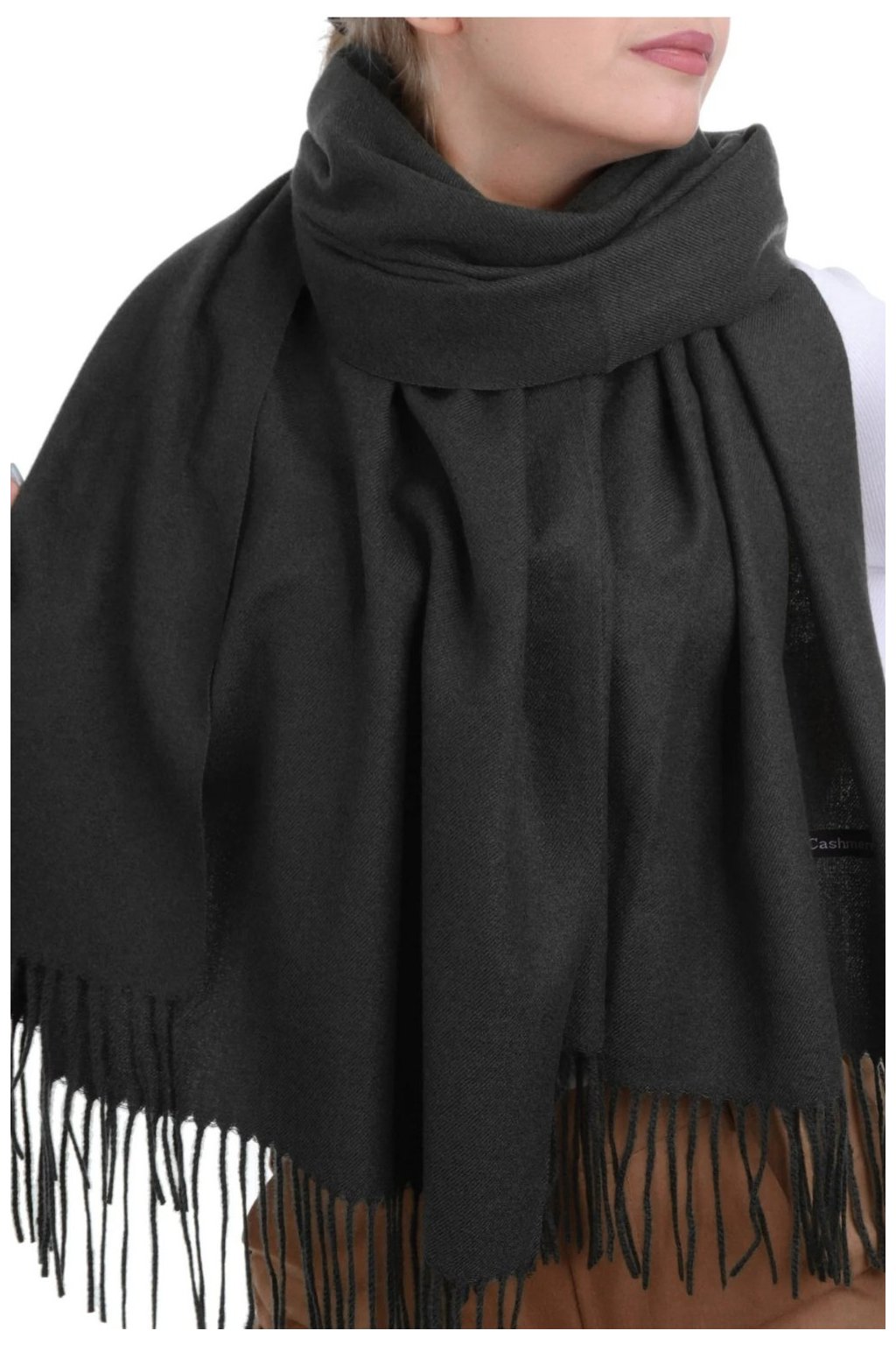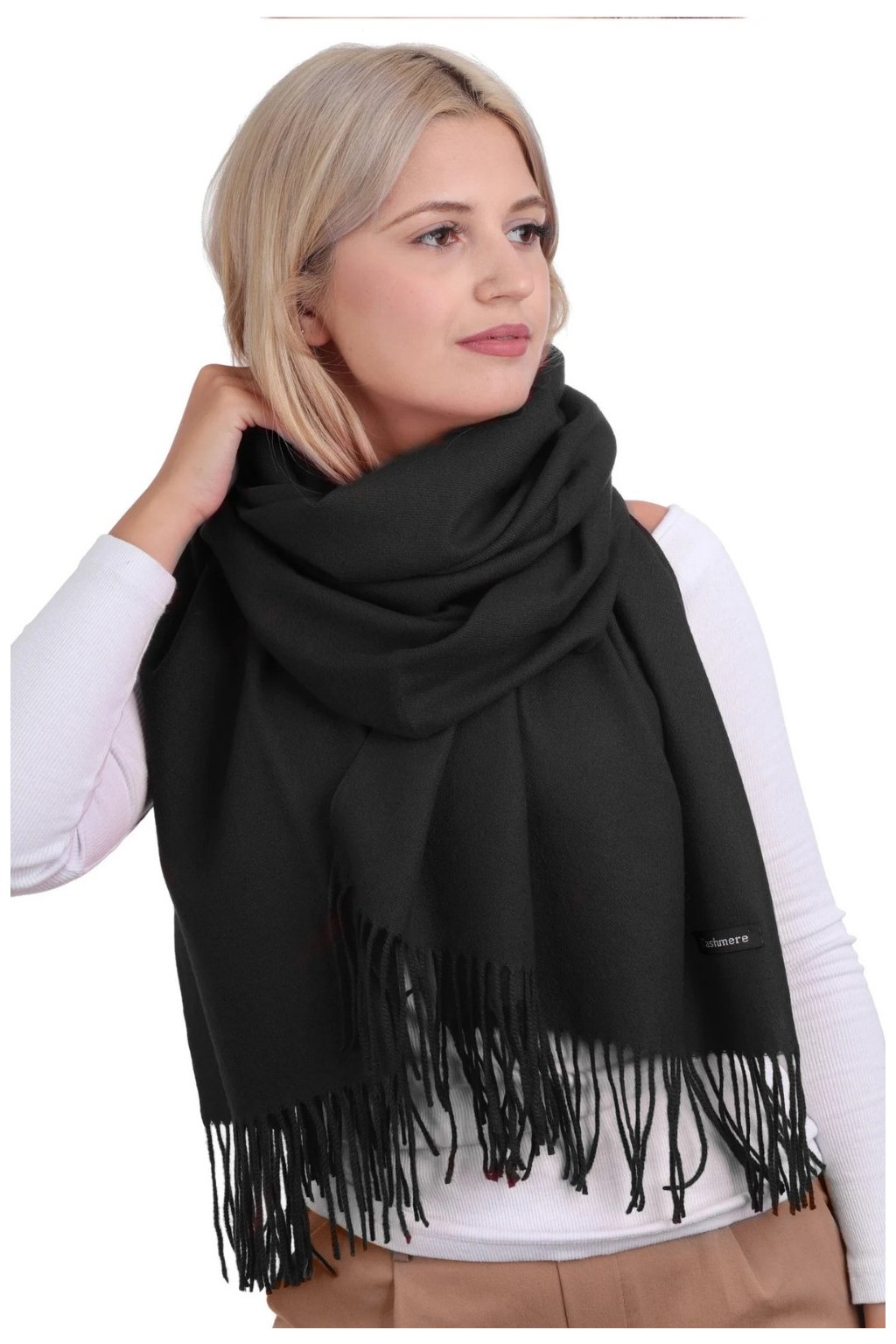 černý šál, dámský zimní šál, teplý šál s třásněmi, viskózový šál, elegantní dámský šátek, podzimní a zimní šál, šál k šatům, hřejivý šál.