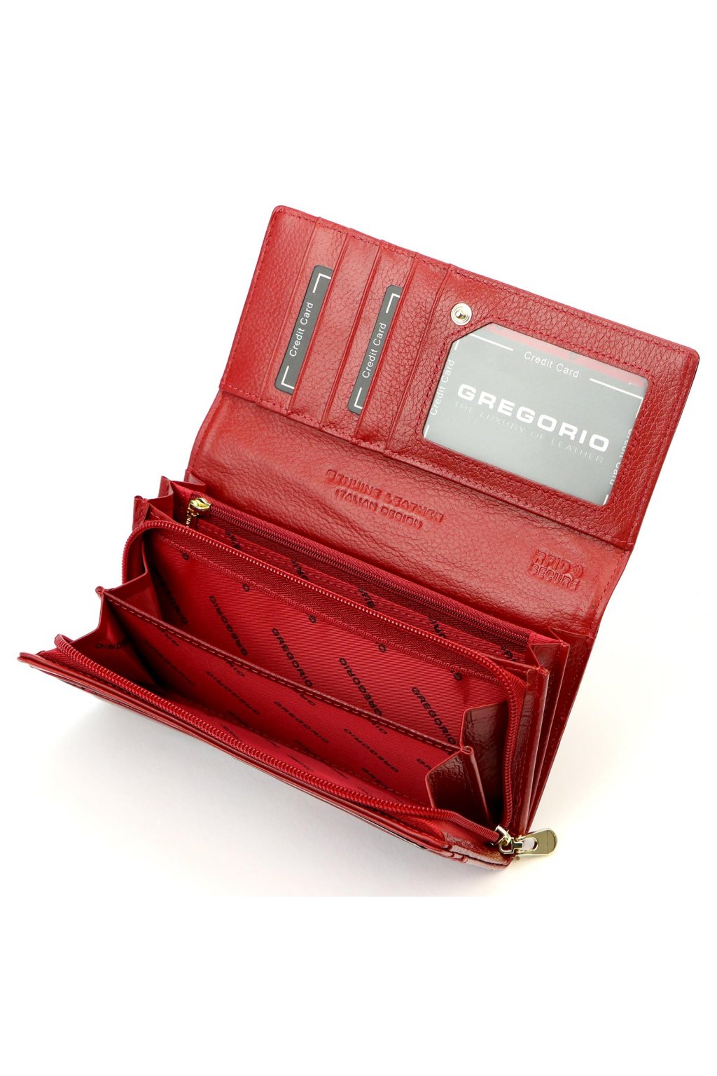 Peněženka nabízí přehledné členění s přihrádkami na karty, doklady a bankovky. Součástí je zipová kapsa na mince a dvě průhledné kapsy na fotografie nebo průkazy. Vnitřní rozvržení zajišťuje přehlednost a pohodlí při každodenním používání.