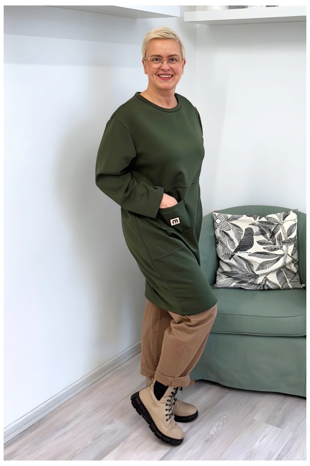 Volný oversize střih lichotí plnějším křivkám a zároveň zaručuje volnost pohybu. Praktická našitá kapsa s ozdobnou nášivkou dodává šatům ležérní městský charakter. Tříčtvrteční rukávy a délka ke kolenům vytvářejí univerzální kombinaci pro celoroční nošení – stačí přidat legíny nebo punčochy.