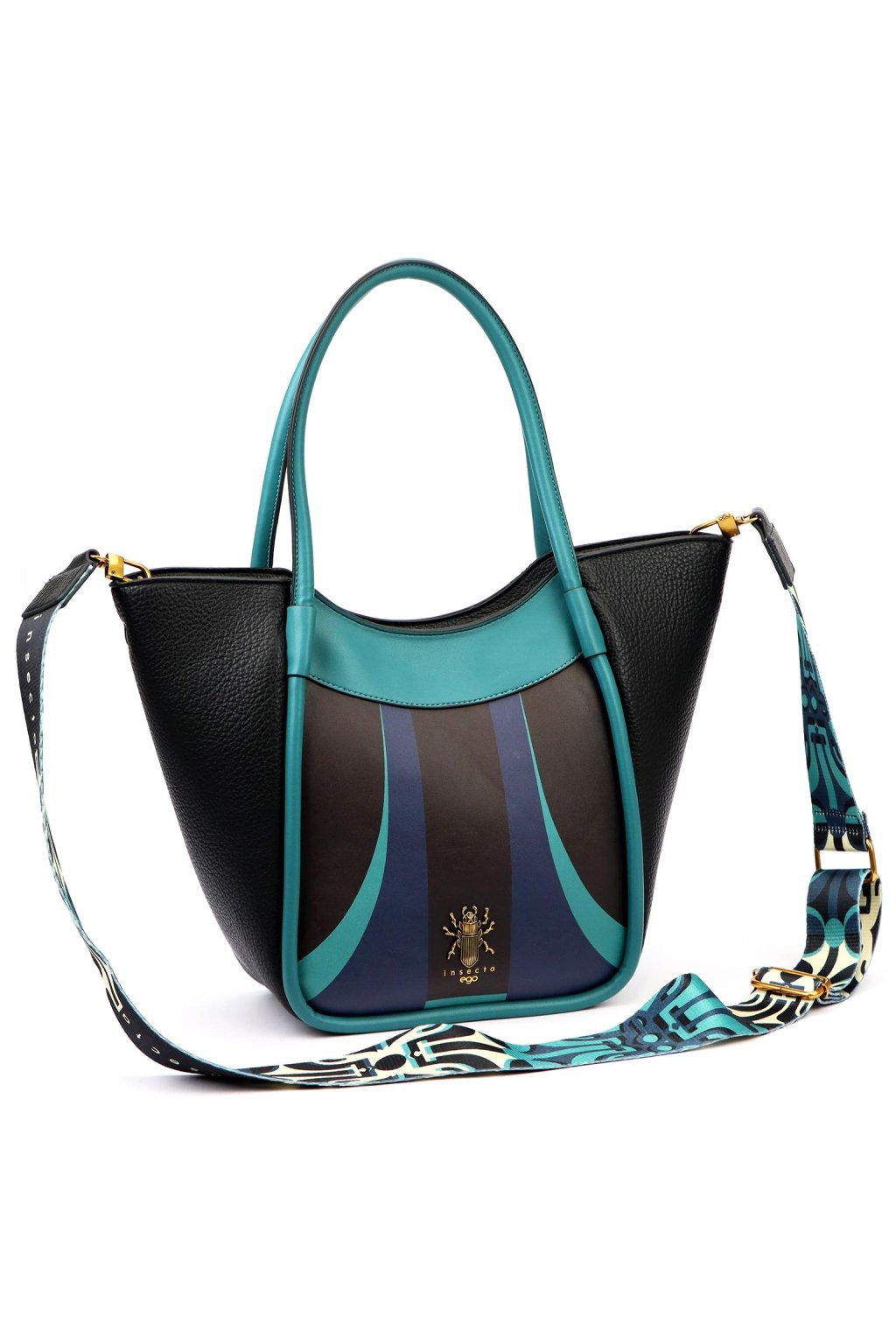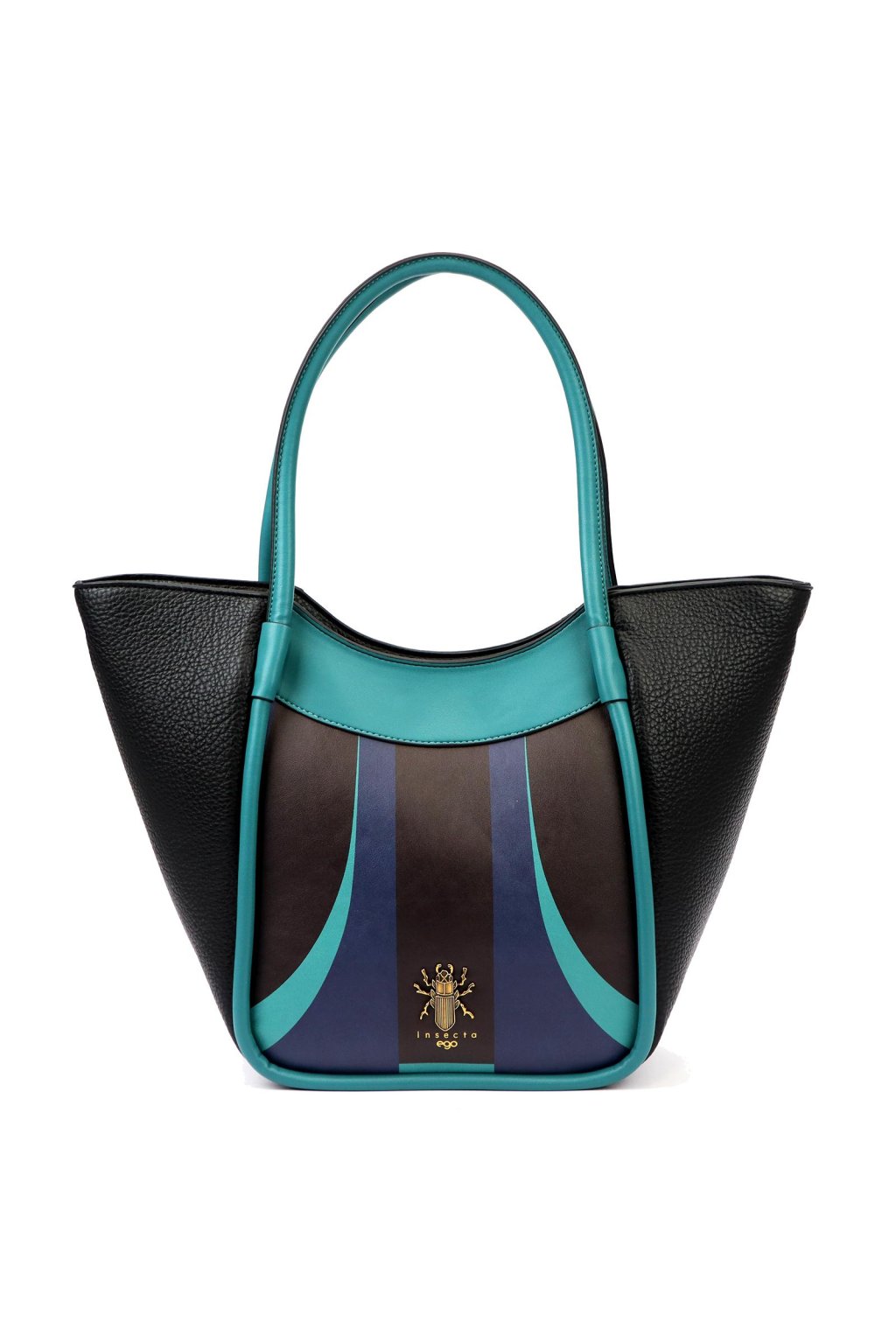 Dámská kabelka typu shopper s pevnými, delšími uchy pro pohodlné nošení na rameni a odnímatelným, délkově nastavitelným textilním popruhem pro crossbody styl. Pevnější konstrukce drží tvar a lehce rozšířené boky dodávají moderní siluetu. Přední stranu zdobí výrazný barevný panel s emblémem brouka a logem Insecta EGO ve zlatém tónu. Hlavní prostor je uzavíratelný na zip, vnitřek je vybaven kapsami pro lepší organizaci osobních věcí. Spodní část je opatřena kovovými nožkami pro ochranu materiálu.