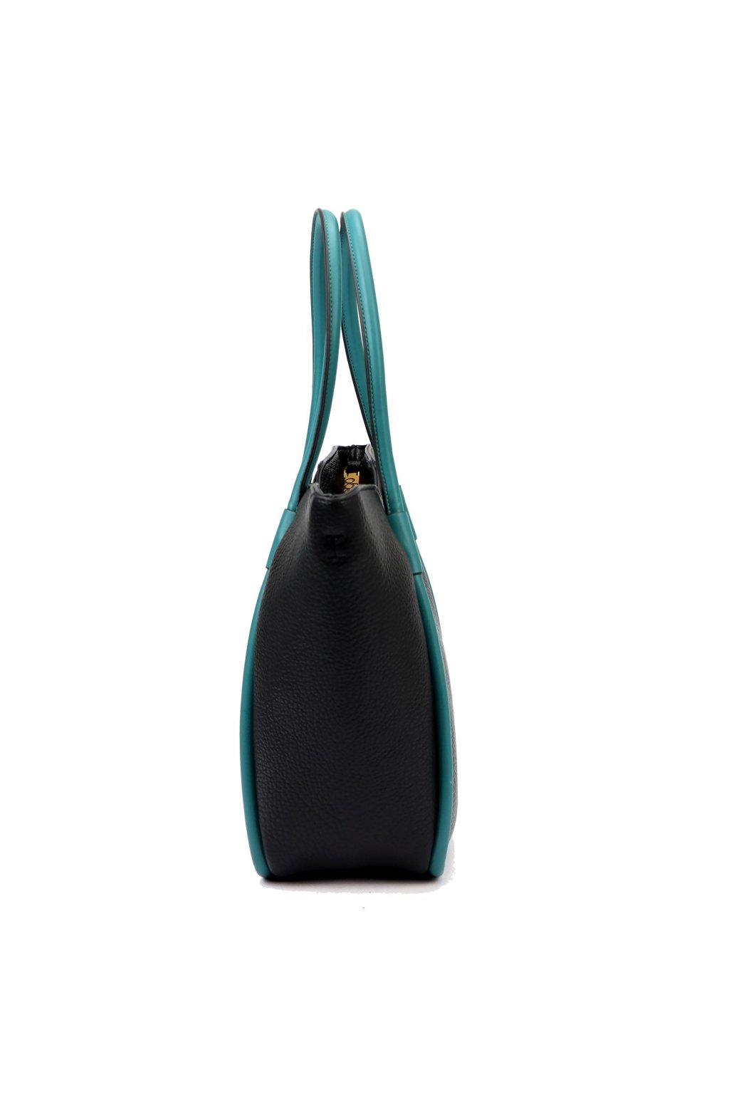 Pravá kůže s výraznější strukturou v kombinaci s hladkými a barevně kontrastními prvky. Kvalitní kovové detaily ve zlatém tónu, textilní podšívka s potiskem, zapínání na zip.
