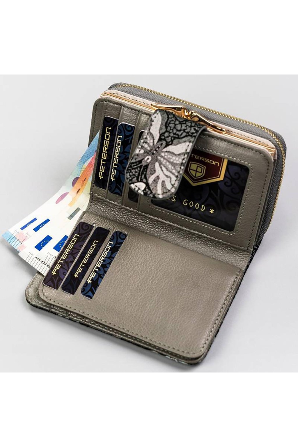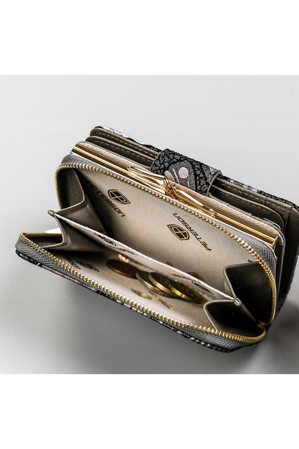 Uvnitř najdete dostatek přihrádek na karty, bankovky i doklady a samostatnou část na mince. Díky promyšlenému členění zůstává vše přehledné a snadno dostupné.