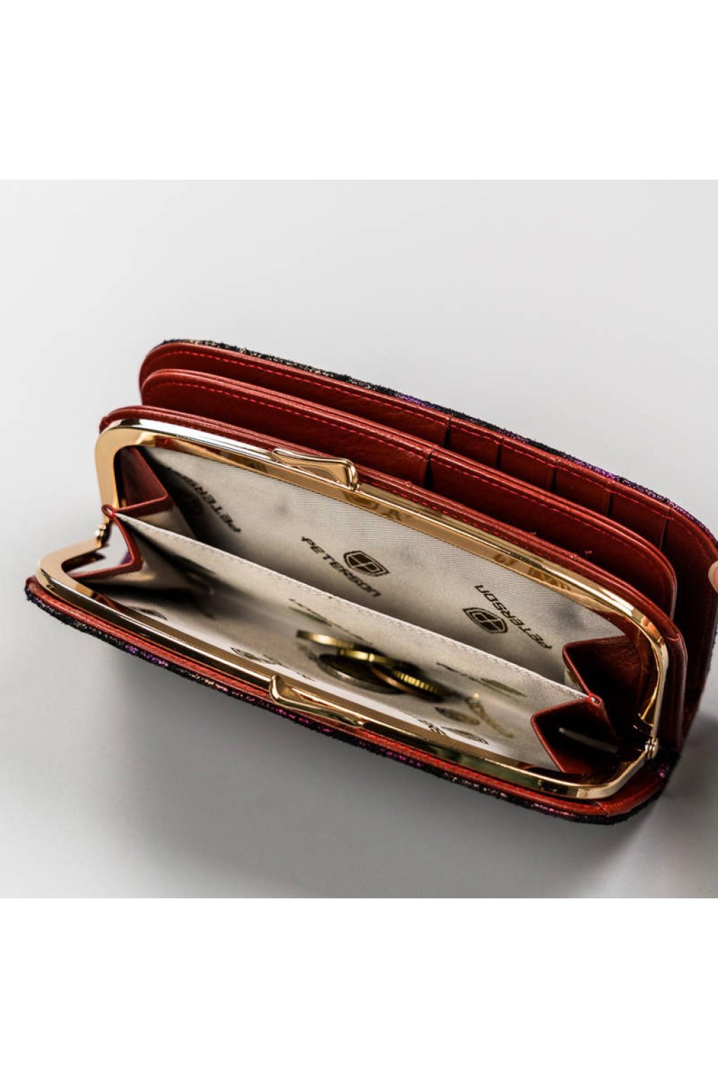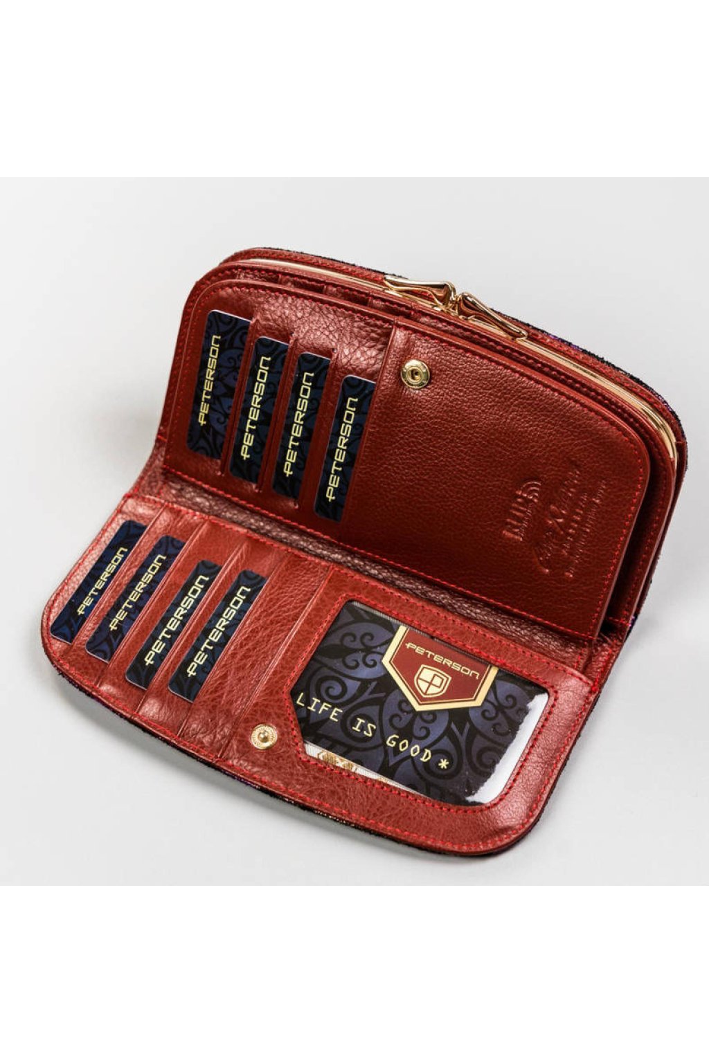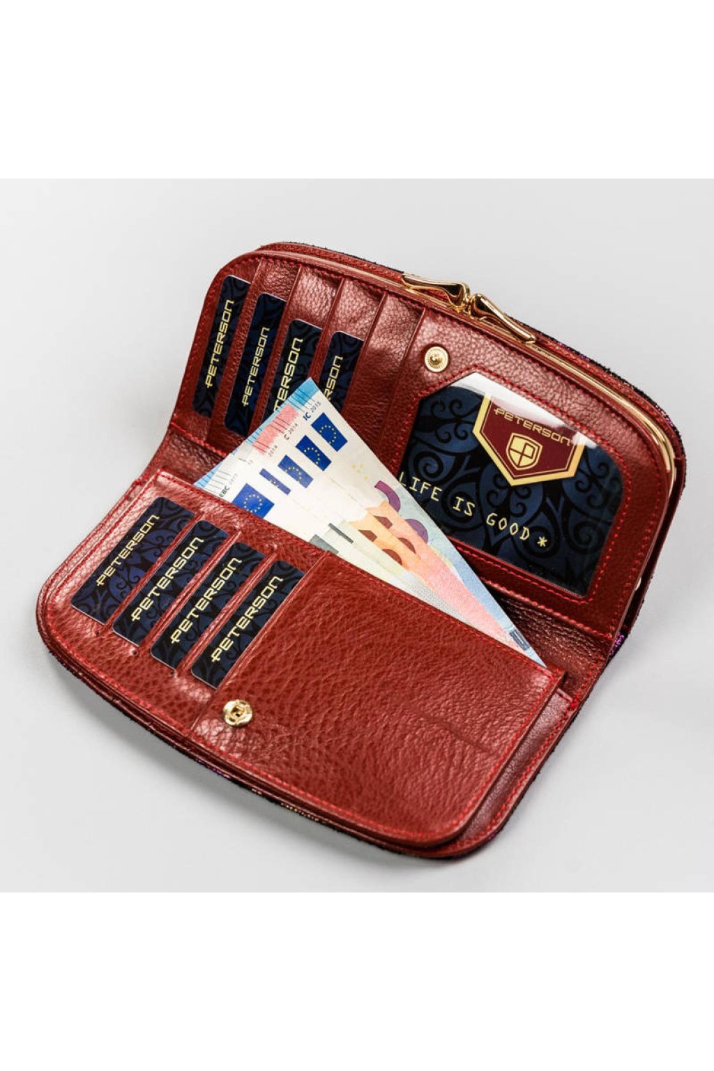 Peněženka nabízí přihrádky na bankovky, doklady a karty, doplněné o prostornou část na mince uzavíratelnou kovovým mechanismem. Díky přehlednému členění poskytuje dostatek prostoru a pohodlí při používání.