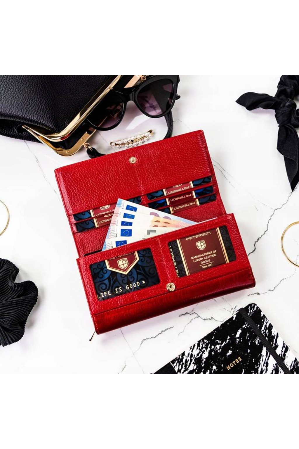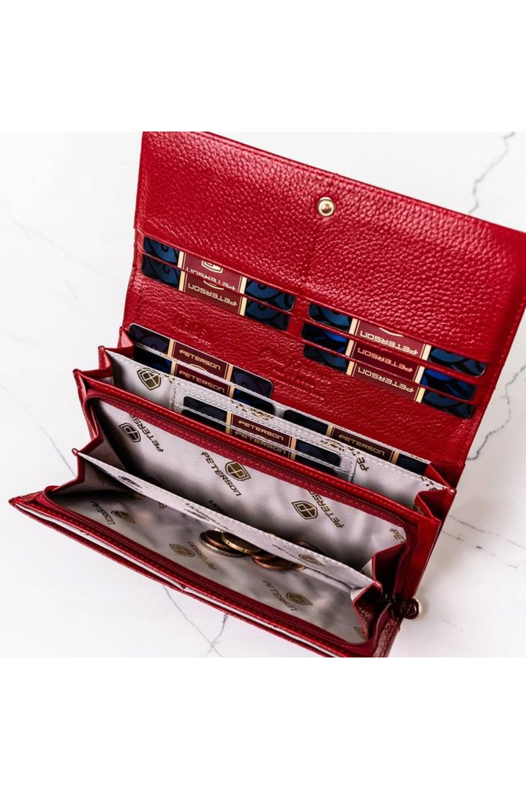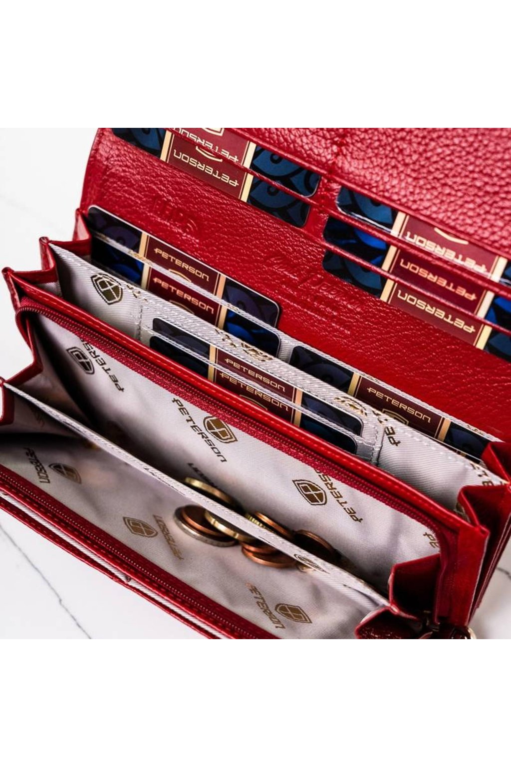 Uvnitř se nachází přihrádky na platební i věrnostní karty, kapsy na bankovky a samostatná část na mince uzavíratelná zipem. Praktické rozvržení umožňuje přehledné uspořádání všech drobností.