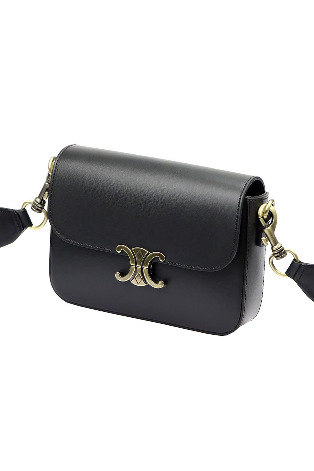 malá kabelka – hladká kůže – kovová ozdoba – klopa – přes tělo – crossbody – zip – elegantní – černá – minimalistická – klasická