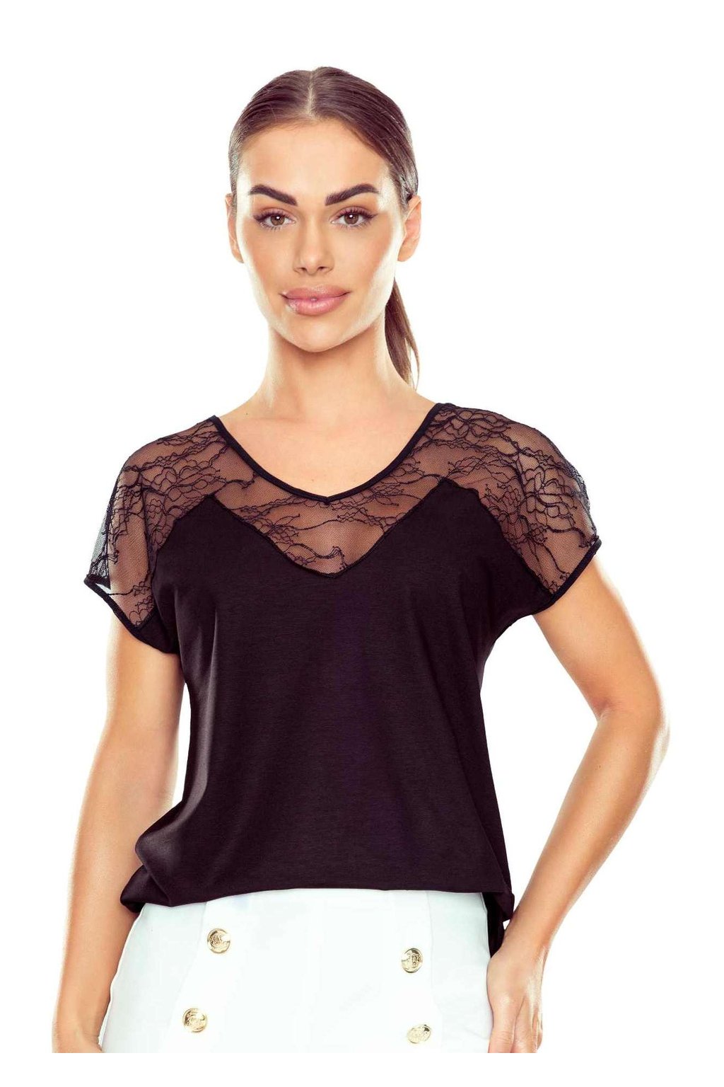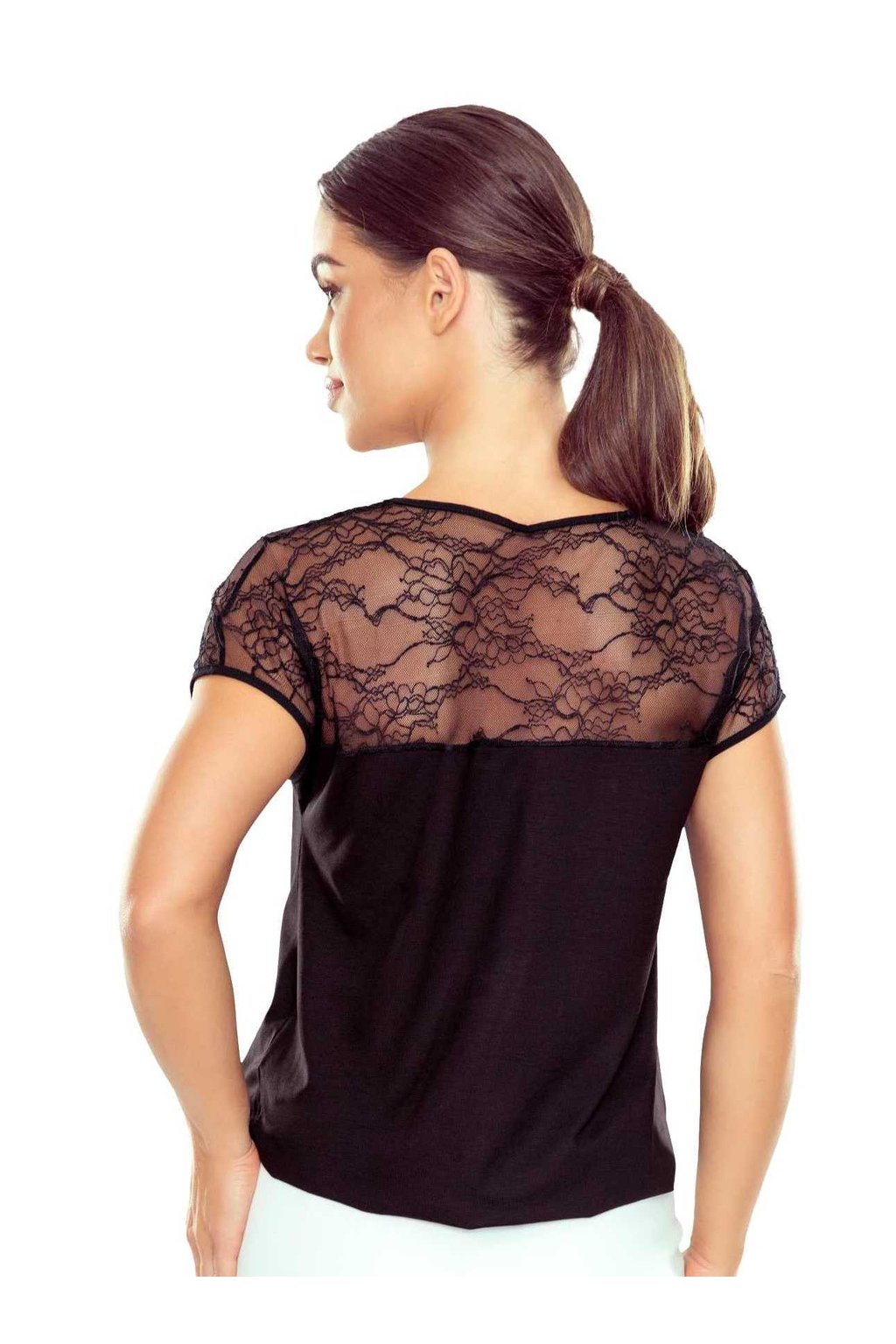 Elegantní halenka s krátkým rukávem a jemnou krajkovou vsadkou, která dodává modelu ženský a kultivovaný vzhled. Horní část včetně výstřihu a ramen je řešena průsvitnou krajkou, spodní díl zůstává hladký a splývavý. Díky viskózovému materiálu je halenka příjemná na nošení a dobře se přizpůsobí postavě. Snadno se kombinuje jak do pracovního prostředí, tak pro společenské příležitosti.