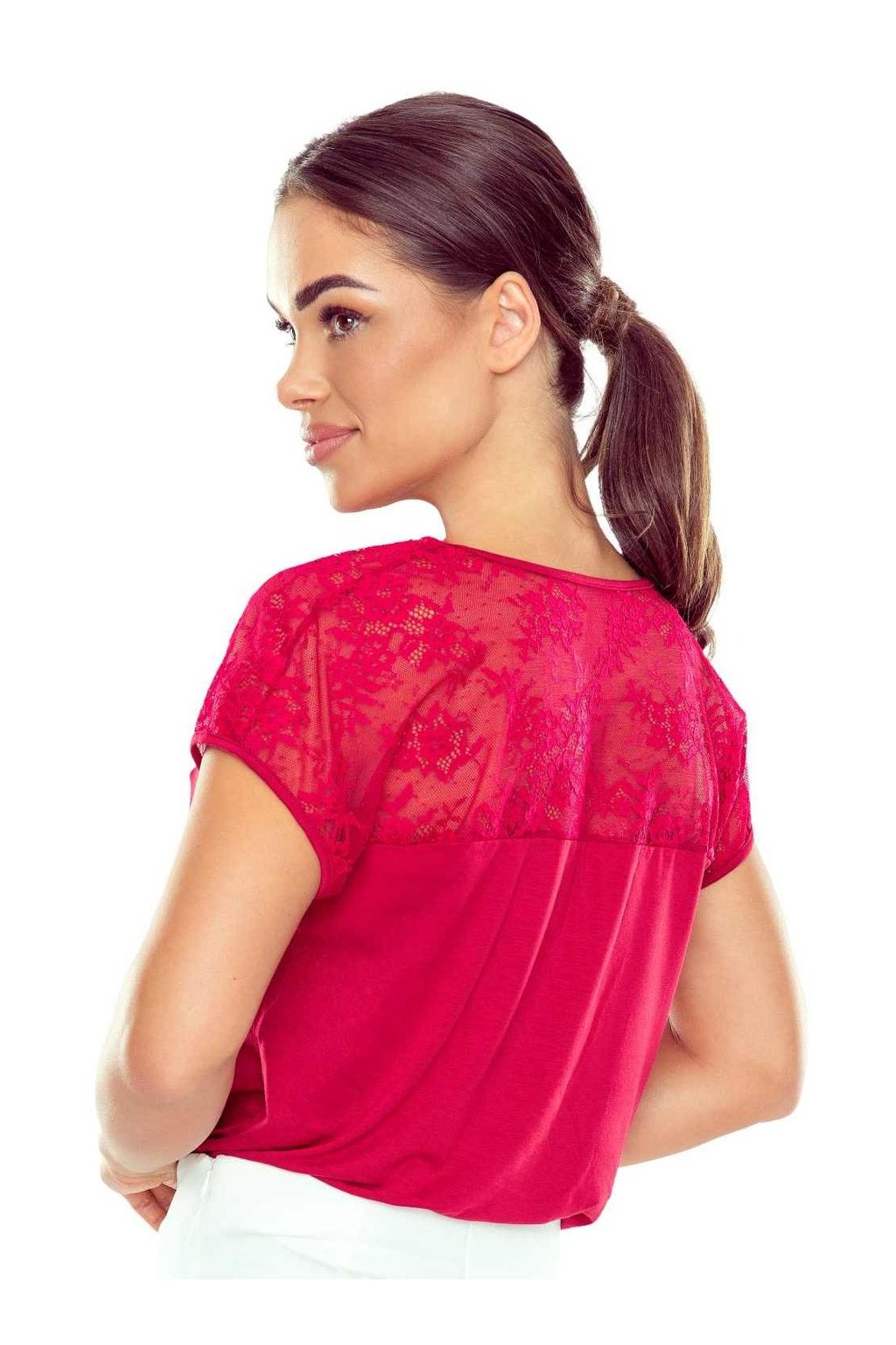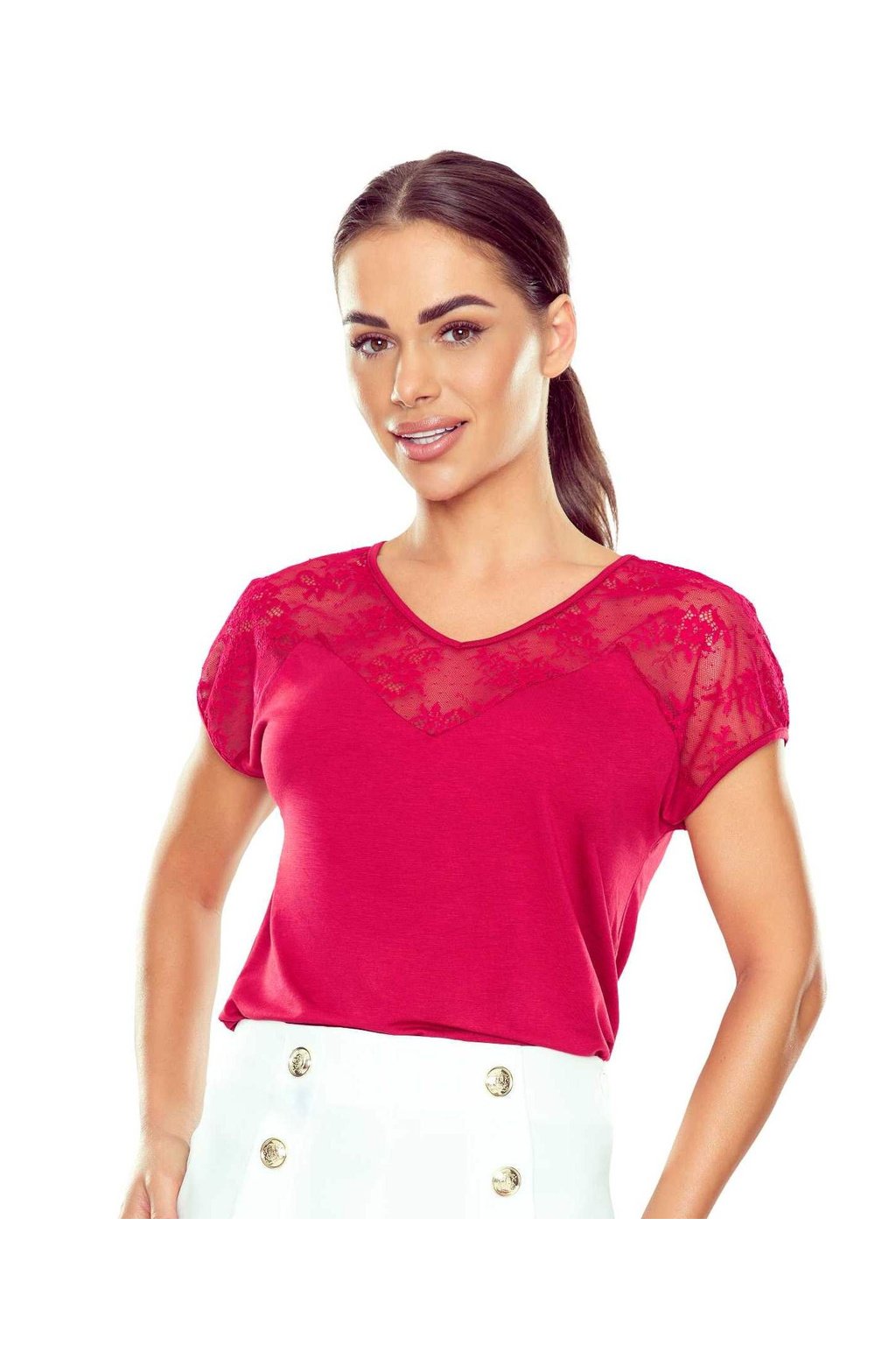 Elegantní halenka s krátkým rukávem a jemnou krajkovou vsadkou, která dodává modelu ženský a kultivovaný vzhled. Horní část včetně výstřihu a ramen je řešena průsvitnou krajkou, spodní díl zůstává hladký a splývavý. Díky viskózovému materiálu je halenka příjemná na nošení a dobře se přizpůsobí postavě. Snadno se kombinuje jak do pracovního prostředí, tak pro společenské příležitosti.
