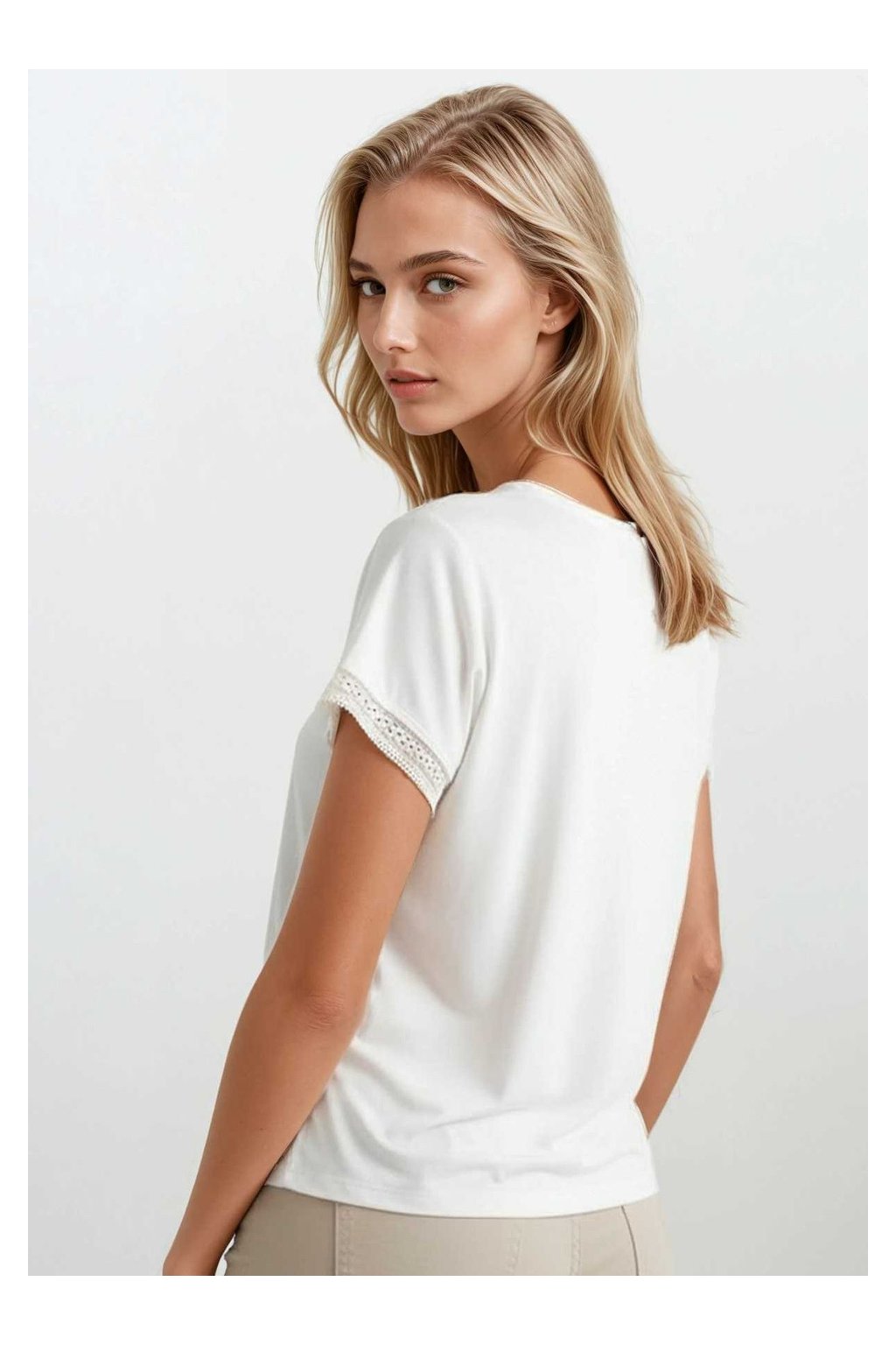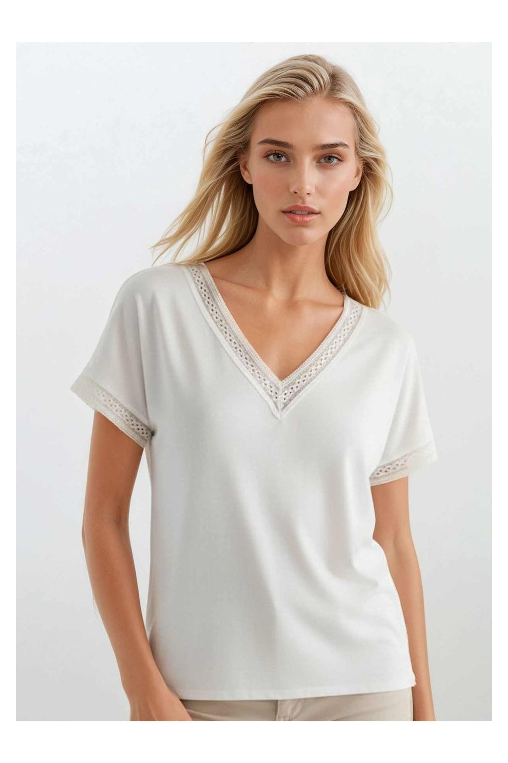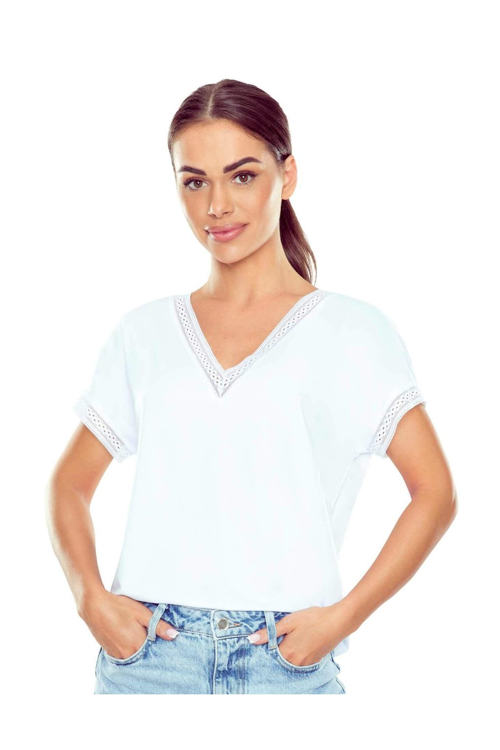 Lehce splývavá halenka s krátkým rukávem, která působí čistě, svěže a velmi nositelně. Výstřih do jemného „V“ a zakončení rukávů jsou doplněny nenápadnou dekorativní vsadkou, která modelu dodává ženský detail, aniž by narušila jeho jednoduchost. Díky viskózovému materiálu je halenka měkká, prodyšná a příjemná na každodenní nošení. Hodí se jako univerzální základ do práce i pro volnější městské kombinace.