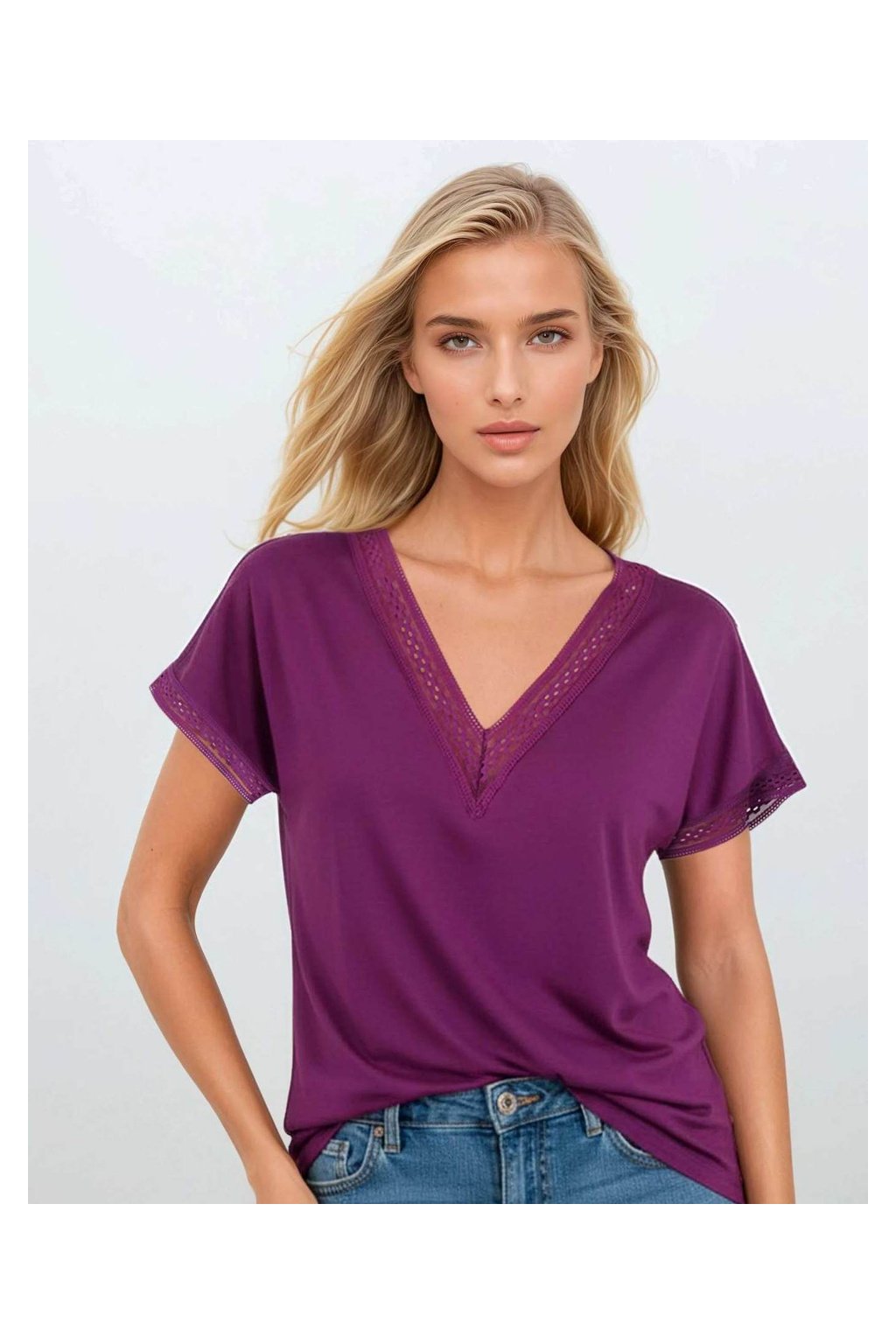 Lehce splývavá halenka s krátkým rukávem, která působí čistě, svěže a velmi nositelně. Výstřih do jemného „V“ a zakončení rukávů jsou doplněny nenápadnou dekorativní vsadkou, která modelu dodává ženský detail, aniž by narušila jeho jednoduchost. Díky viskózovému materiálu je halenka měkká, prodyšná a příjemná na každodenní nošení. Hodí se jako univerzální základ do práce i pro volnější městské kombinace.