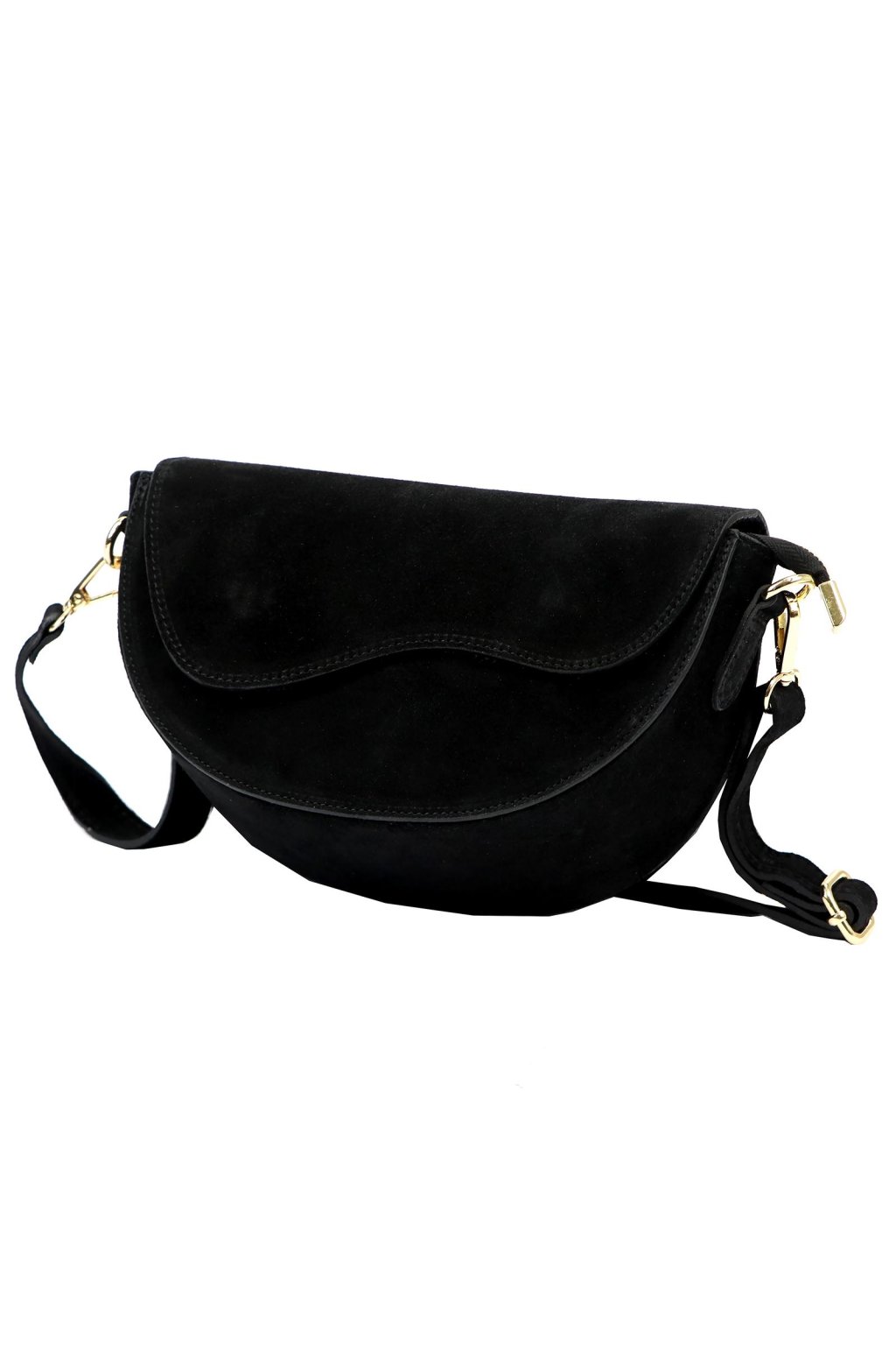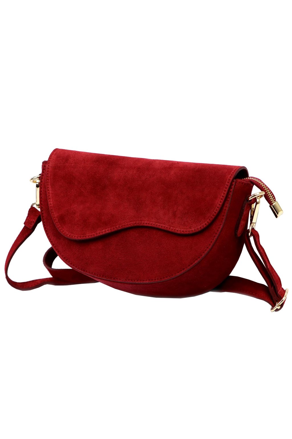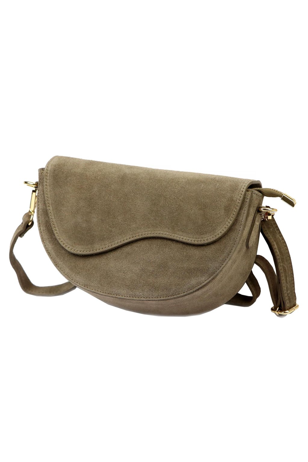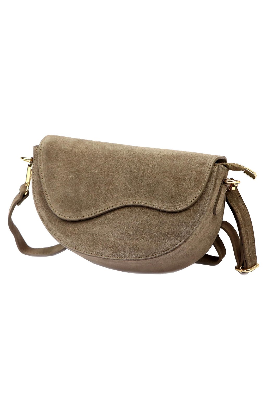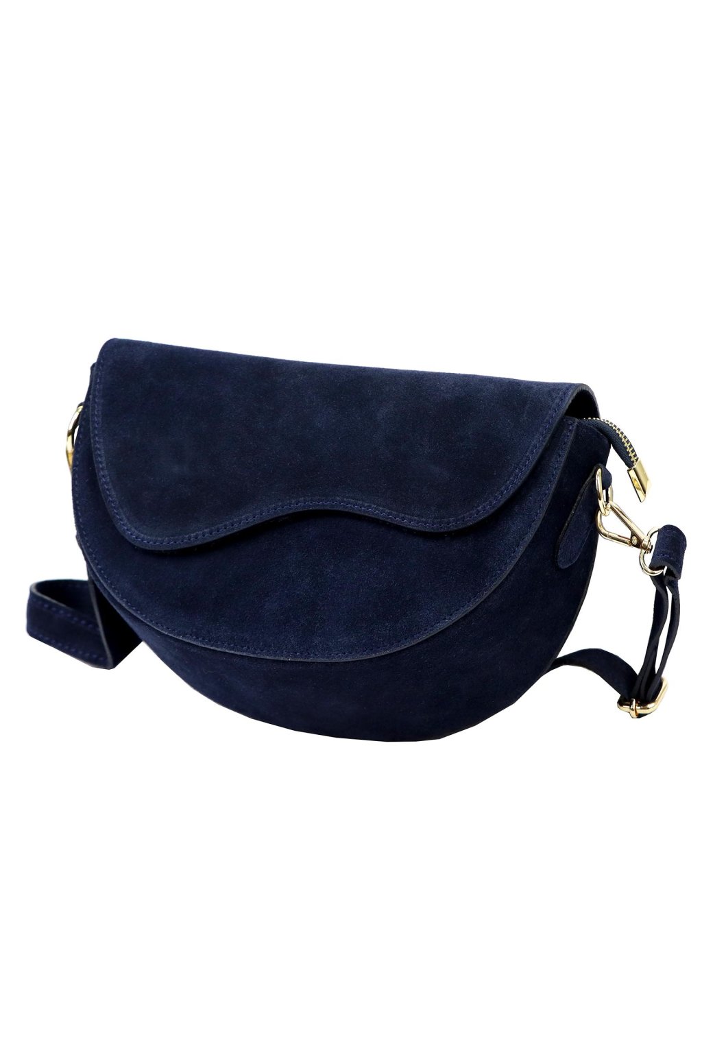 Tato kožená kabelka v půvabném půlměsícovém tvaru okouzlí svou jemností i rafinovaným designem. Hebký semišový povrch a zaoblená klopa s měkkou linií působí žensky a originálně. Zlacené detaily a decentní pásek na boku podtrhují její vytříbený styl. Nastavitelný popruh umožňuje pohodlné nošení přes rameno i crossbody.