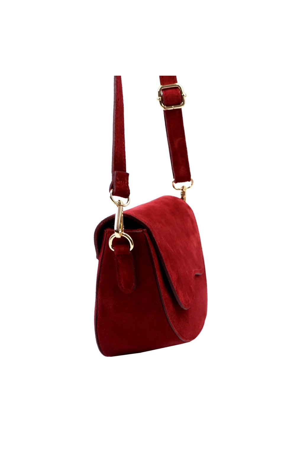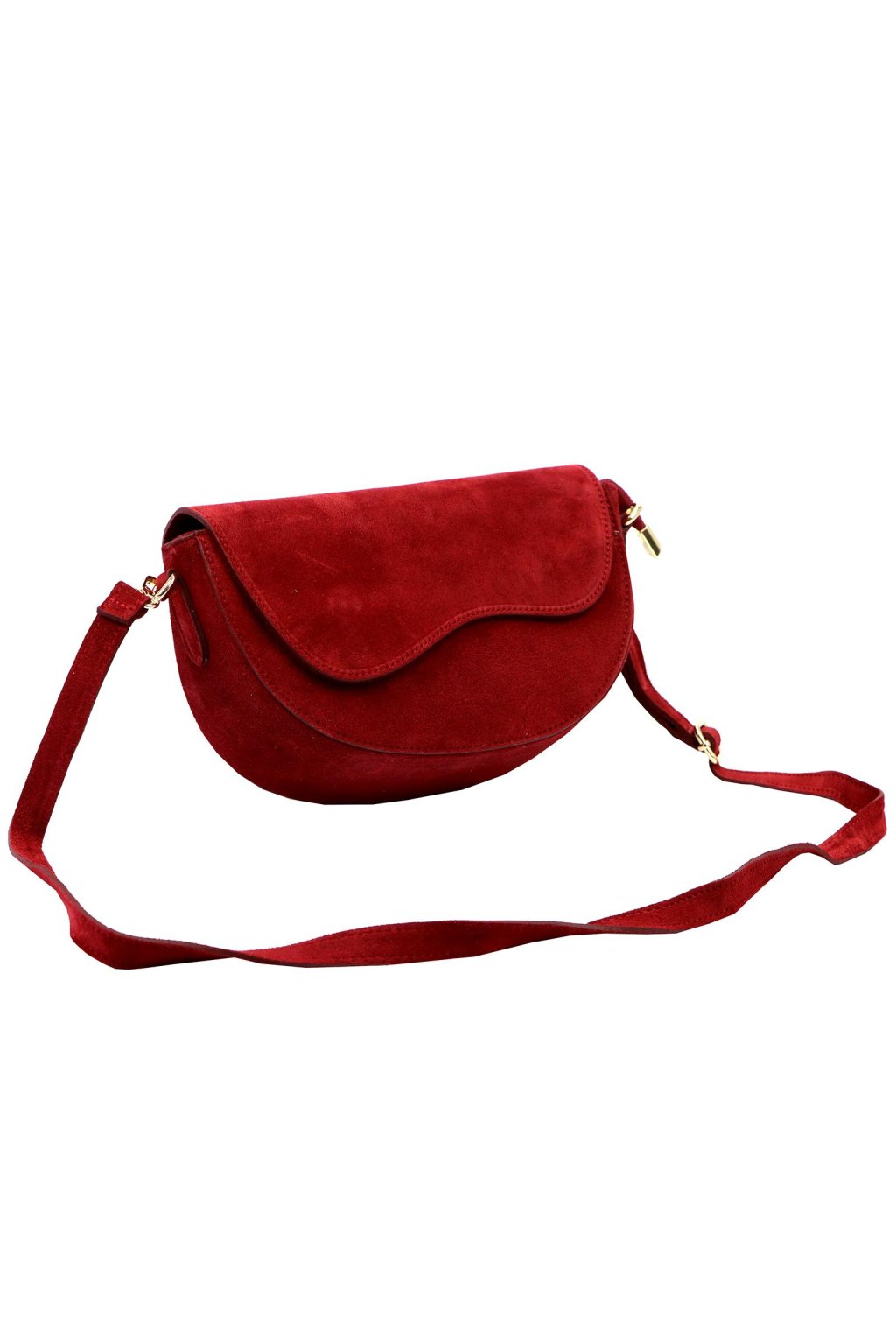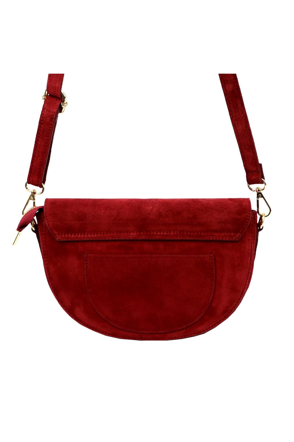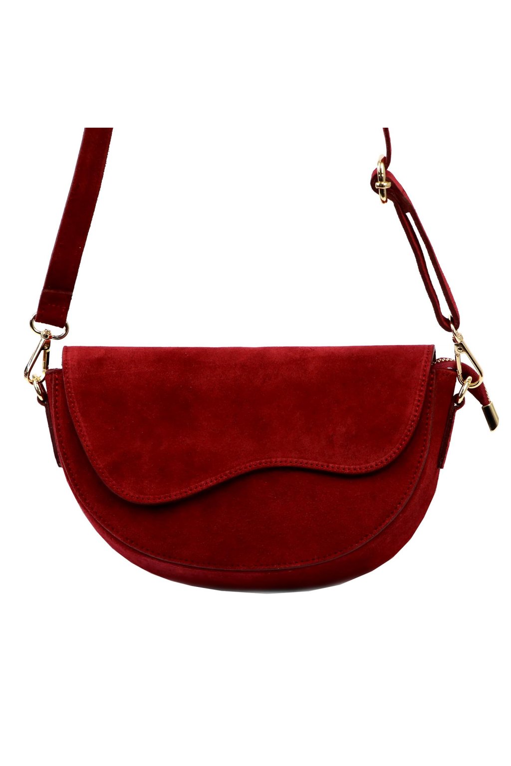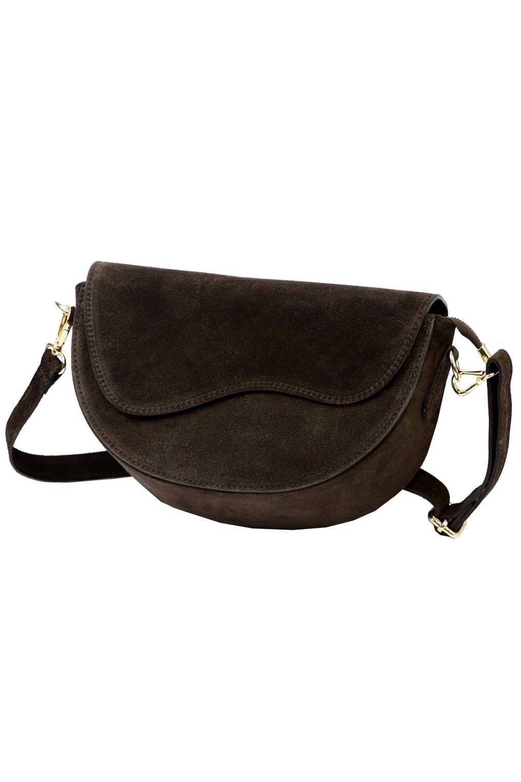 Tato kožená kabelka v půvabném půlměsícovém tvaru okouzlí svou jemností i rafinovaným designem. Hebký semišový povrch a zaoblená klopa s měkkou linií působí žensky a originálně. Zlacené detaily a decentní pásek na boku podtrhují její vytříbený styl. Nastavitelný popruh umožňuje pohodlné nošení přes rameno i crossbody.