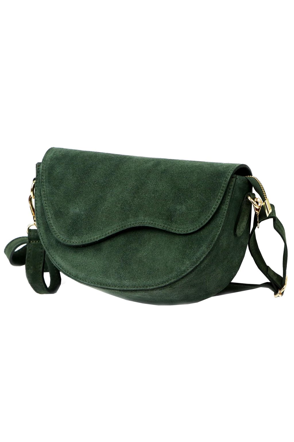 kožená kabelka přes rameno, zelená kabelka crossbody, půlkruhová kabelka semišová, elegantní malá kabelka, kabelka s klopou, tmavě zelená kabelka z broušené kůže