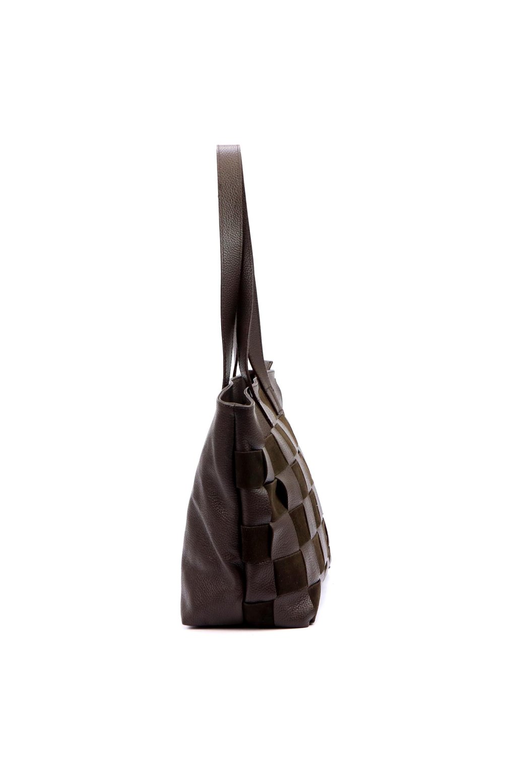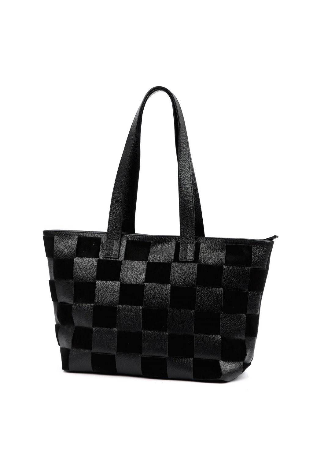 shopper kabelka z kůže, kostkovaná velká kabelka, prostorná kabelka do práce, černá dámská kabelka přes rameno, kožená kabelka s dlouhými uchy, nadčasová shopper taška, elegantní kabelka na každý den.