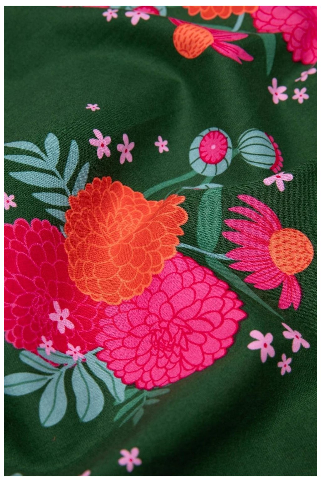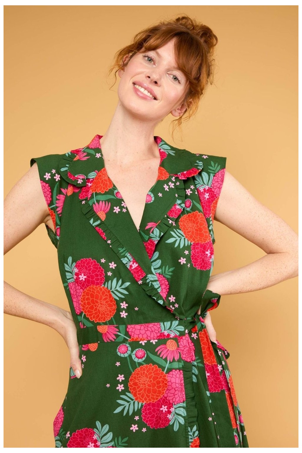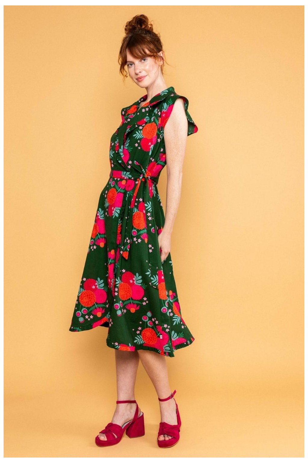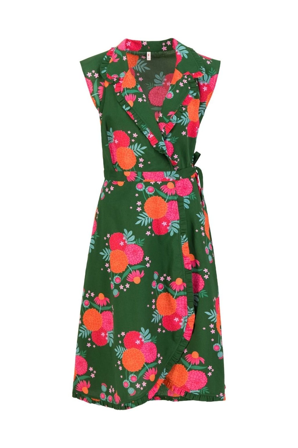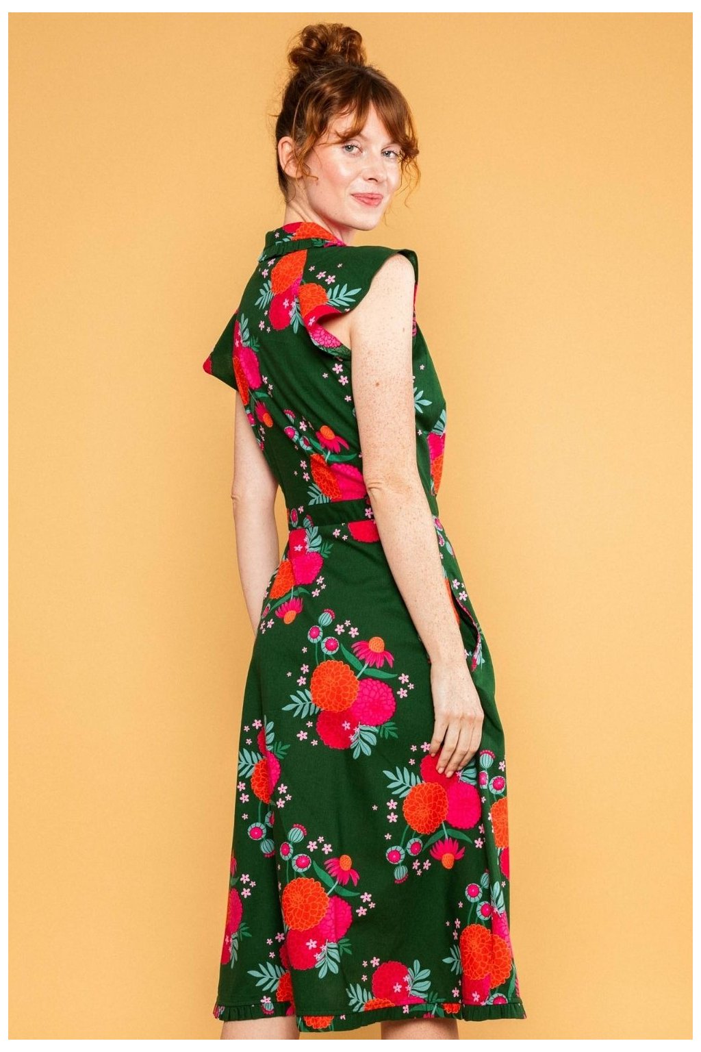 košilové šaty, zavinovací šaty, letní šaty do poloviny lýtek, šaty s volánem, květované šaty, zelené květinové šaty, šaty s páskem, šaty s kapsami, ženské elegantní šaty, šaty z bio bavlny, udržitelné šaty, viskóza LENZING ECOVERO, šaty na svatbu, šaty na oslavu, romantické šaty