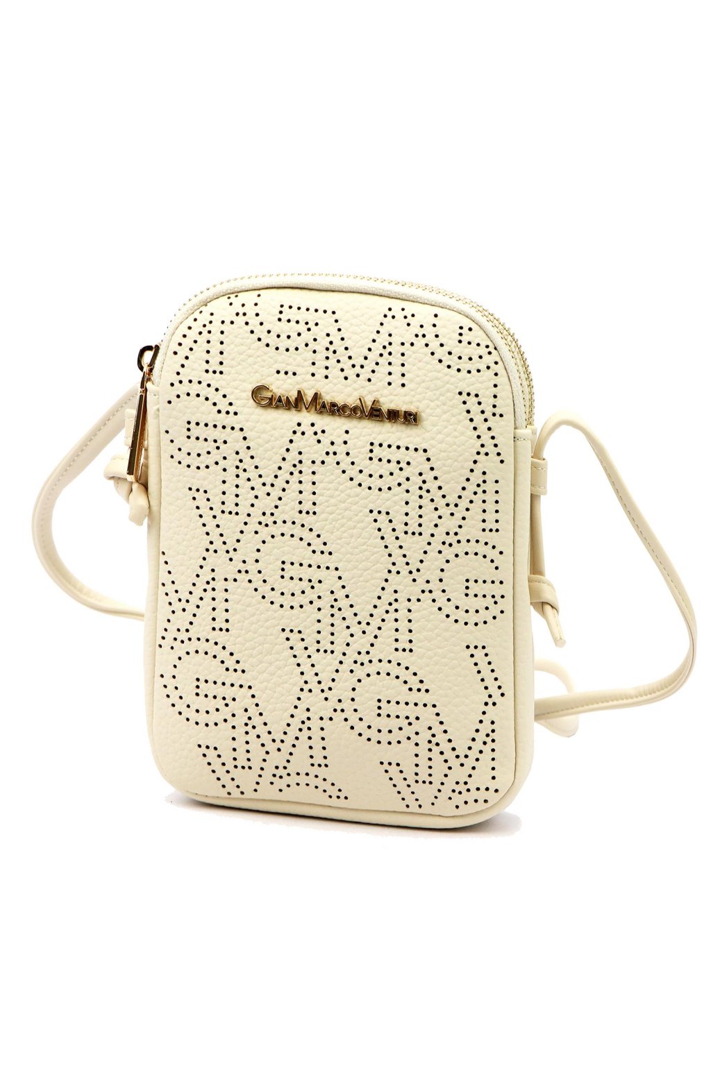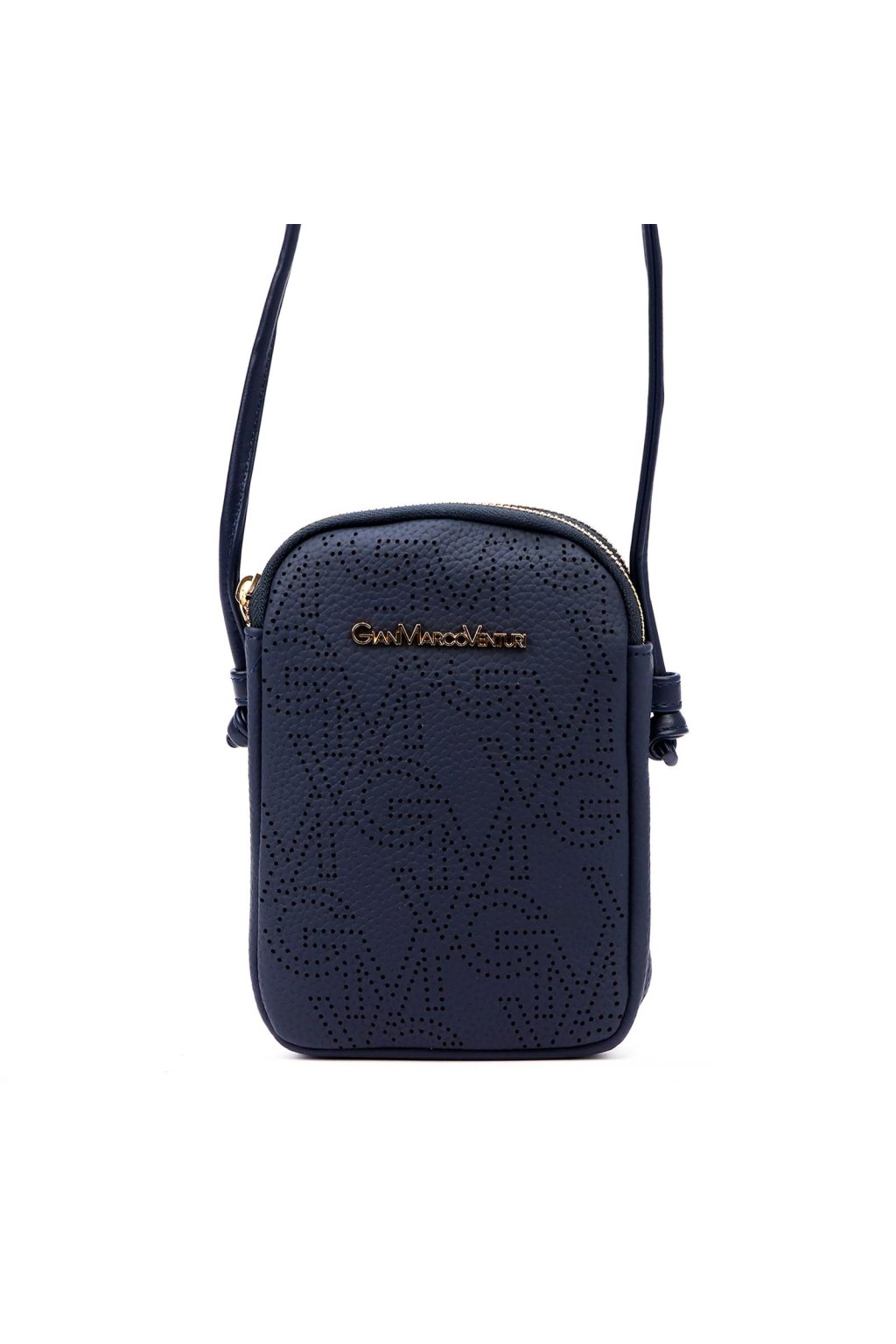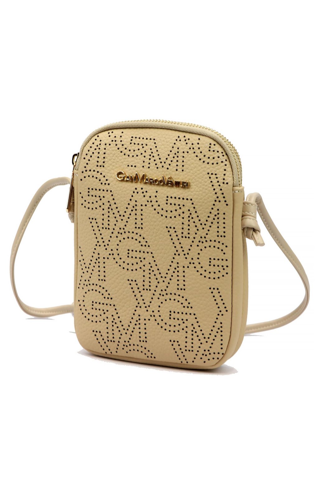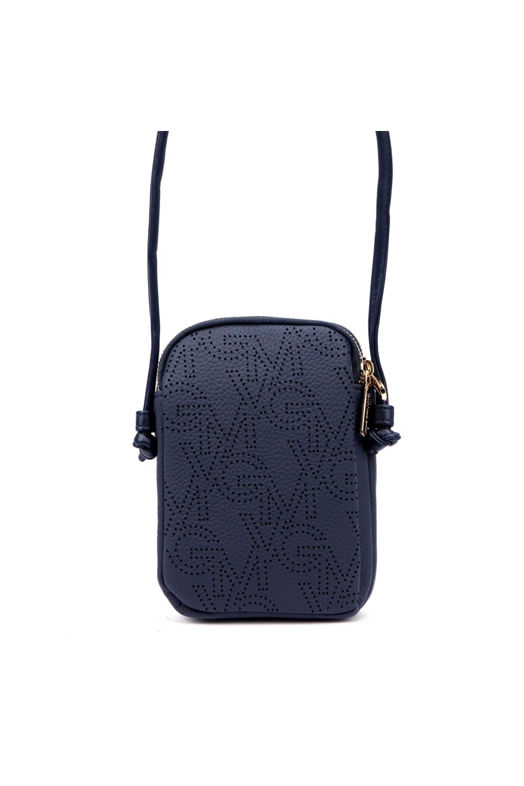 Malá dámská crossbody kabelka kompaktního obdélníkového tvaru se zaoblenými rohy. Uzavírání na dva samostatné zipy umožňuje přehledné rozdělení obsahu do dvou oddílů. Přední stranu zdobí perforovaný vzor s logem značky v kovovém provedení. Dlouhý, nastavitelný popruh umožňuje pohodlné nošení přes rameno i křížem přes tělo. Kovové detaily jsou ve zlatém tónu.