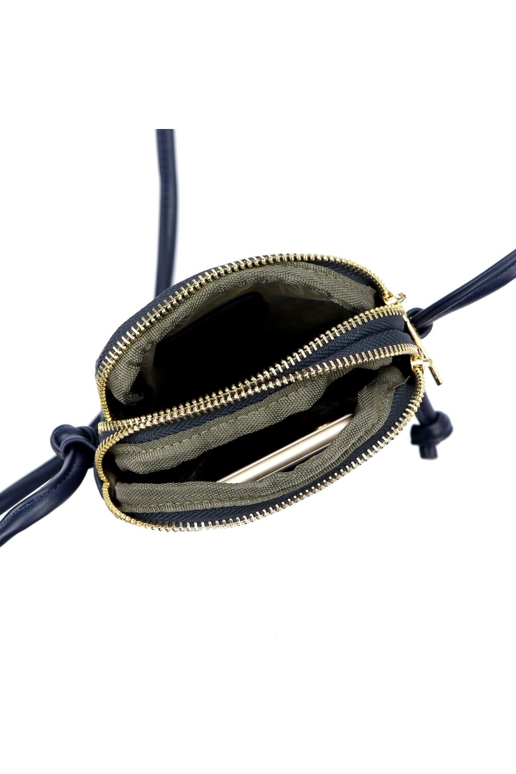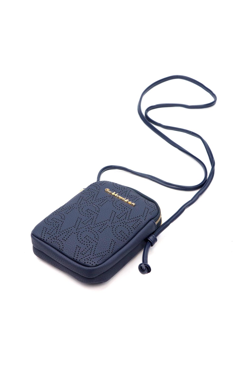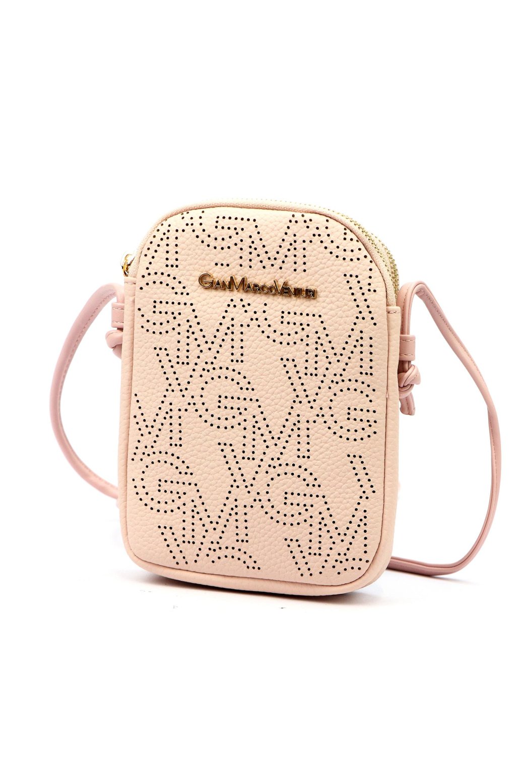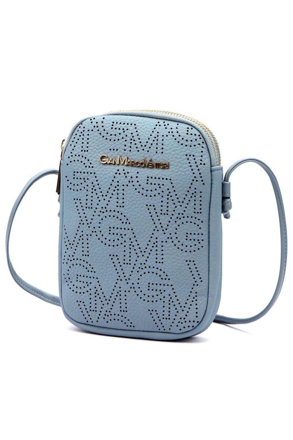 Malá dámská crossbody kabelka kompaktního obdélníkového tvaru se zaoblenými rohy. Uzavírání na dva samostatné zipy umožňuje přehledné rozdělení obsahu do dvou oddílů. Přední stranu zdobí perforovaný vzor s logem značky v kovovém provedení. Dlouhý, nastavitelný popruh umožňuje pohodlné nošení přes rameno i křížem přes tělo. Kovové detaily jsou ve zlatém tónu.
