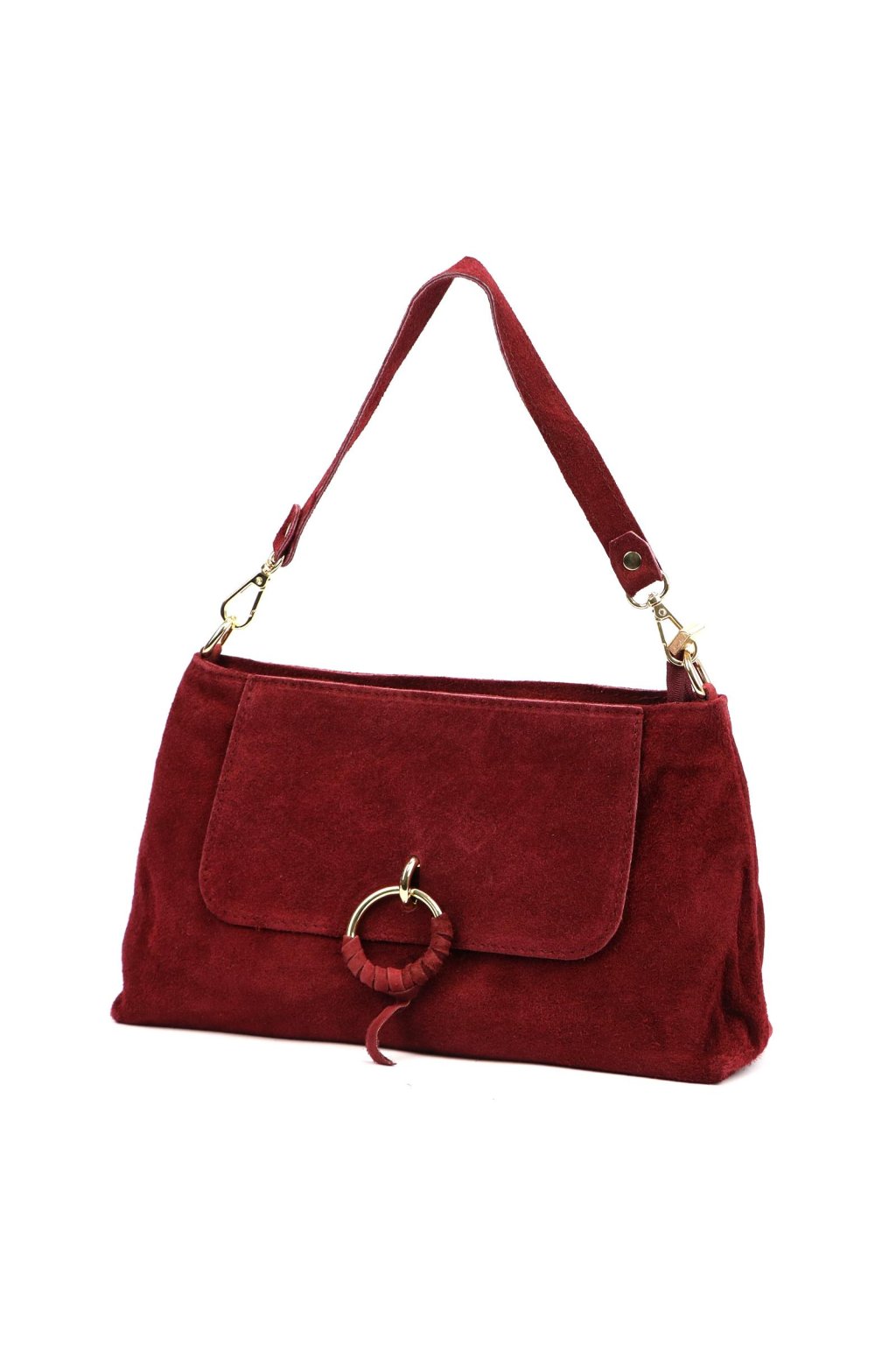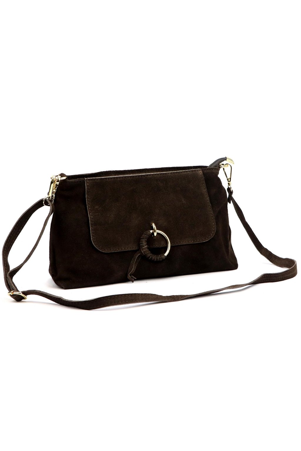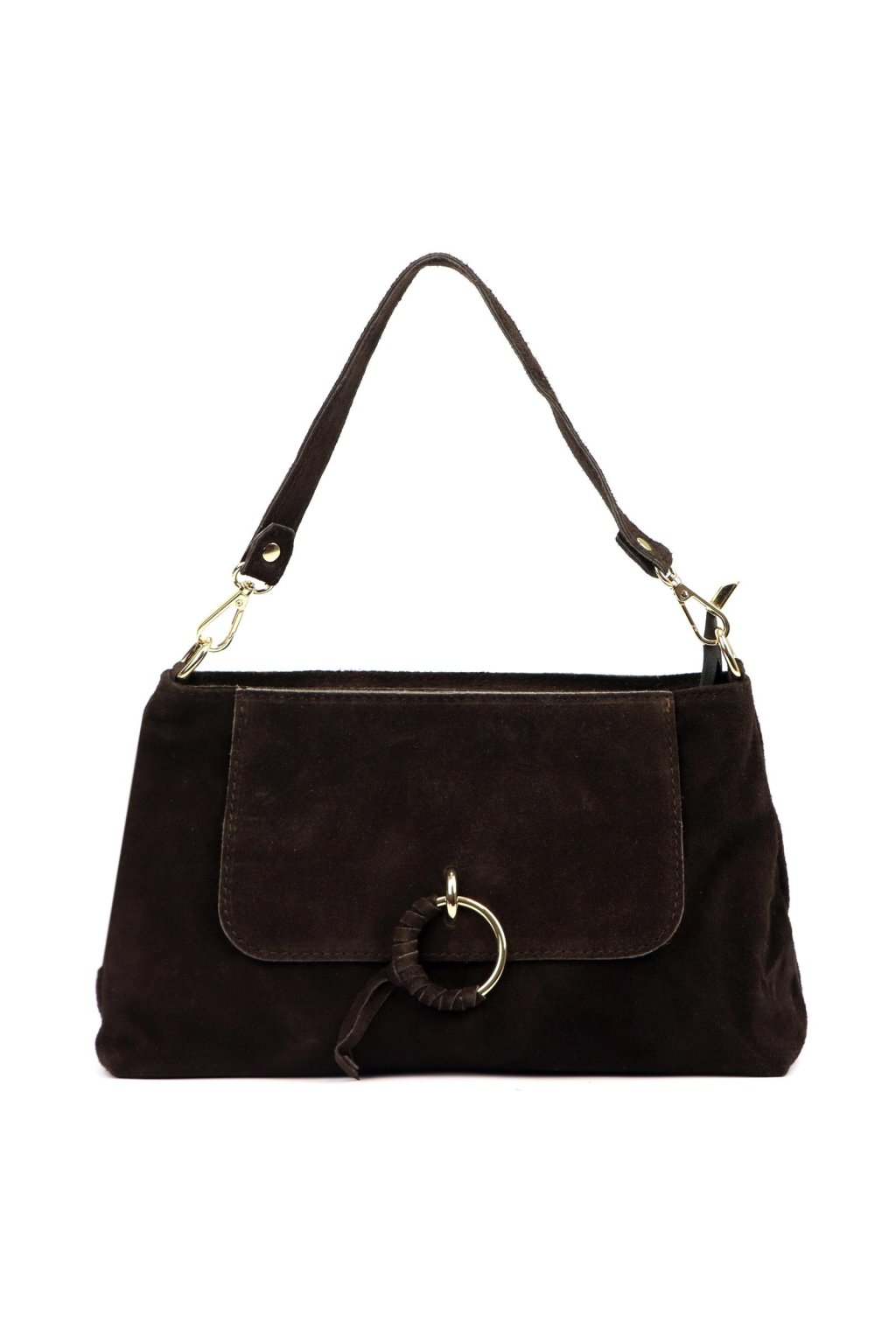 Elegantní dámská kabelka vyrobená z přírodní broušené kůže. Přední klopa je ozdobená kovovým kroužkem potaženým kůží, což dodává kabelce osobitý a moderní vzhled. Odnímatelné ucho umožňuje nošení v ruce i na rameni, a díky přiloženému dlouhému popruhu ji lze nosit i přes tělo.