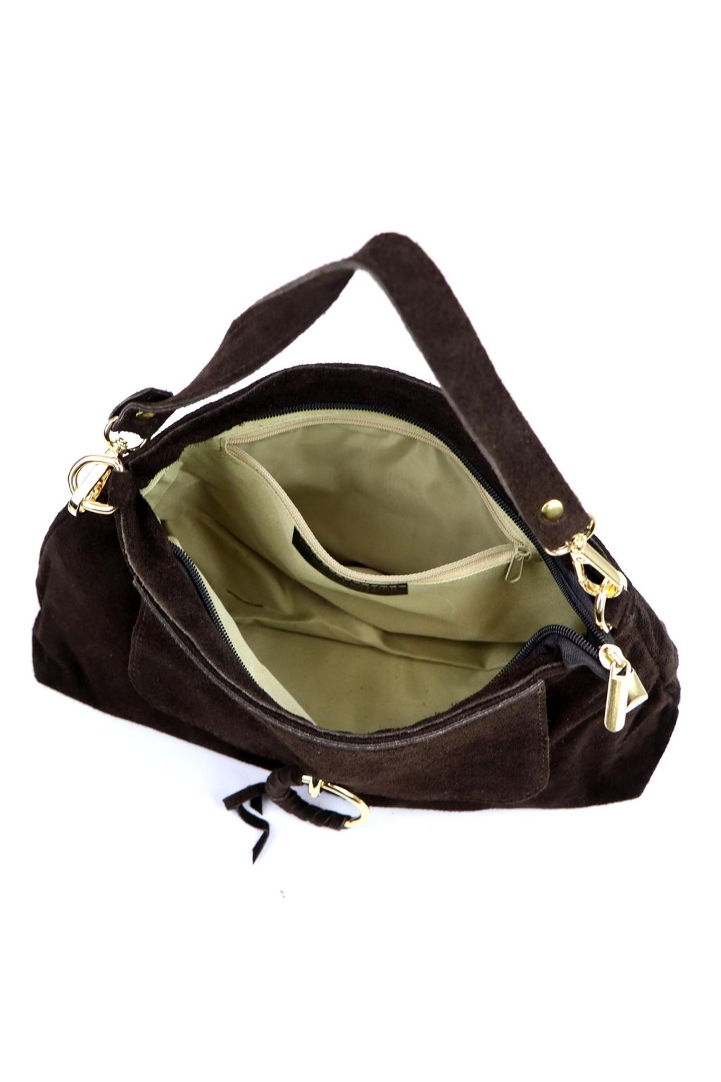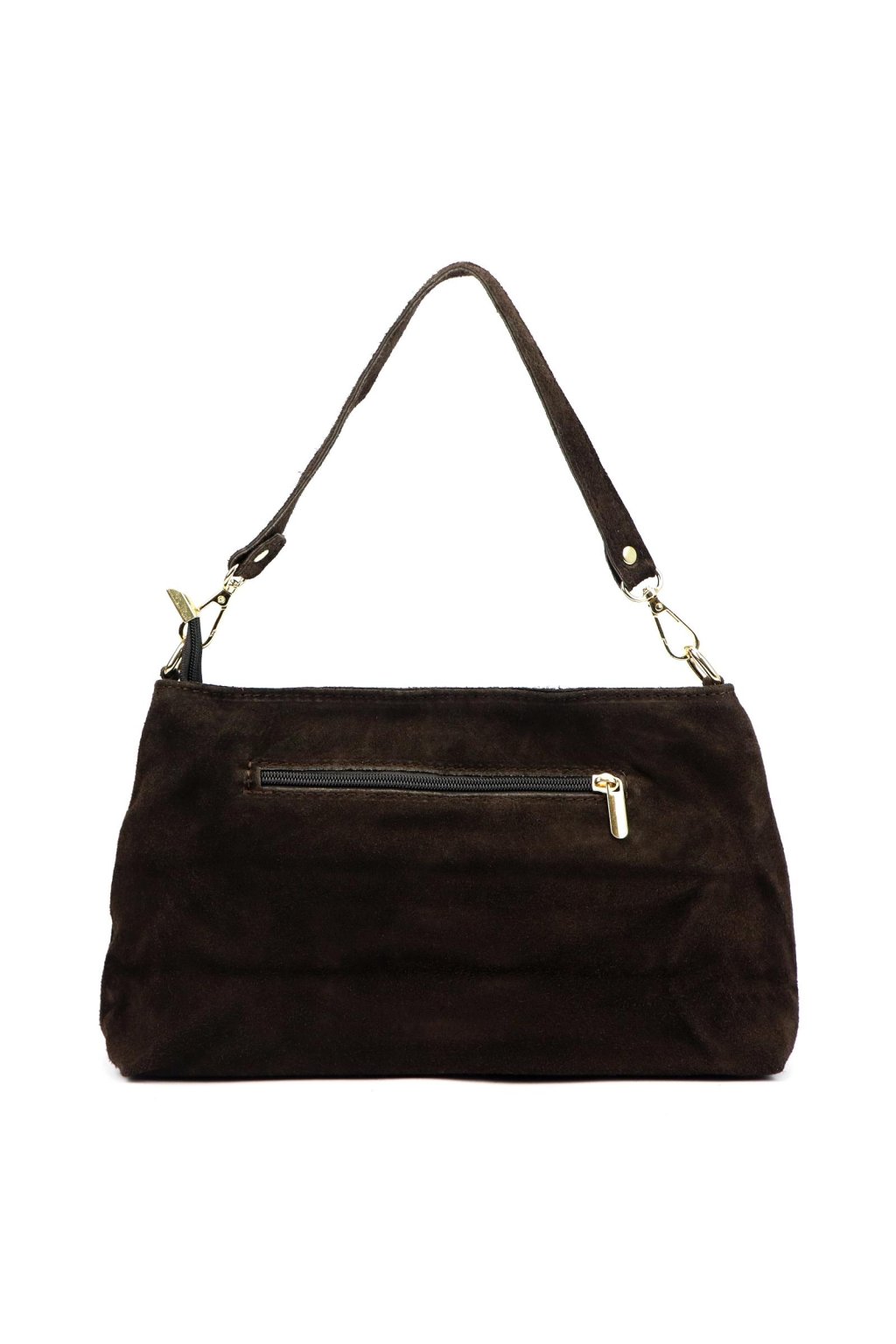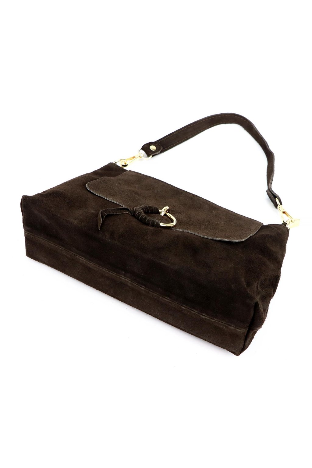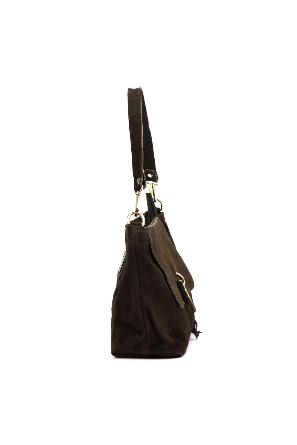 Elegantní dámská kabelka vyrobená z přírodní broušené kůže. Přední klopa je ozdobená kovovým kroužkem potaženým kůží, což dodává kabelce osobitý a moderní vzhled. Odnímatelné ucho umožňuje nošení v ruce i na rameni, a díky přiloženému dlouhému popruhu ji lze nosit i přes tělo.