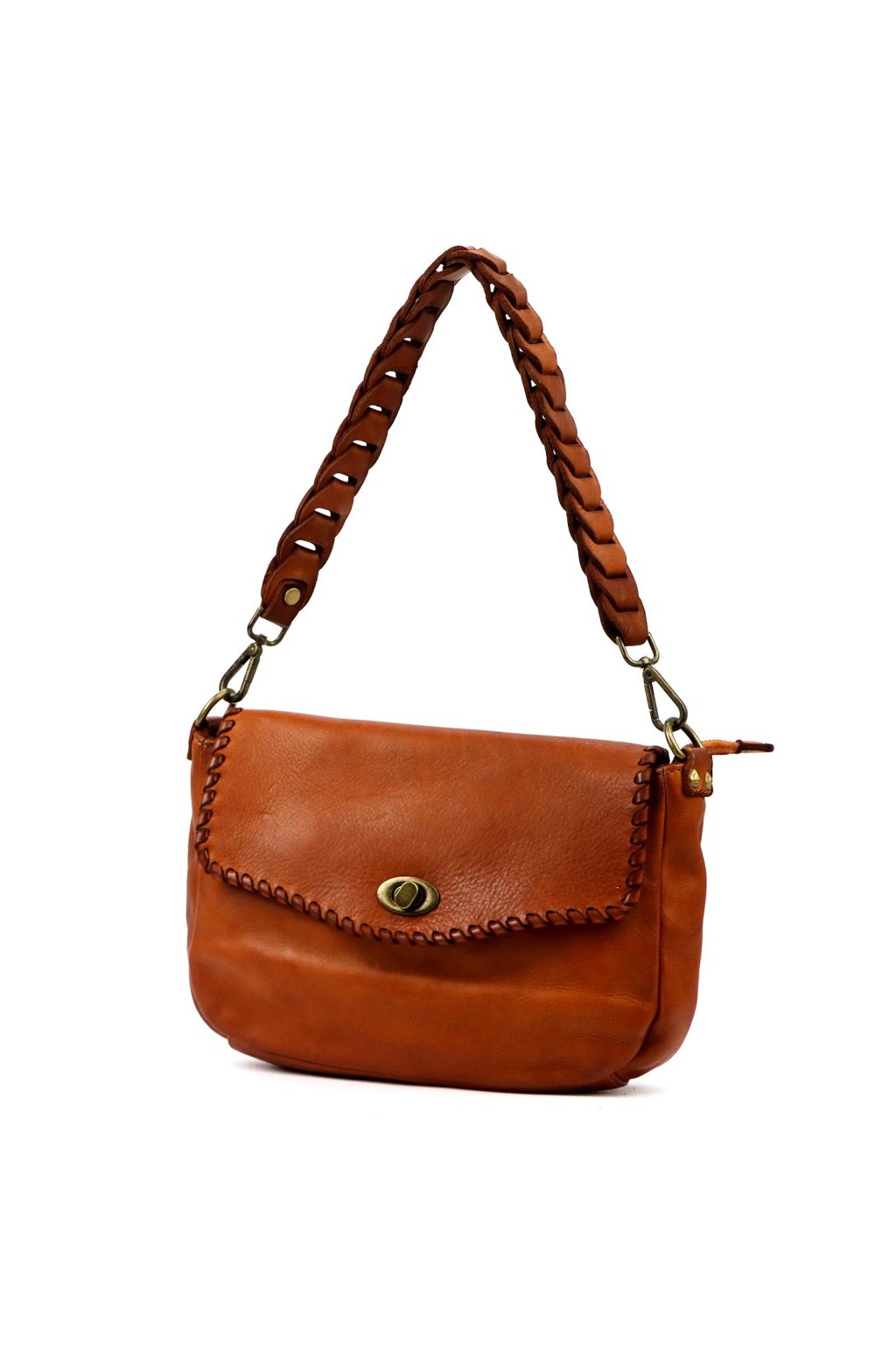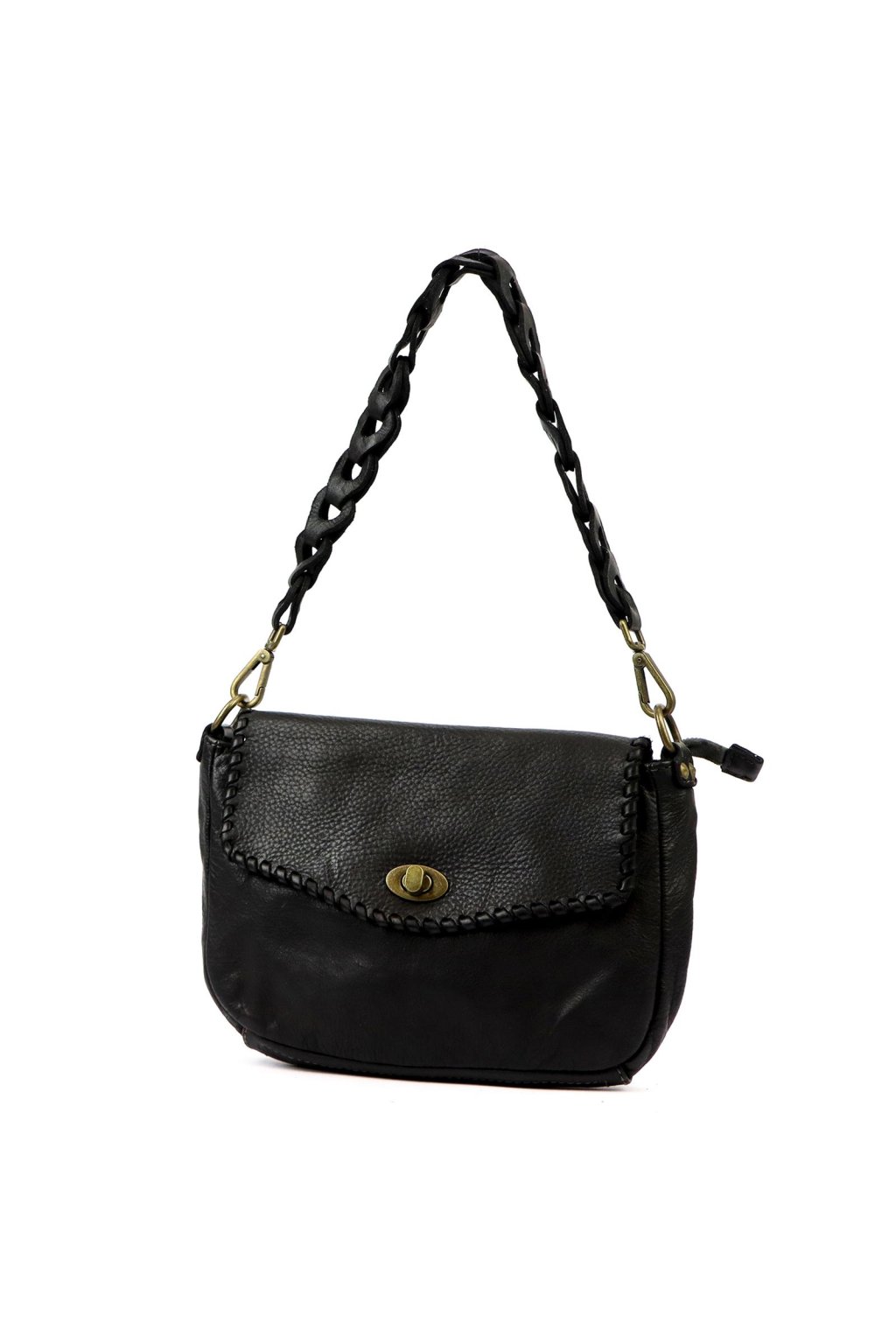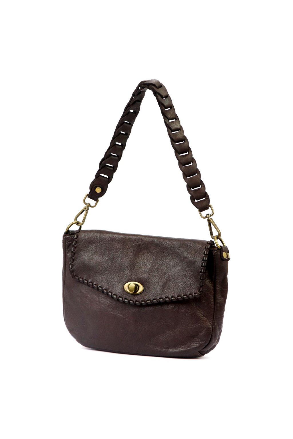 Tato elegantní kabelka z pravé kůže zaujme svým originálním vzhledem, který podtrhuje ručně pletené ucho a výrazné prošití klopy. Otočné kovové zapínání v bronzovém tónu dodává vintage charakter a zároveň zajišťuje praktické a bezpečné uzavření kabelky.