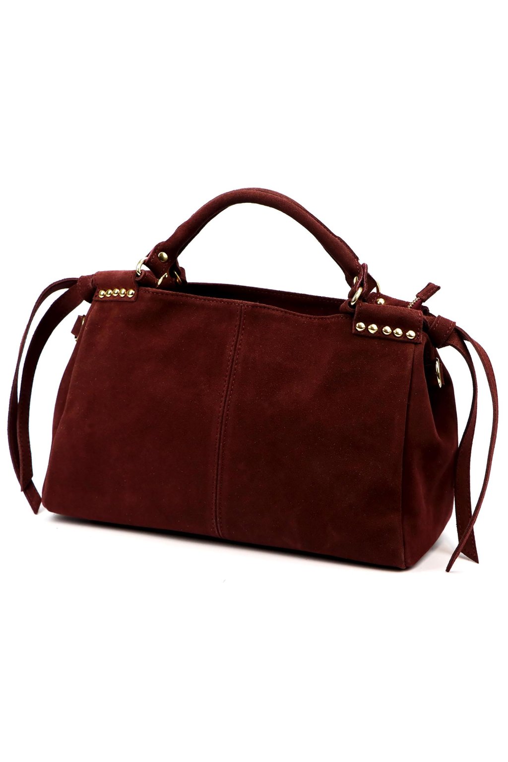 Pravý semiš s podšívkou, kovové doplňky ve zlatém odstínu.