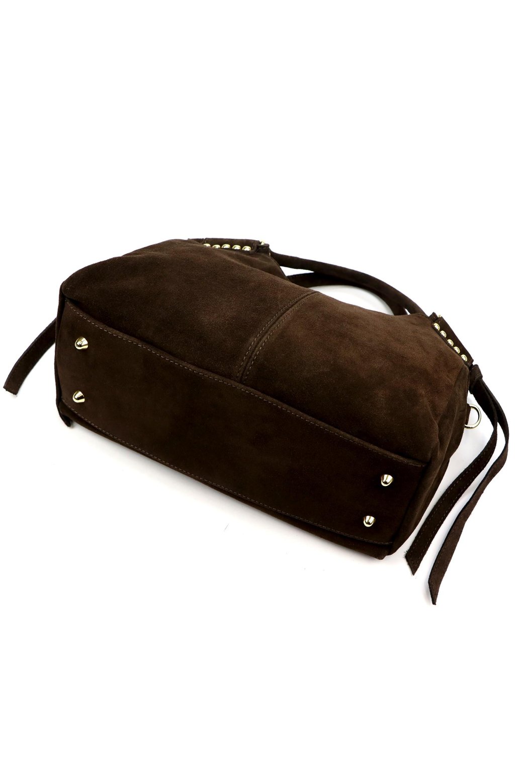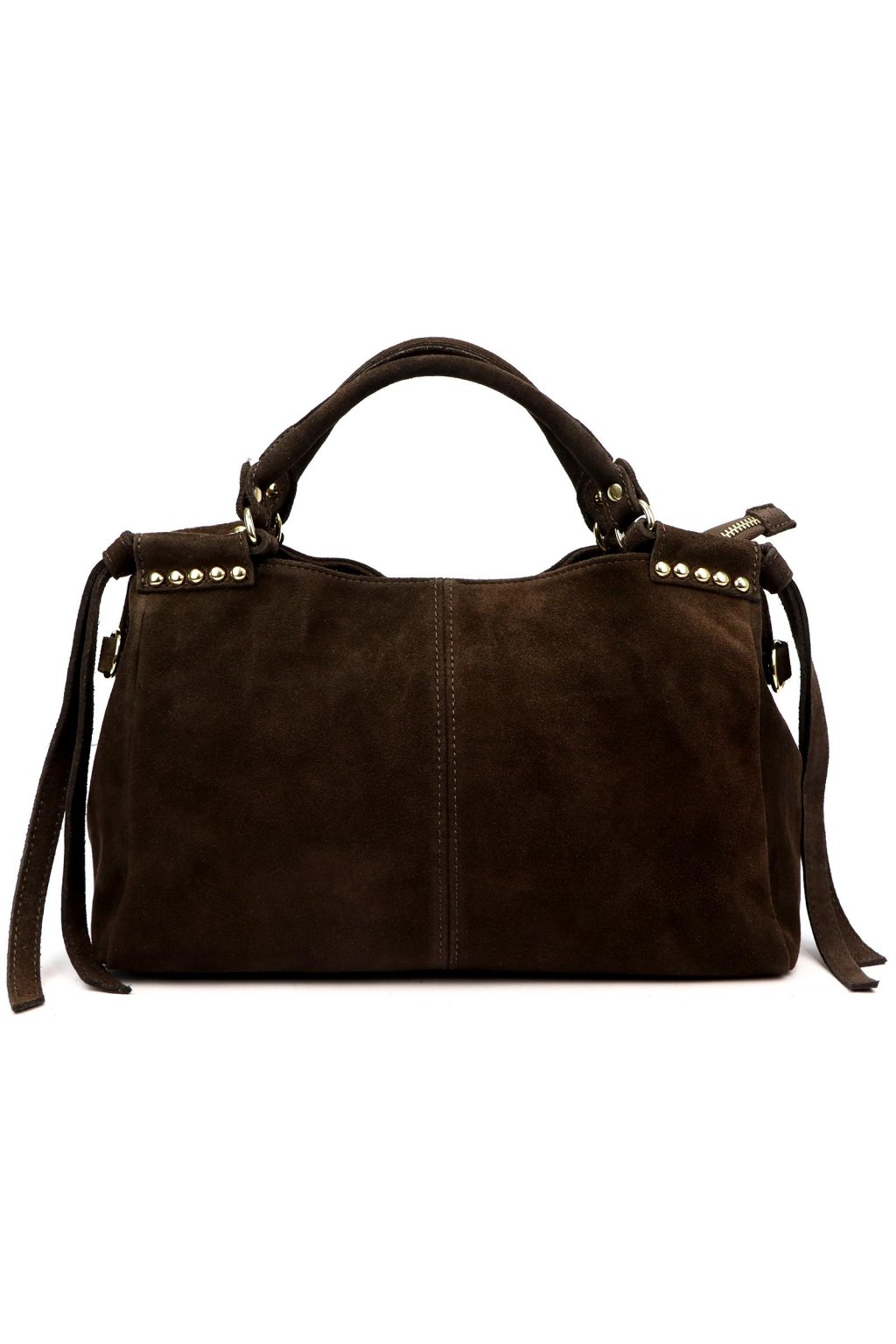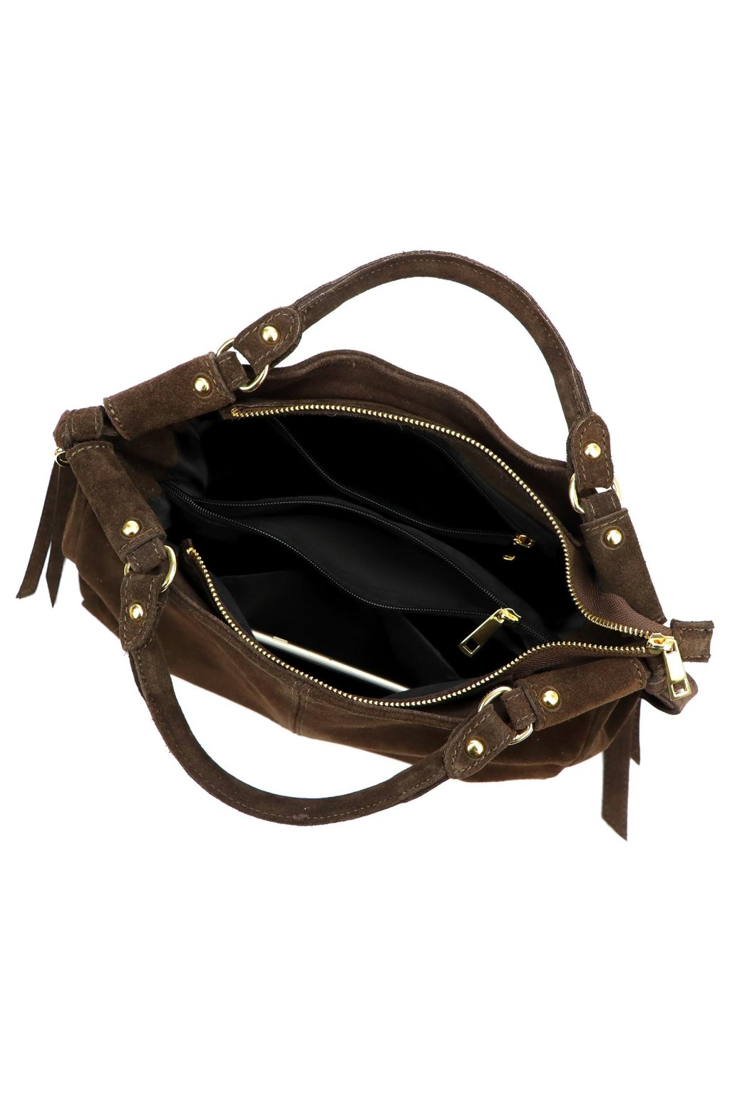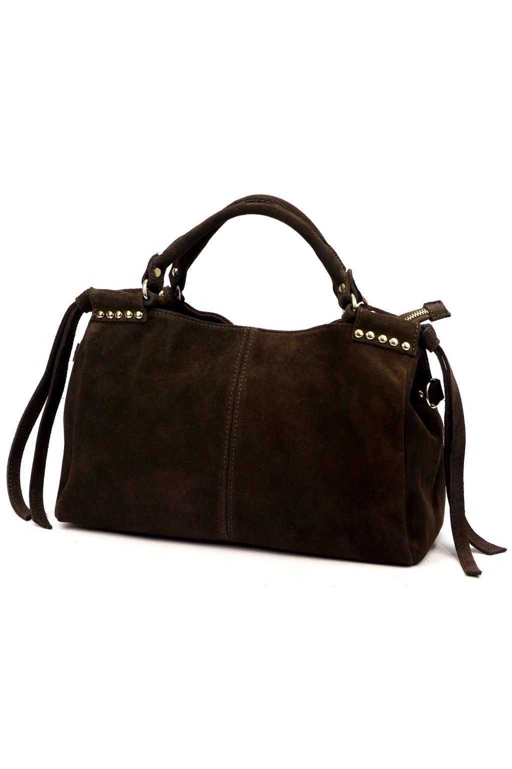 dámská kožená kabelka, semišová kabelka s třásněmi, kabelka se zlatými detaily, elegantní hnědá kabelka, prostorná kabelka do práce, kabelka s dvojitou komorou, crossbody kabelka