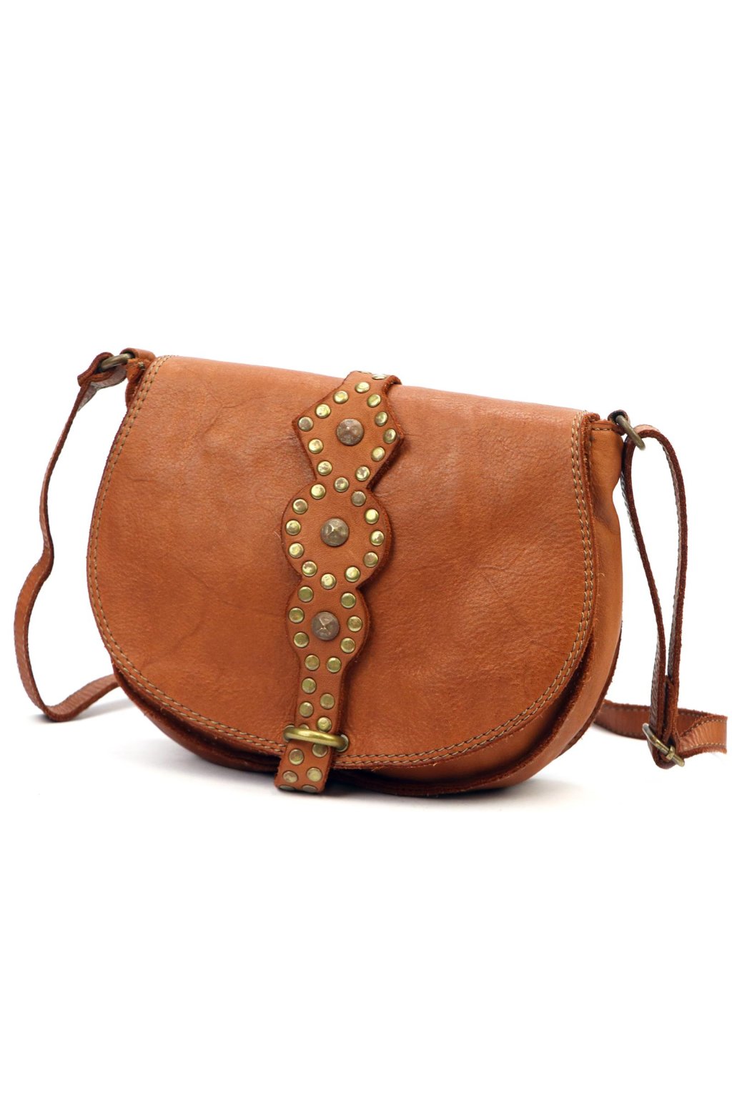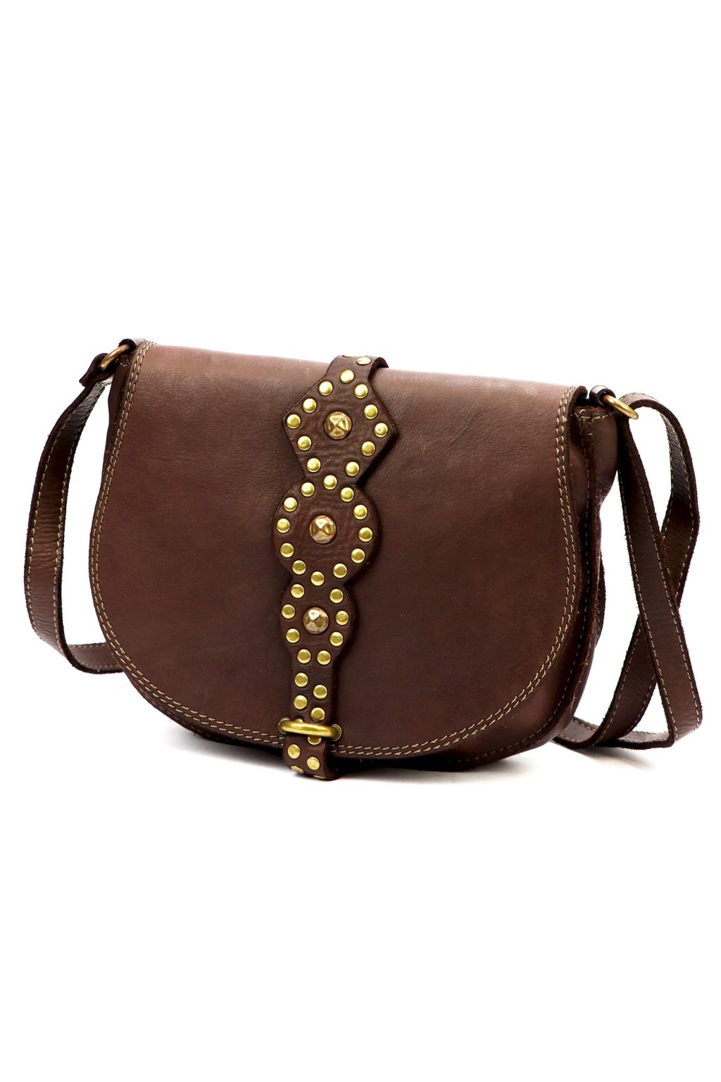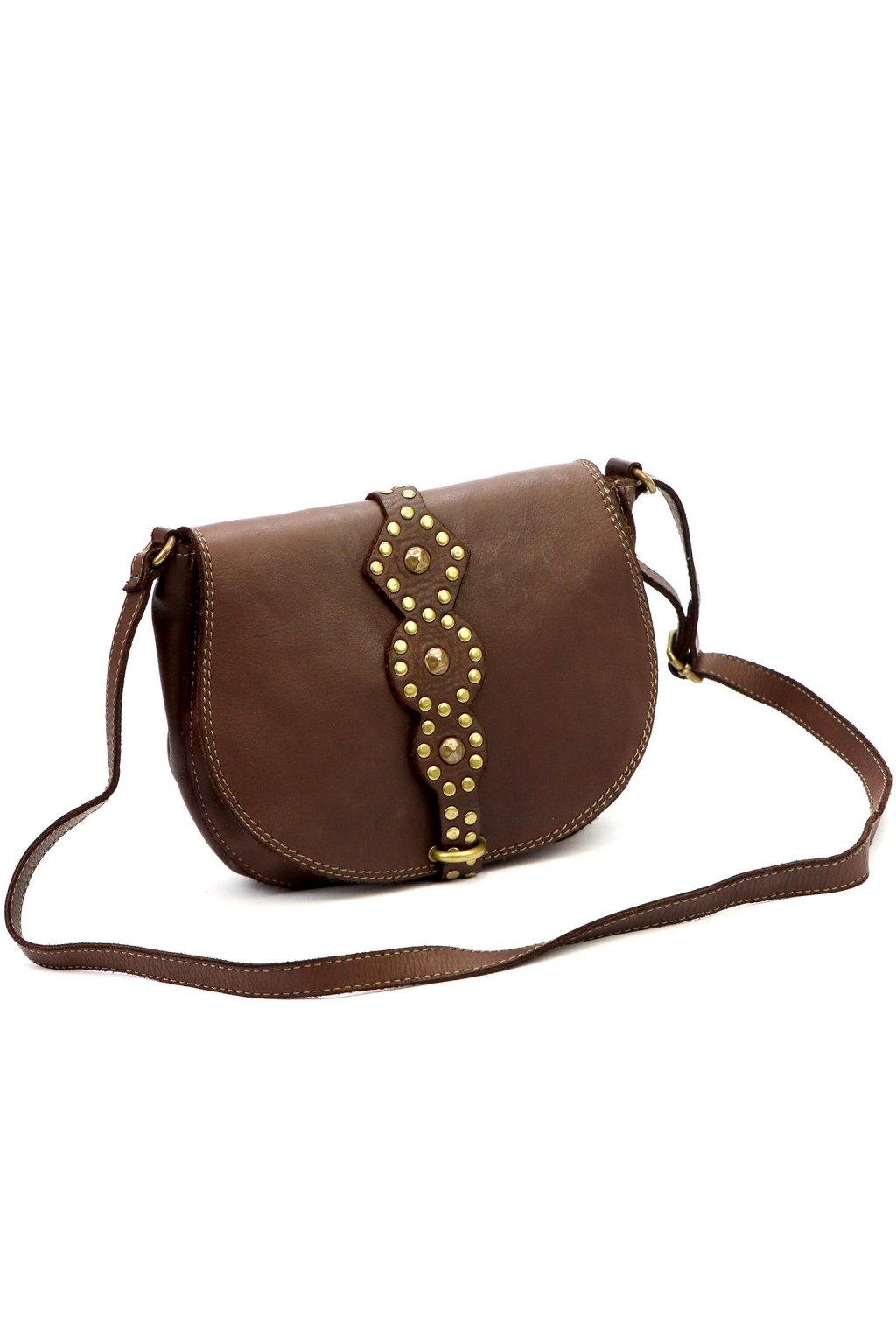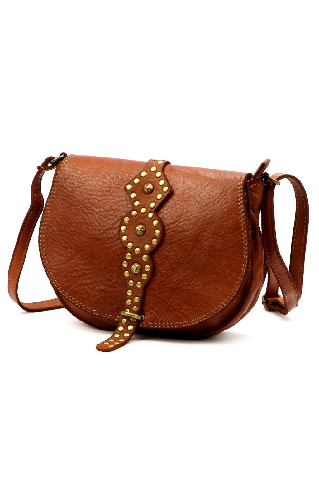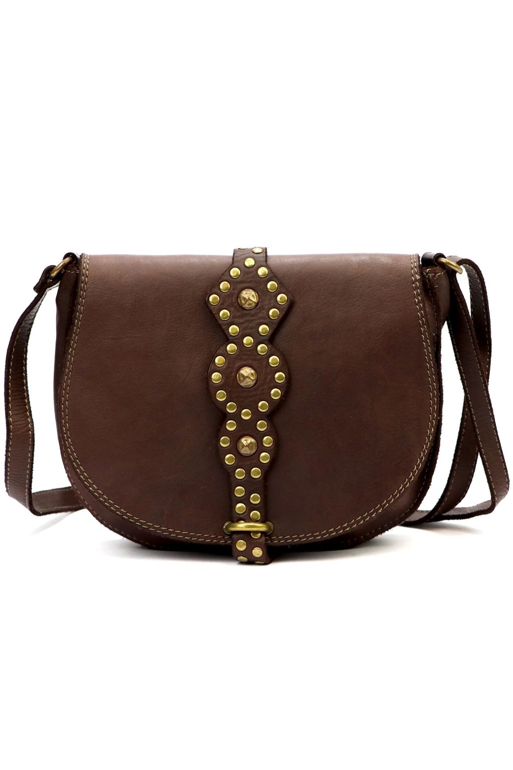 originální kabelka – přírodní kůže – cvočky – dekorativní řemínek – pevné prošívání – nastavitelný popruh – crossbody styl – stylový akcent – robustní zpracování – klopa s uzavíráním