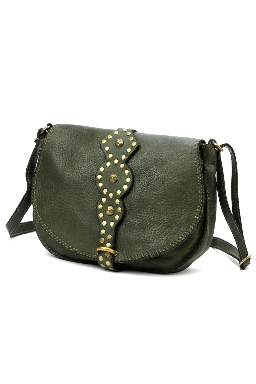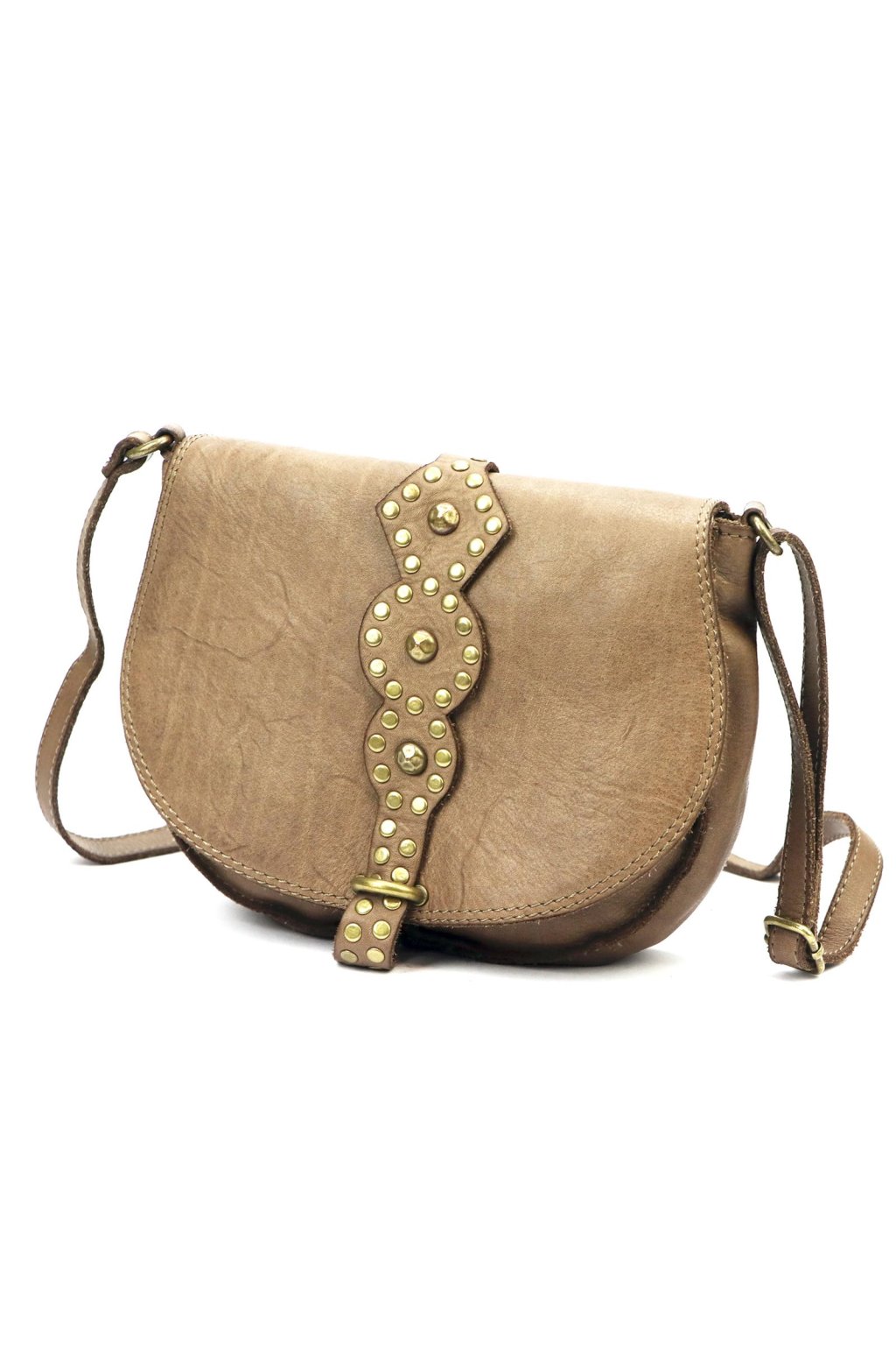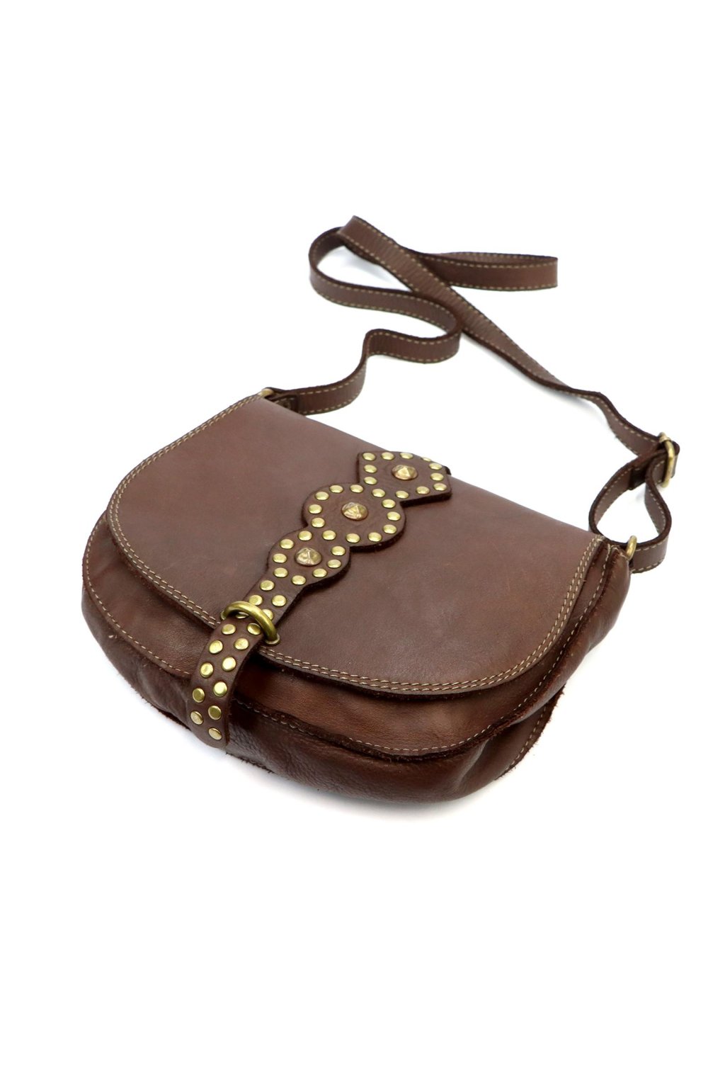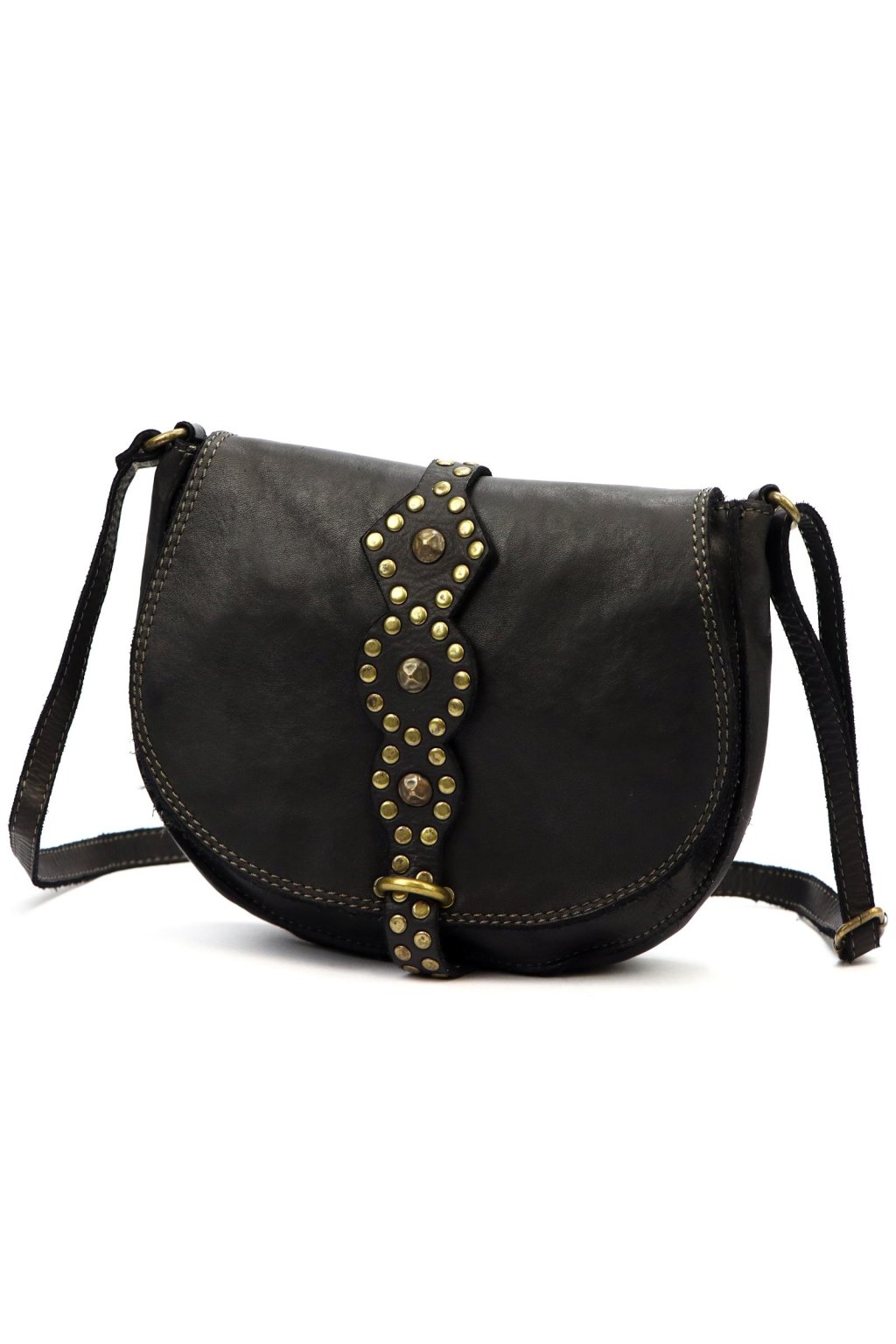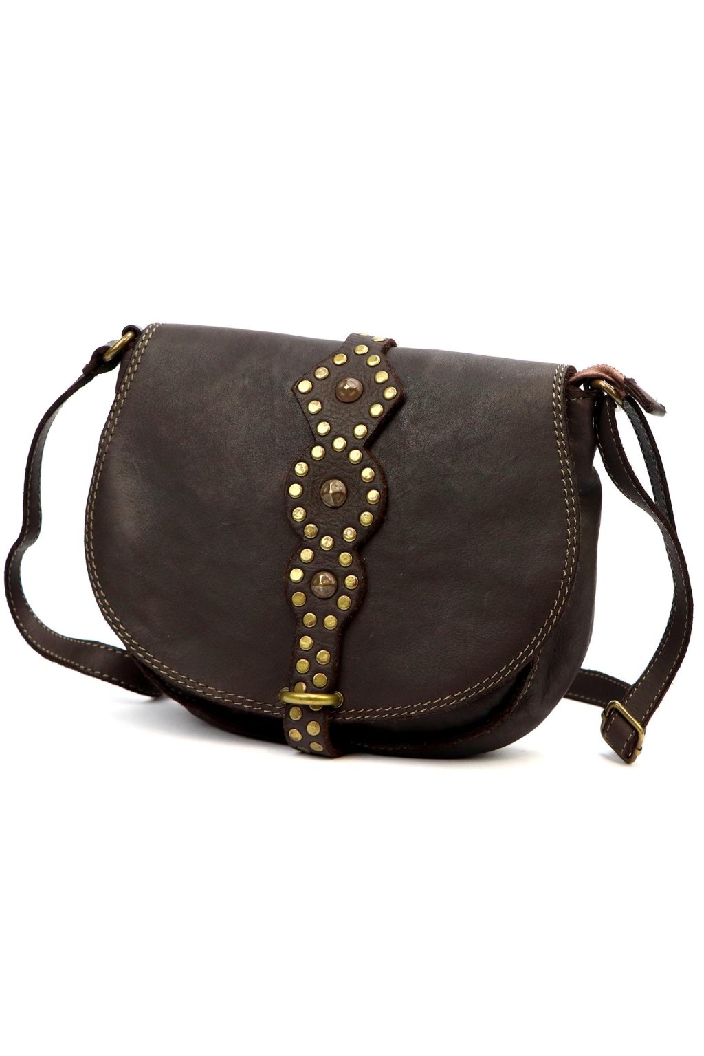 originální kabelka – přírodní kůže – cvočky – dekorativní řemínek – pevné prošívání – nastavitelný popruh – crossbody styl – stylový akcent – robustní zpracování – klopa s uzavíráním