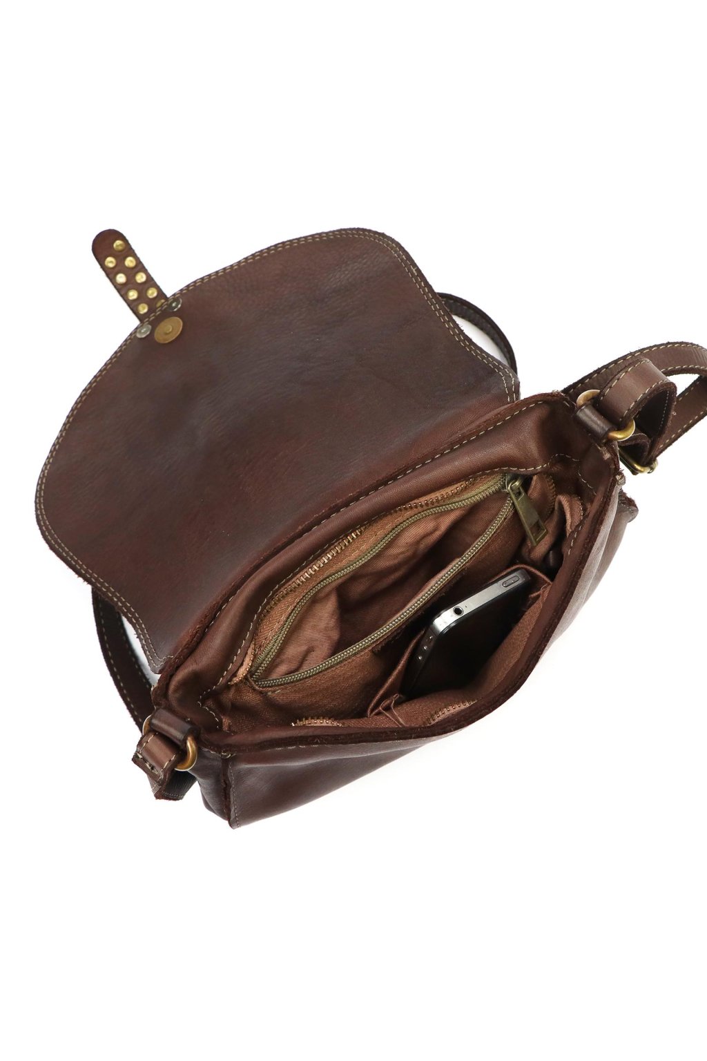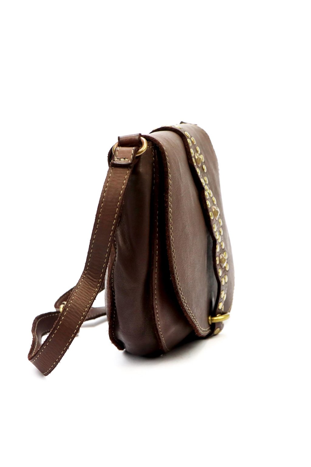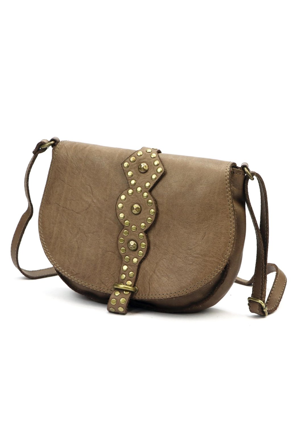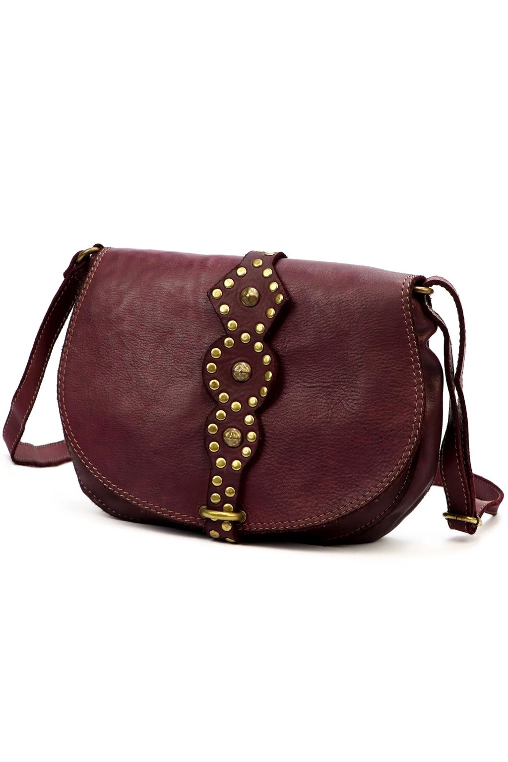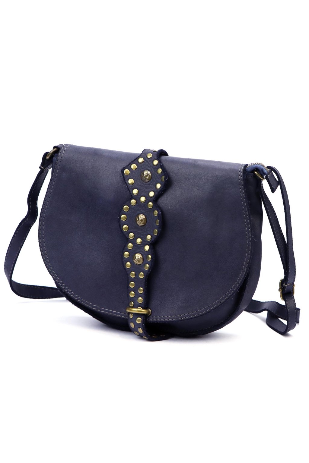 originální kabelka – přírodní kůže – cvočky – dekorativní řemínek – pevné prošívání – nastavitelný popruh – crossbody styl – stylový akcent – robustní zpracování – klopa s uzavíráním