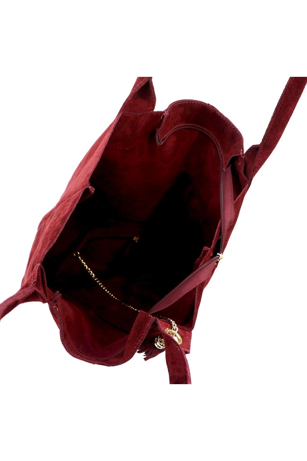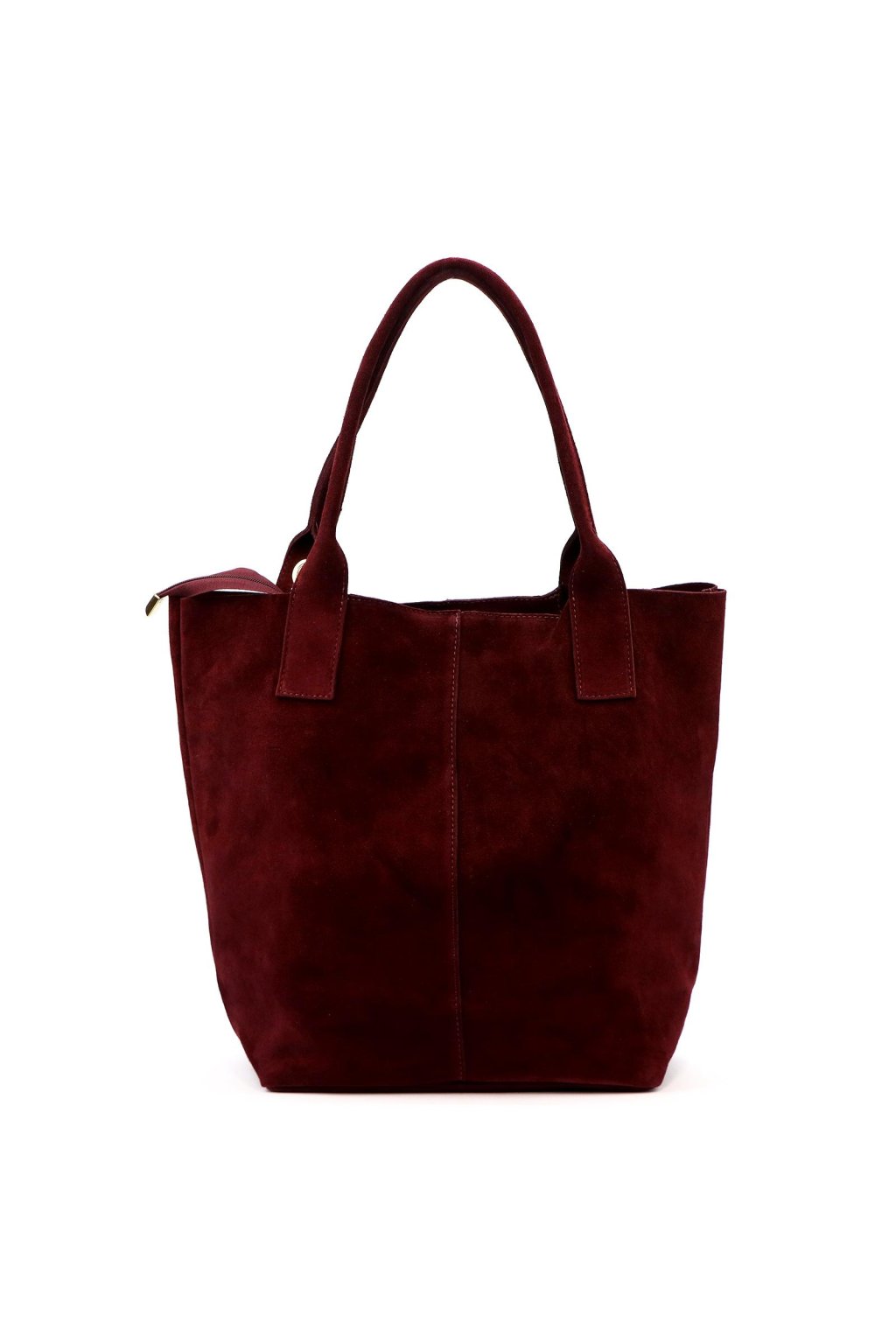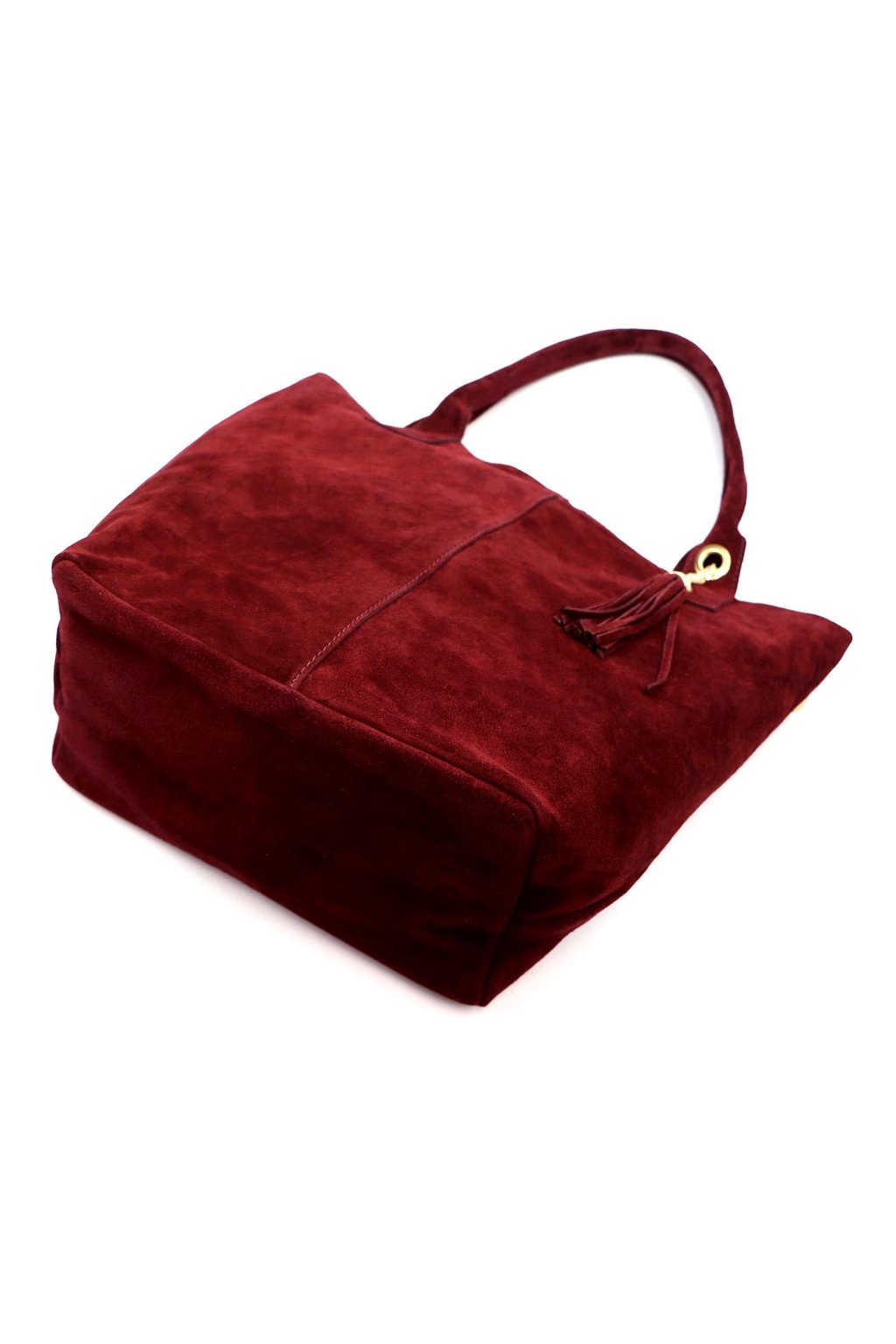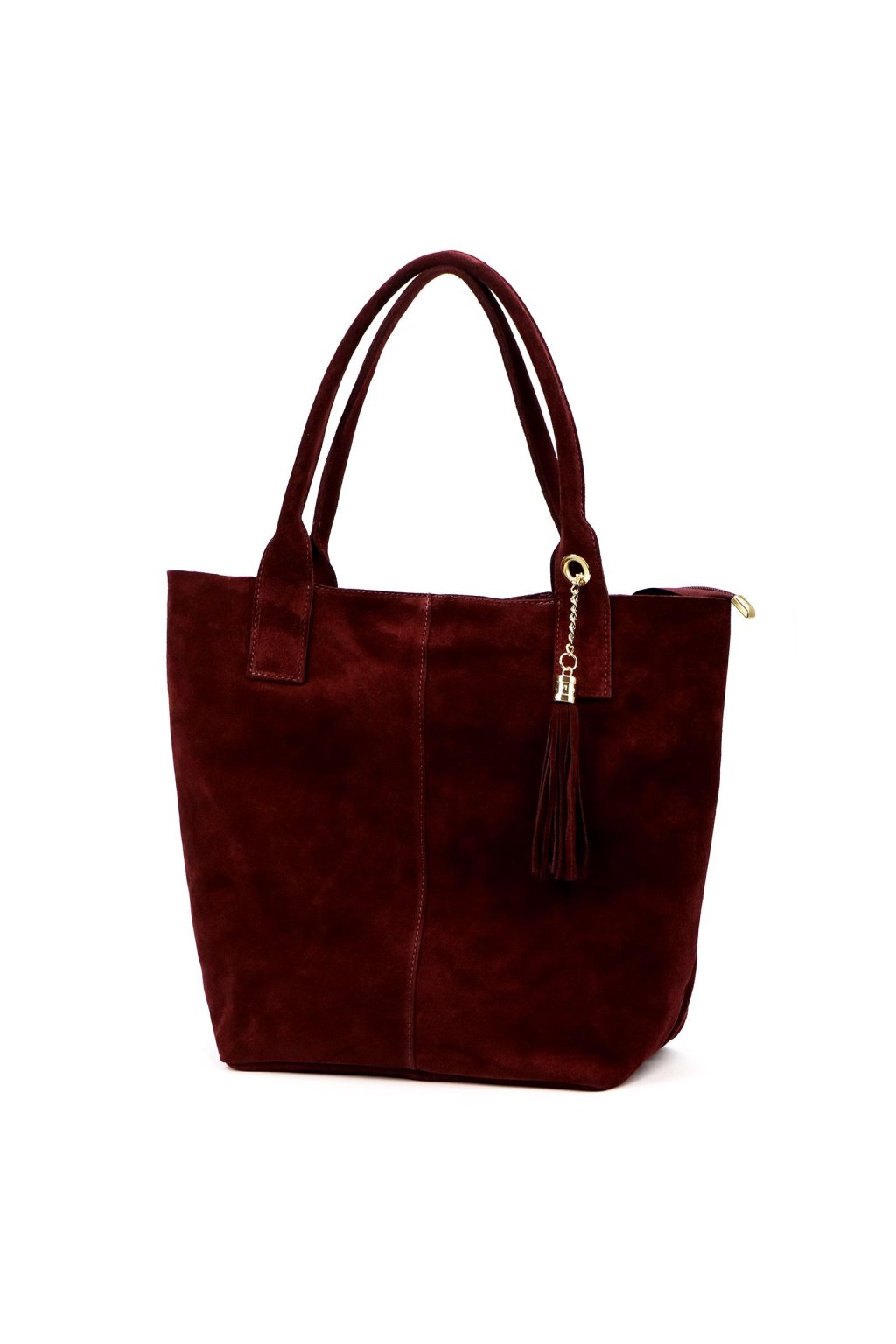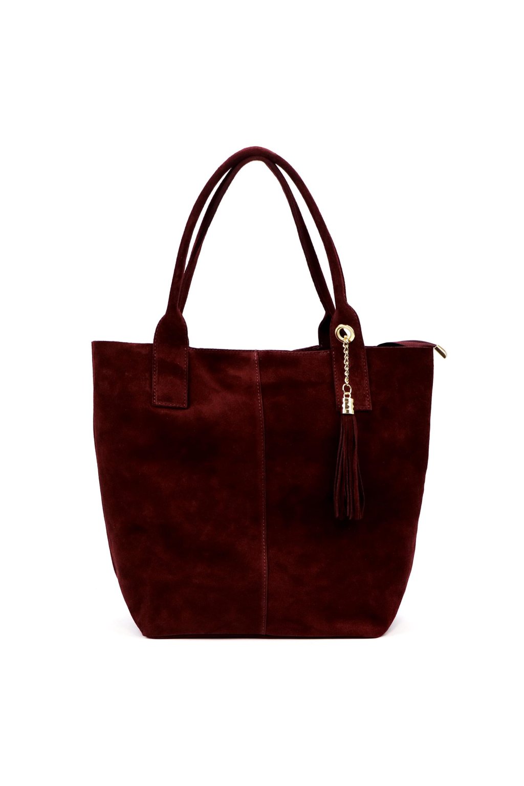 kožená kabelka shopper, kabelka s třásní, vínová broušená kabelka, tmavě hnědá shopper taška, elegantní dámská kabelka z broušené kůže, prostorná kabelka přes rameno.