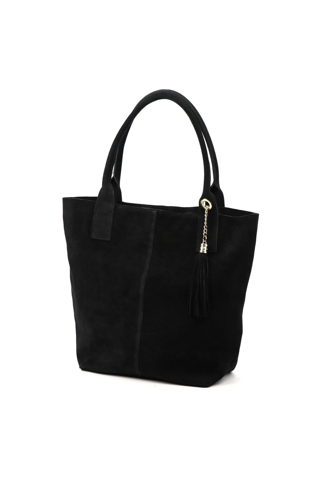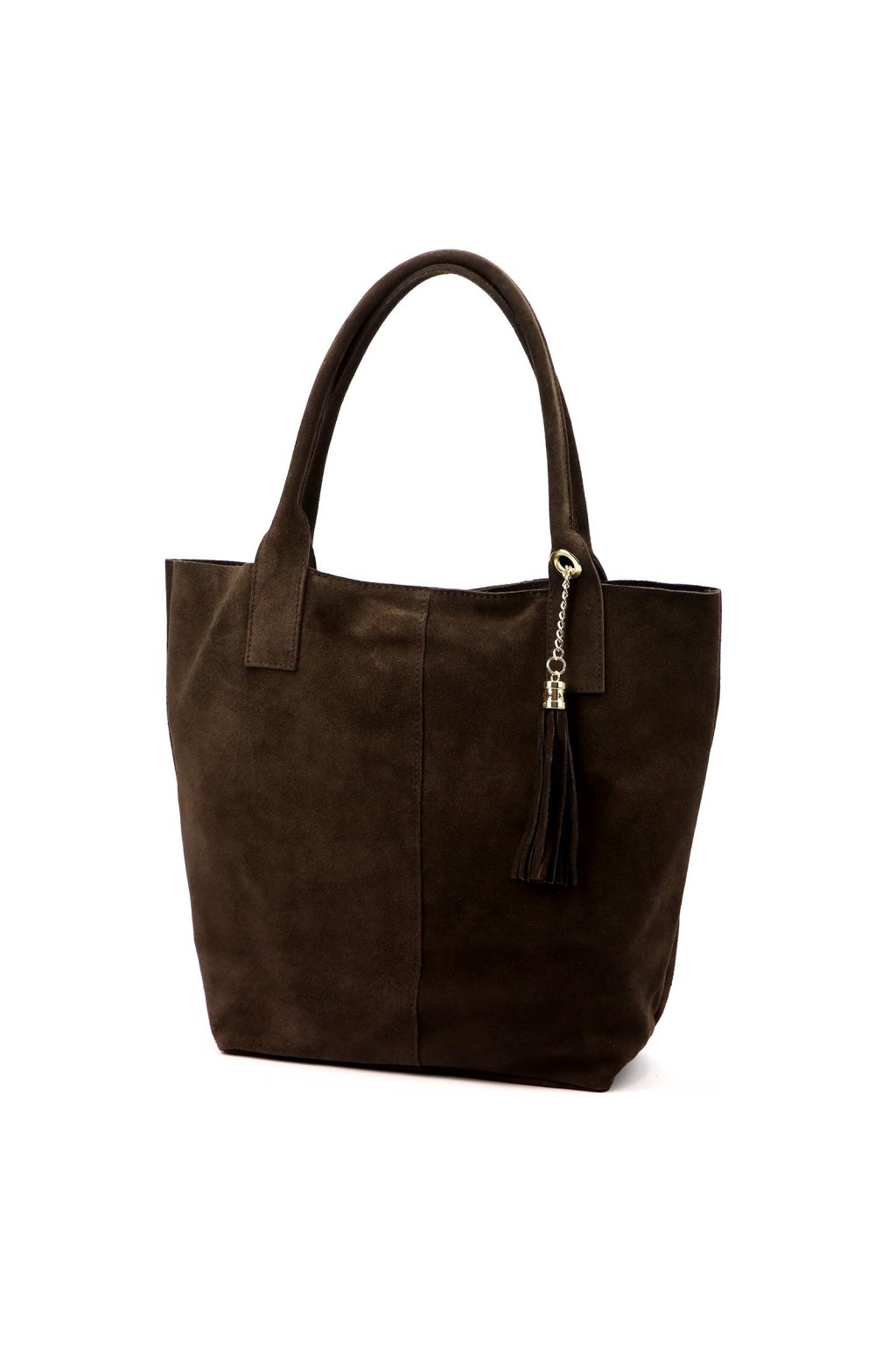 Elegantní shopper kabelka z broušené kůže zaujme svým měkkým tvarem a příjemným sametovým povrchem. Styl doplňuje zlatý řetízek s dekorativní třásní, který dodává celému modelu ženský a noblesní nádech. Praktická a přitom stylová – ideální pro každodenní nošení.