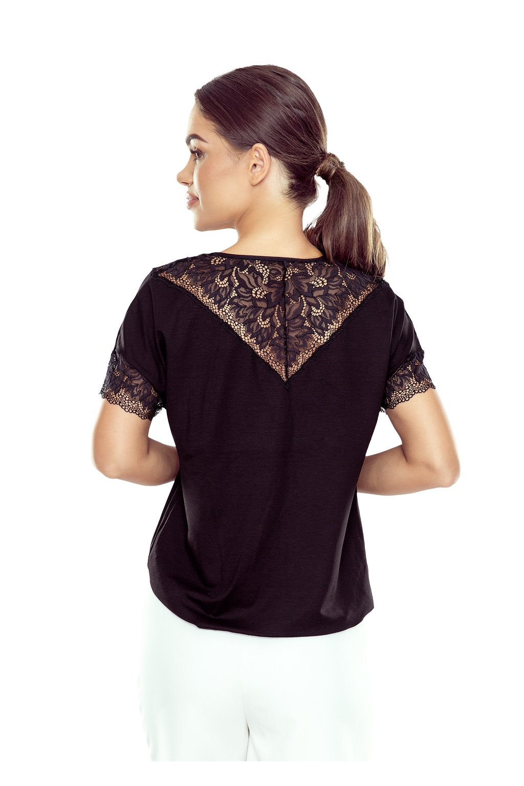 Elegantní halenka s krátkým rukávem, která spojuje jednoduchý střih s výrazným krajkovým detailem. Přední i zadní díl je doplněn krajkovou vsadkou ve tvaru jemného „V“, která působí ženským a upraveným dojmem, aniž by byla příliš výrazná. Rukávy jsou zakončeny krajkou s plochým okrajem. Díky viskózovému materiálu je halenka měkká, splývavá a pohodlná pro celodenní nošení. Vhodná jak do pracovního prostředí, tak pro večernější stylizace.