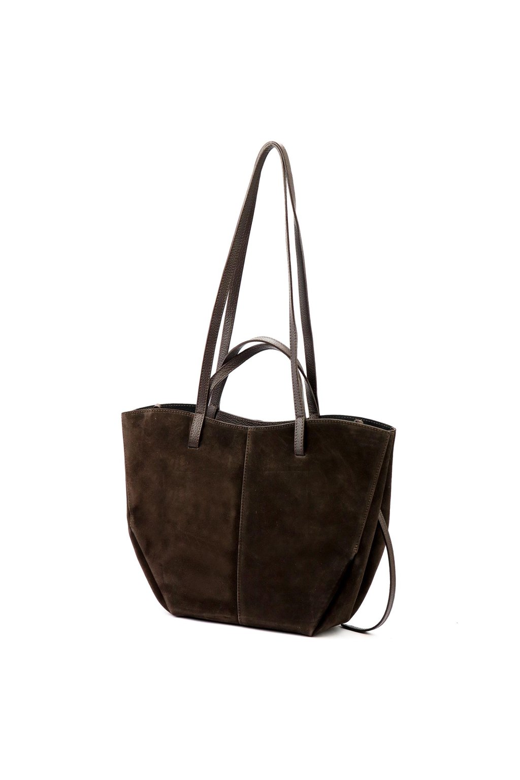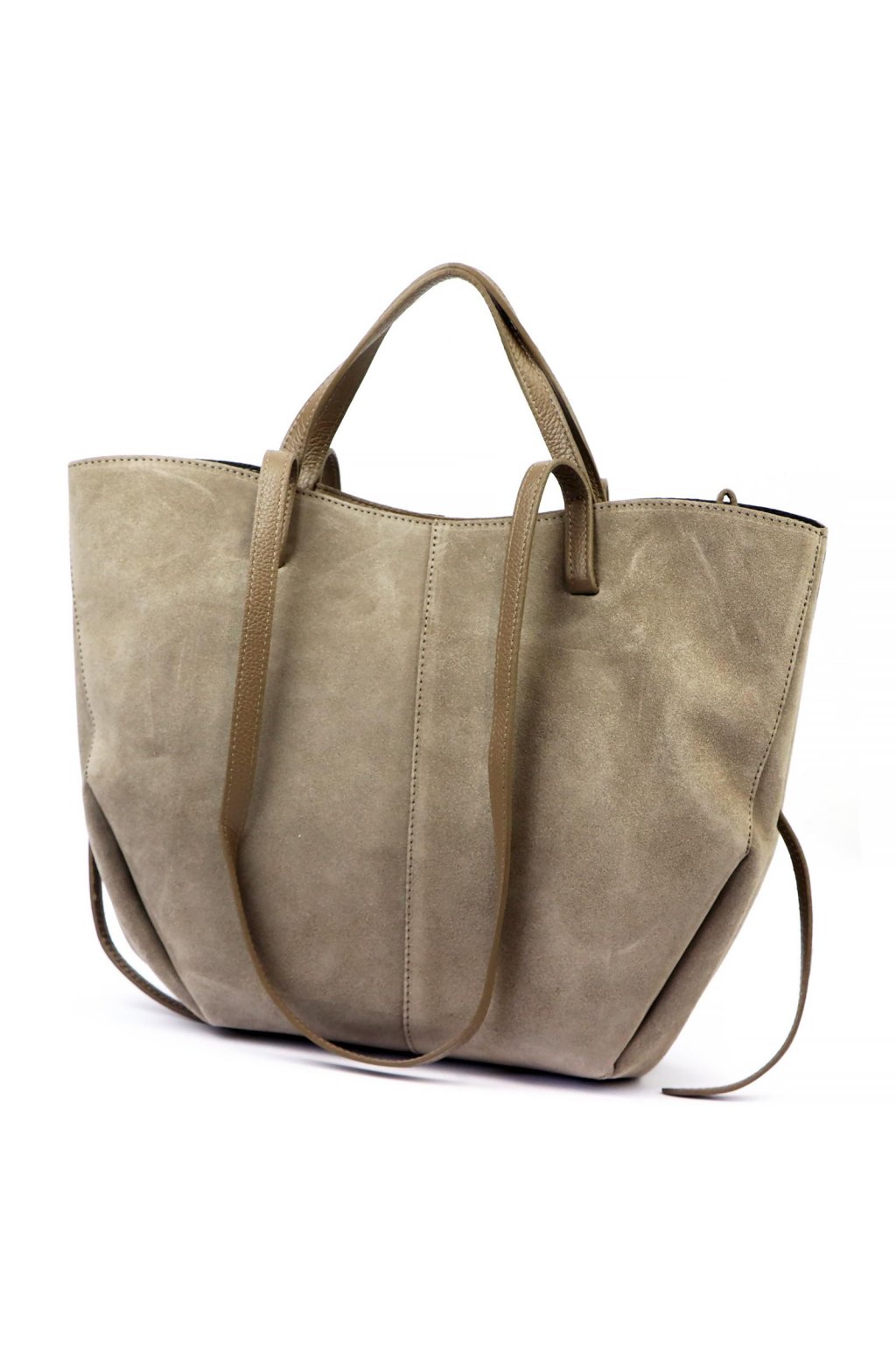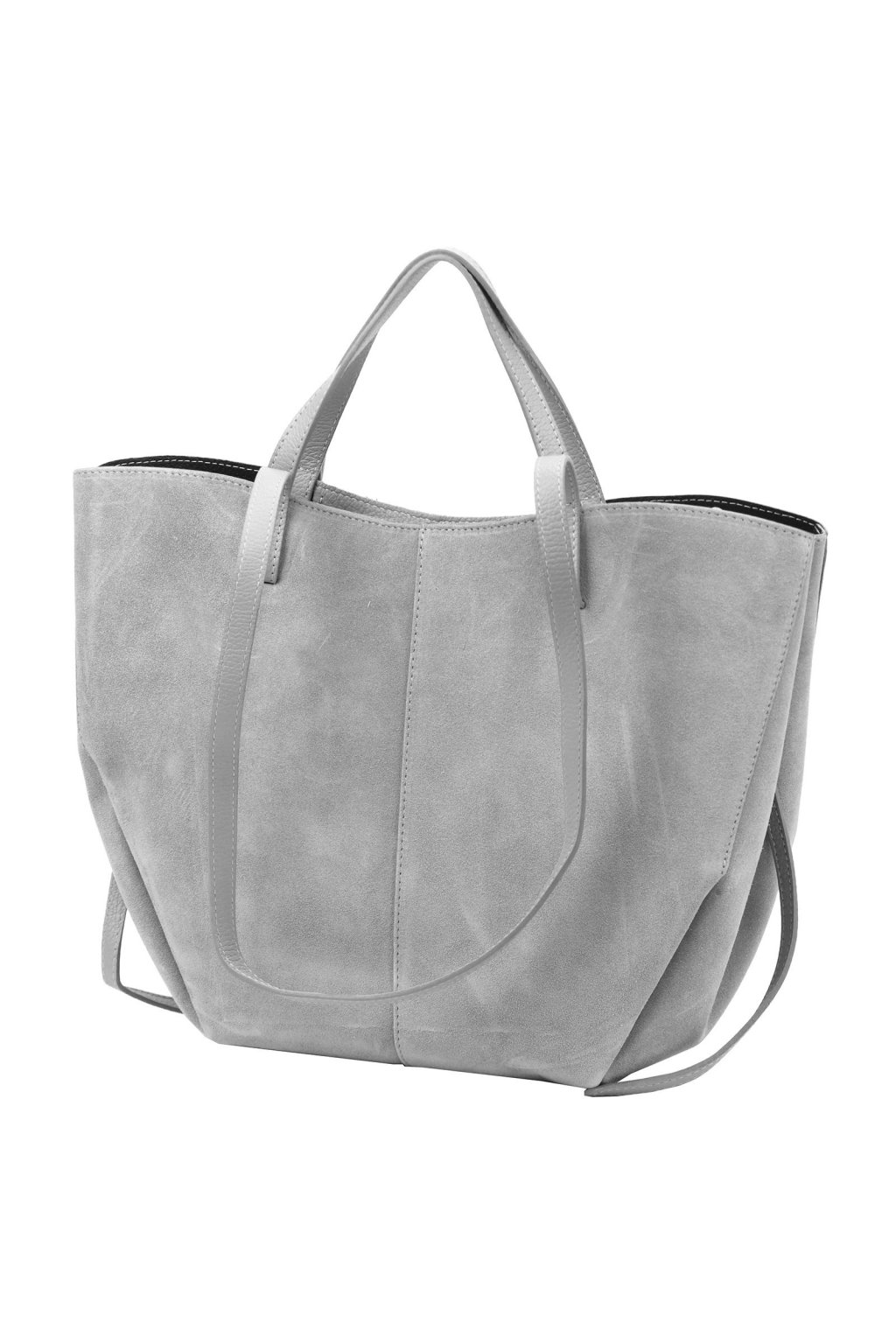 shopper kabelka – světle šedá – kašmírový odstín – broušená kůže – minimalistický styl – pohodlné uši – nadčasový tvar – každodenní elegance – prostorná kabelka – jemný sametový vzhled