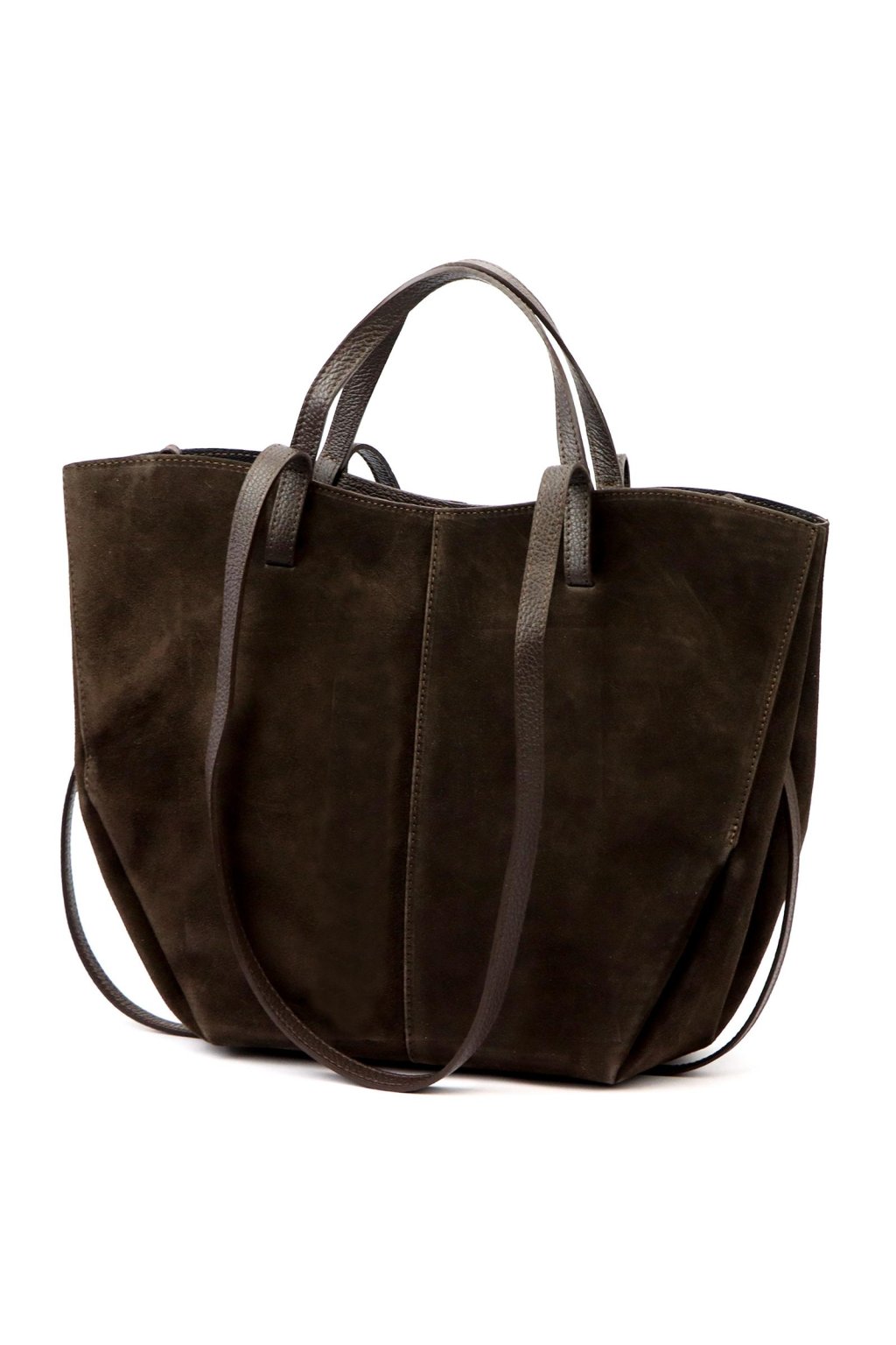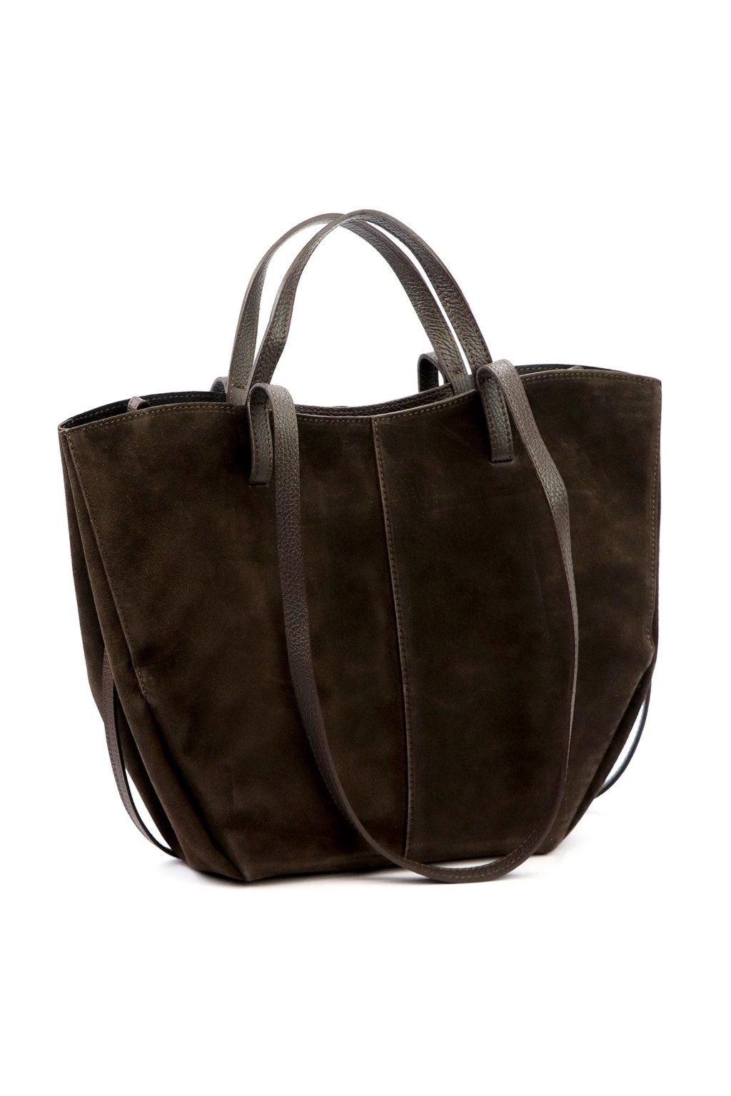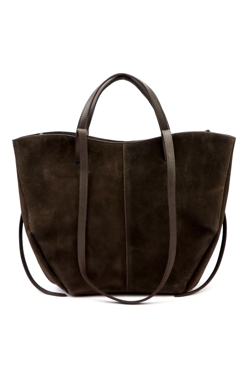 shopper kabelka – světle šedá – kašmírový odstín – broušená kůže – minimalistický styl – pohodlné uši – nadčasový tvar – každodenní elegance – prostorná kabelka – jemný sametový vzhled