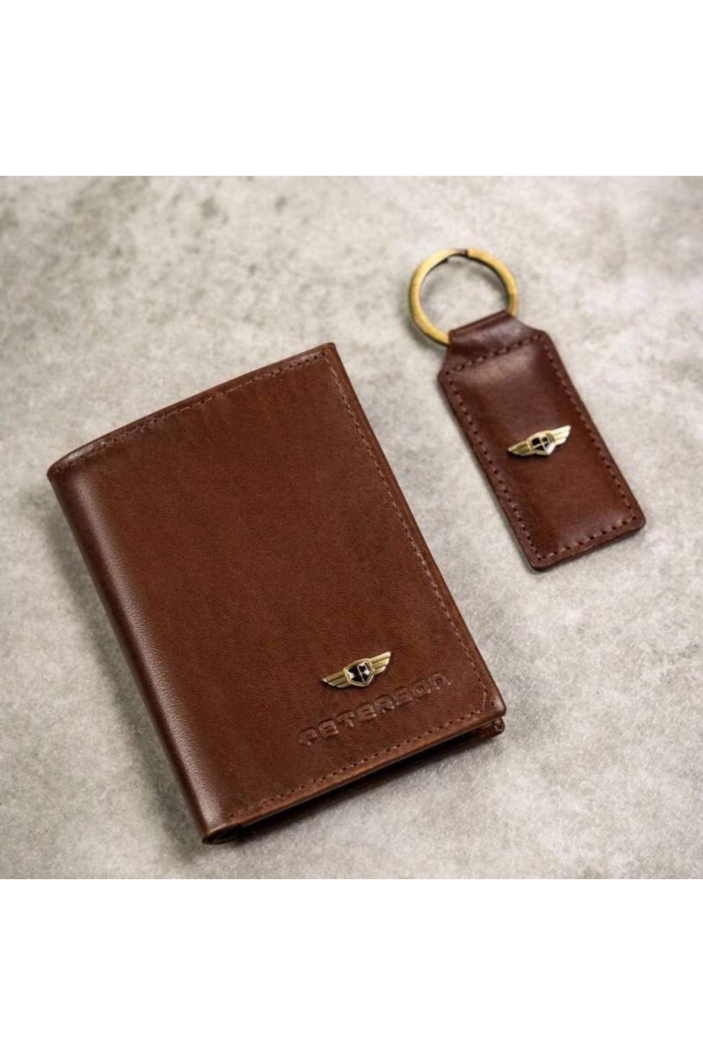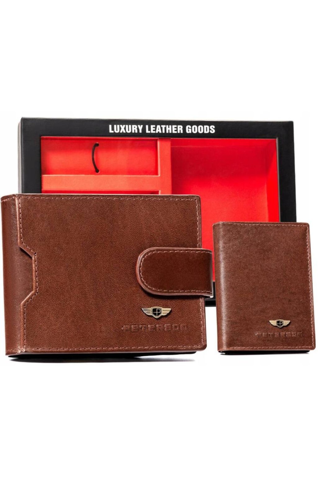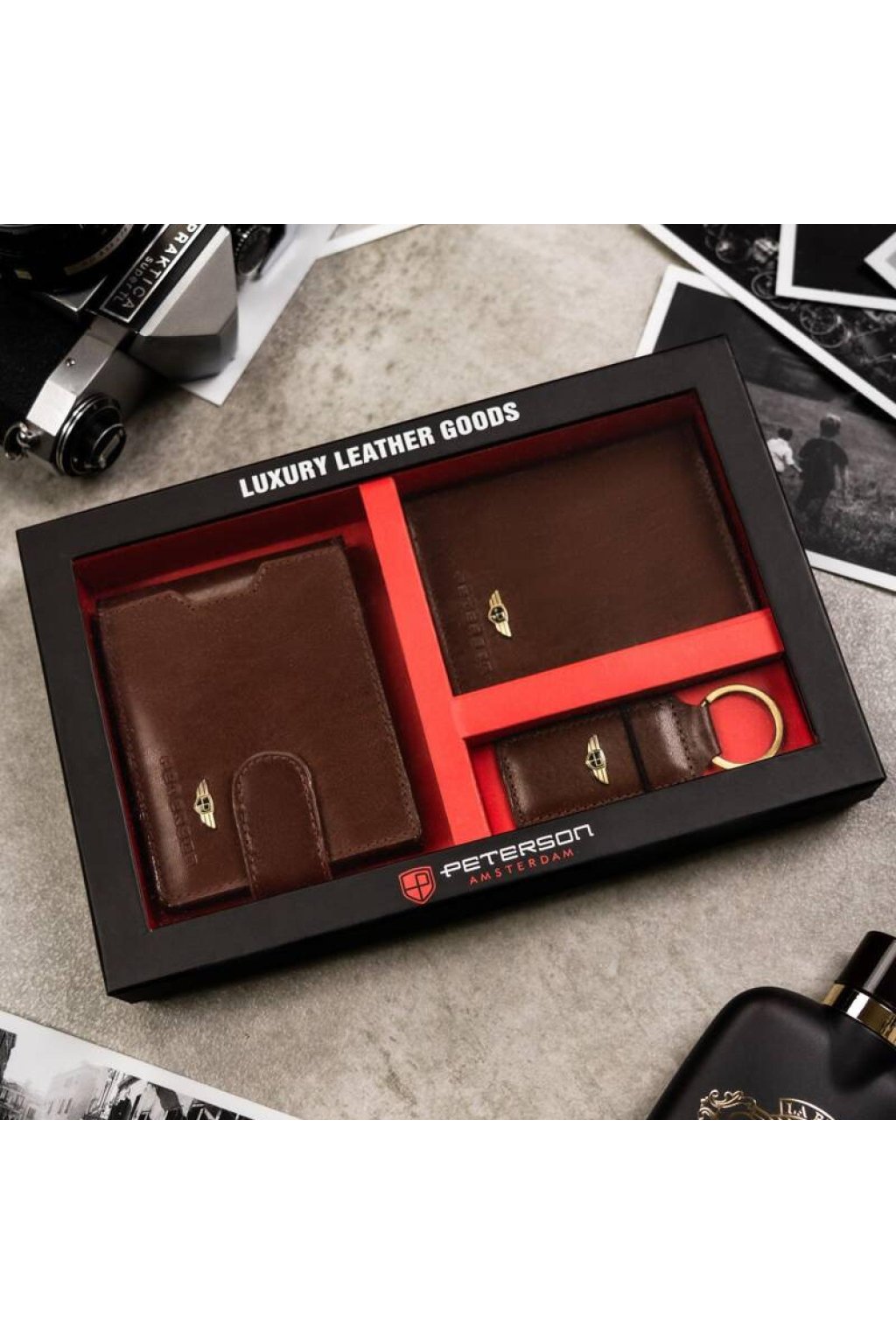 pánská kožená sada, Peterson peněženka, kožená dokladovka, luxusní klíčenka, elegantní pánský set, dárková sada pro muže, hnědá pánská peněženka, luxusní dárek pro muže.