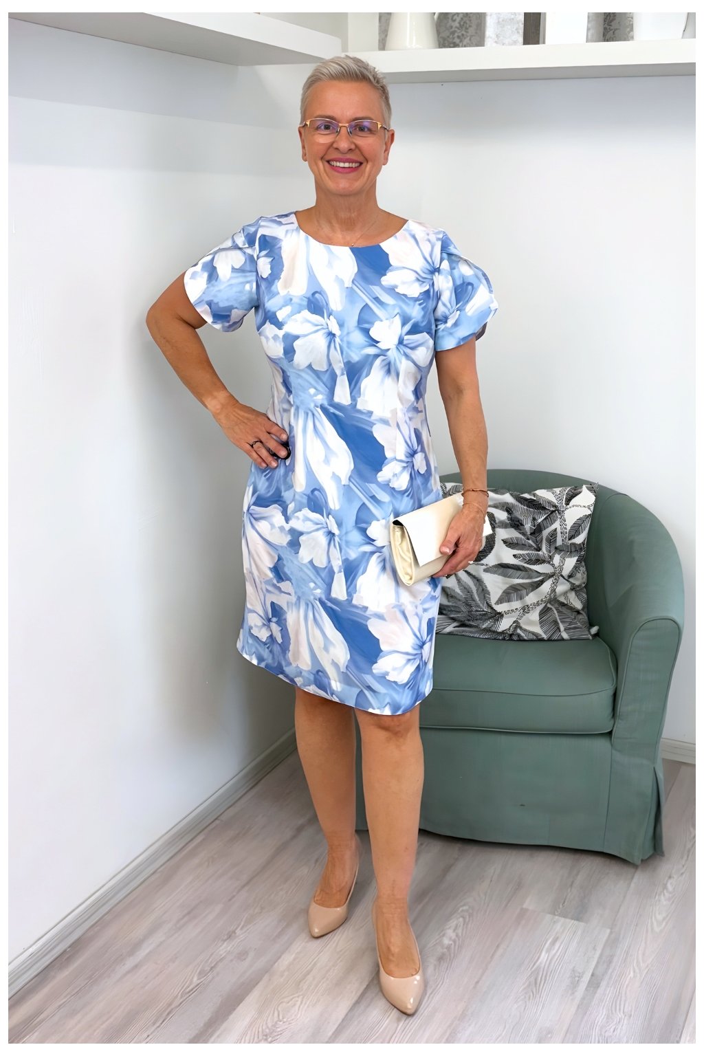 Tento model je ideální volbou pro slavnostní chvíle i letní dny, kdy chcete působit svěže, upraveně a žensky. Jemná kombinace bílé a modrých květů vytváří elegantní, přitom velmi příjemný dojem.
