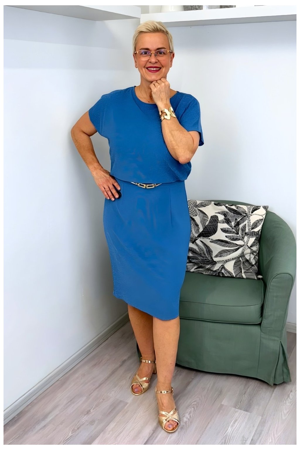 Elegantní společenské šaty s rovným střihem a jemným třpytem. Živůtek je zajímavě řešený tak, že působí jako samostatný vrchní díl navazující na sukni, což opticky sjednocuje siluetu a vytváří klidný dojem v oblasti břicha. Krátký rukáv dodává šatům lehkost a univerzální využití. V pase je umístěna zlatá ozdoba, kterou lze podle potřeby sundat. Zapínání je řešeno zipem na zadním díle.