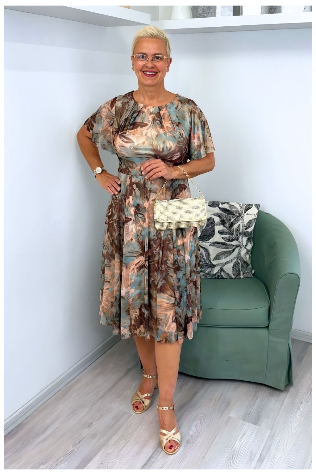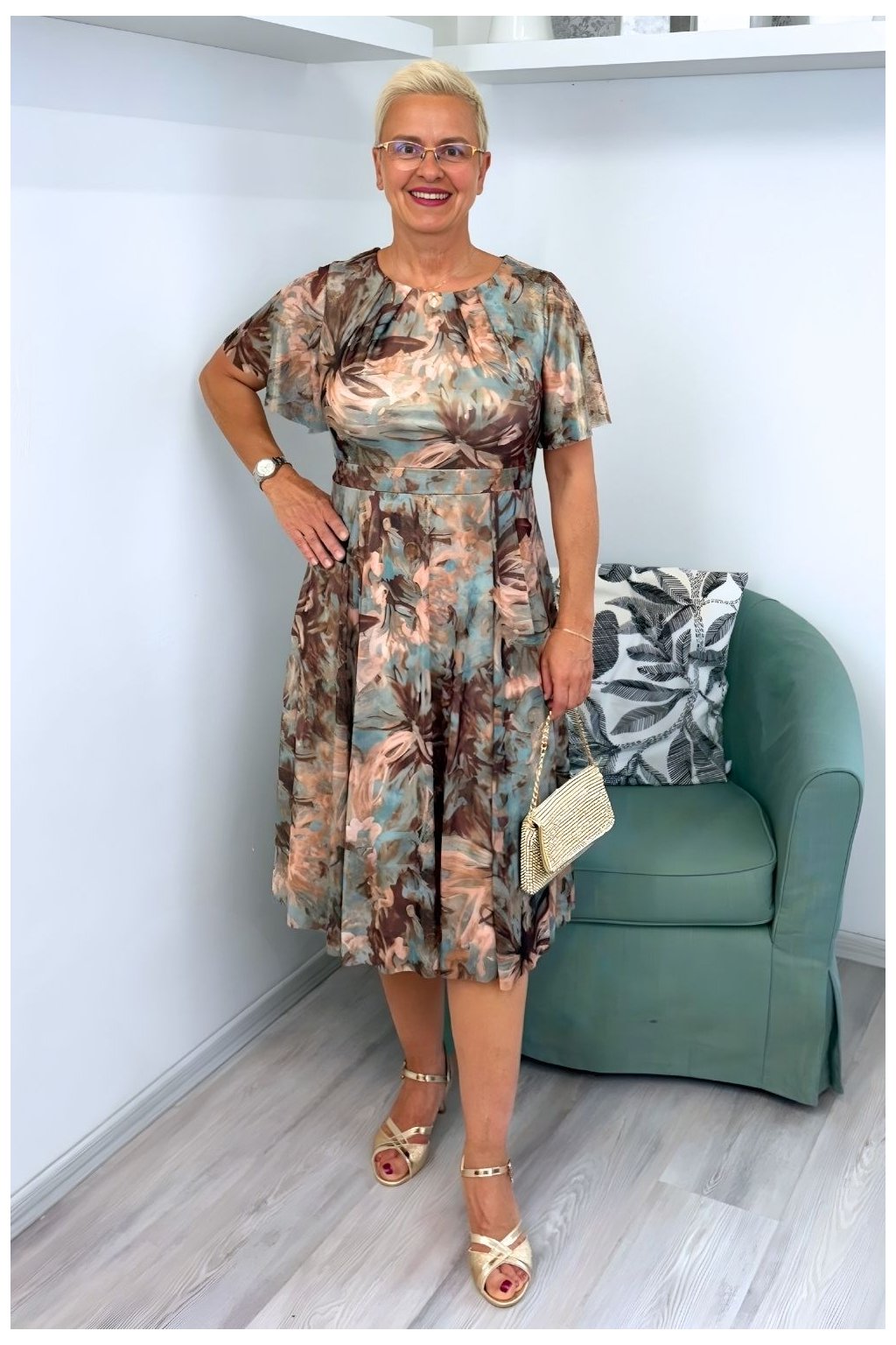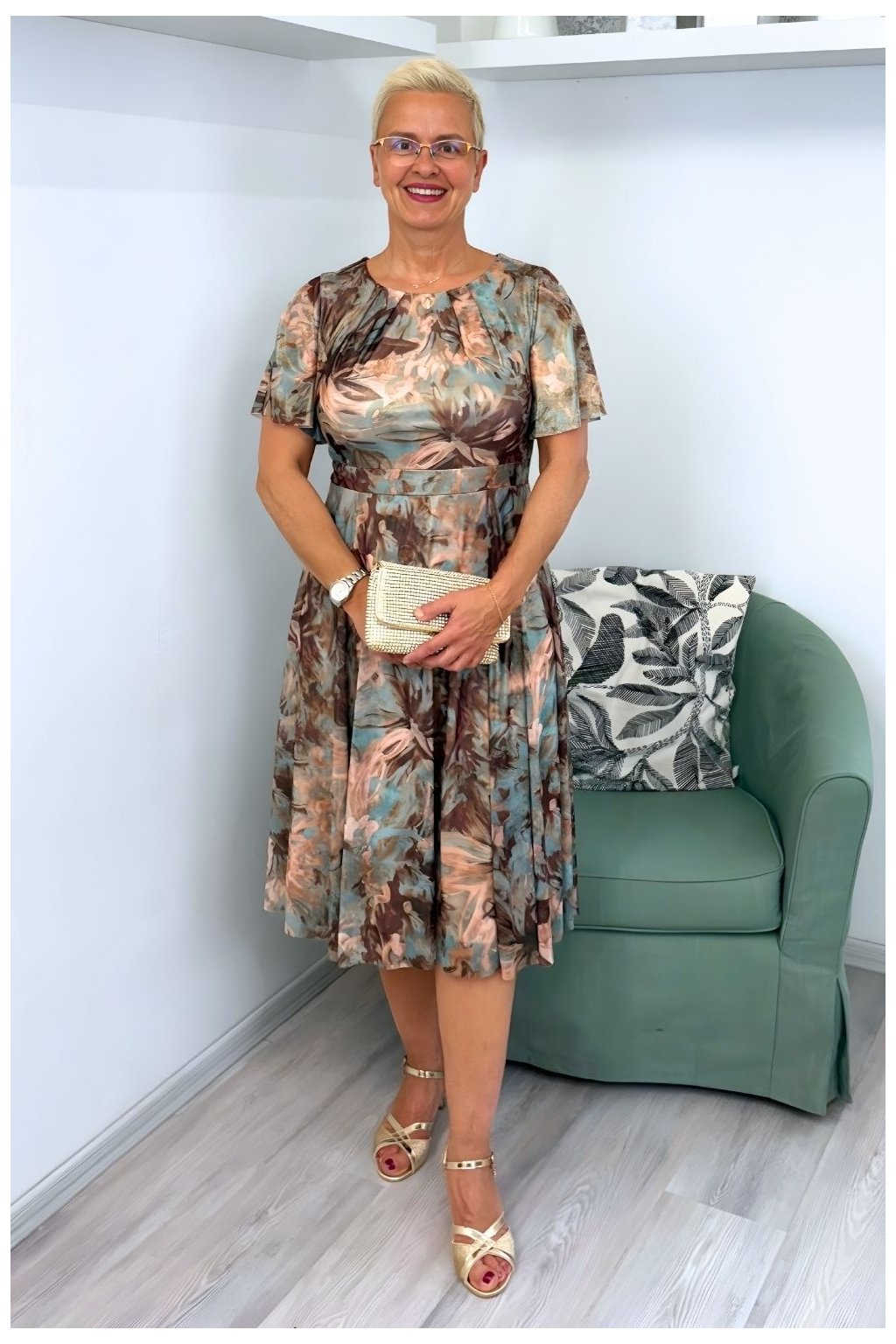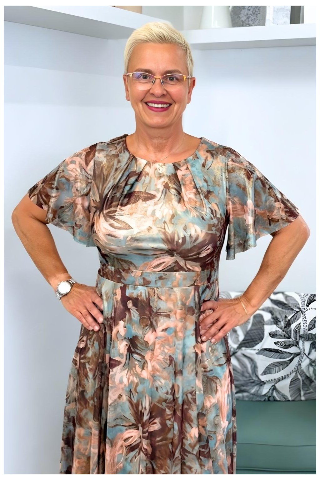 Společenské šaty s krátkým rukávem a projmutým pasem, který přirozeně zvýrazňuje siluetu. Sukně je směrem dolů rozšířená a působí lehce a vzdušně. Jemný květinový motiv s decentním kovovým leskem dodává modelu elegantní, vytříbený charakter. Zapínání na zip v zadní části.