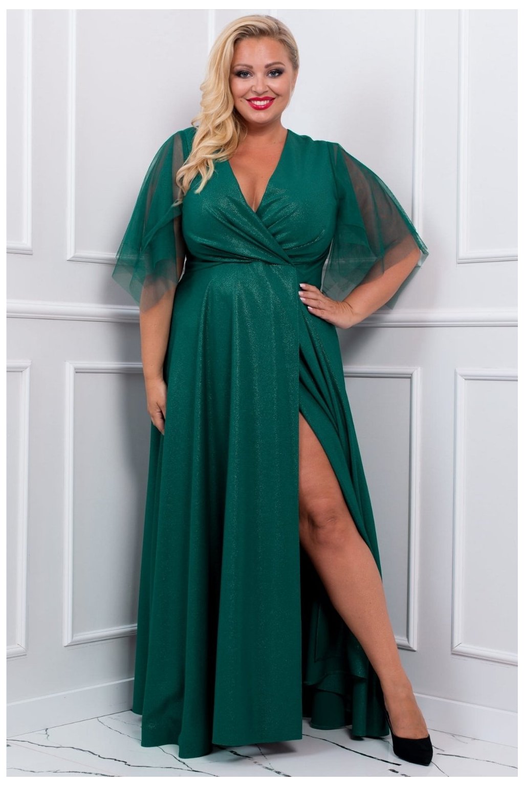 společenské šaty plus size, dlouhé zelené šaty, večerní šaty pro plnoštíhlé, plesové šaty s rozparkem, zeštíhlující zelené šaty, šaty na galavečer, elegantní zelené šaty Evita.