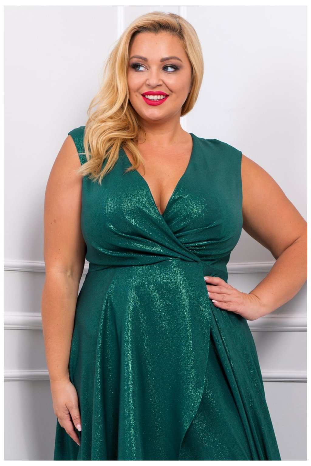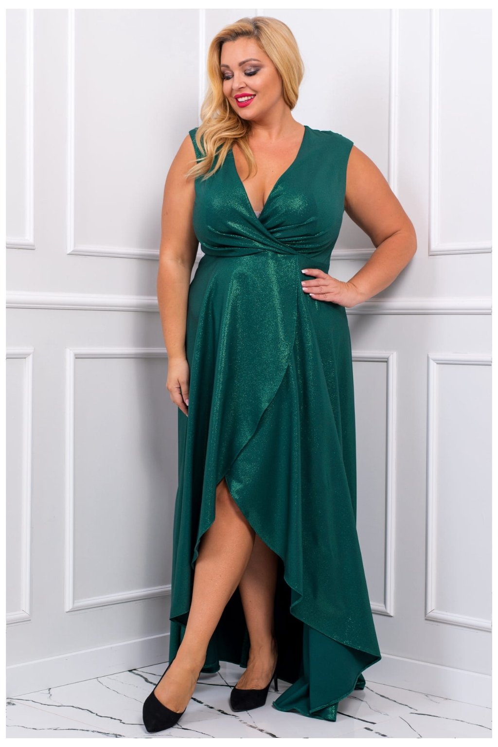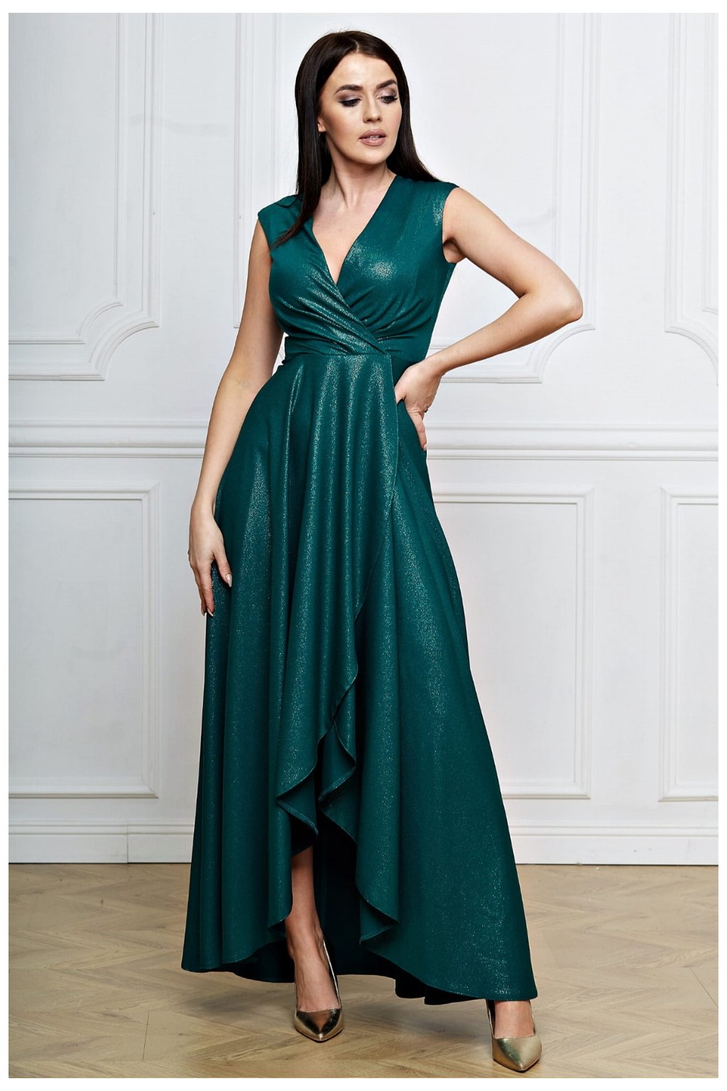 Elegantní zelené třpytivé společenské šaty vynesete na plesy, večírky, oslavy a další společenské události. Mají překřížený výstřih, volánovou dlouhou sukni, zapínání na skrytý zip vzadu. Materiál: 70% polyester, 25% viskóza, 5% elastan.