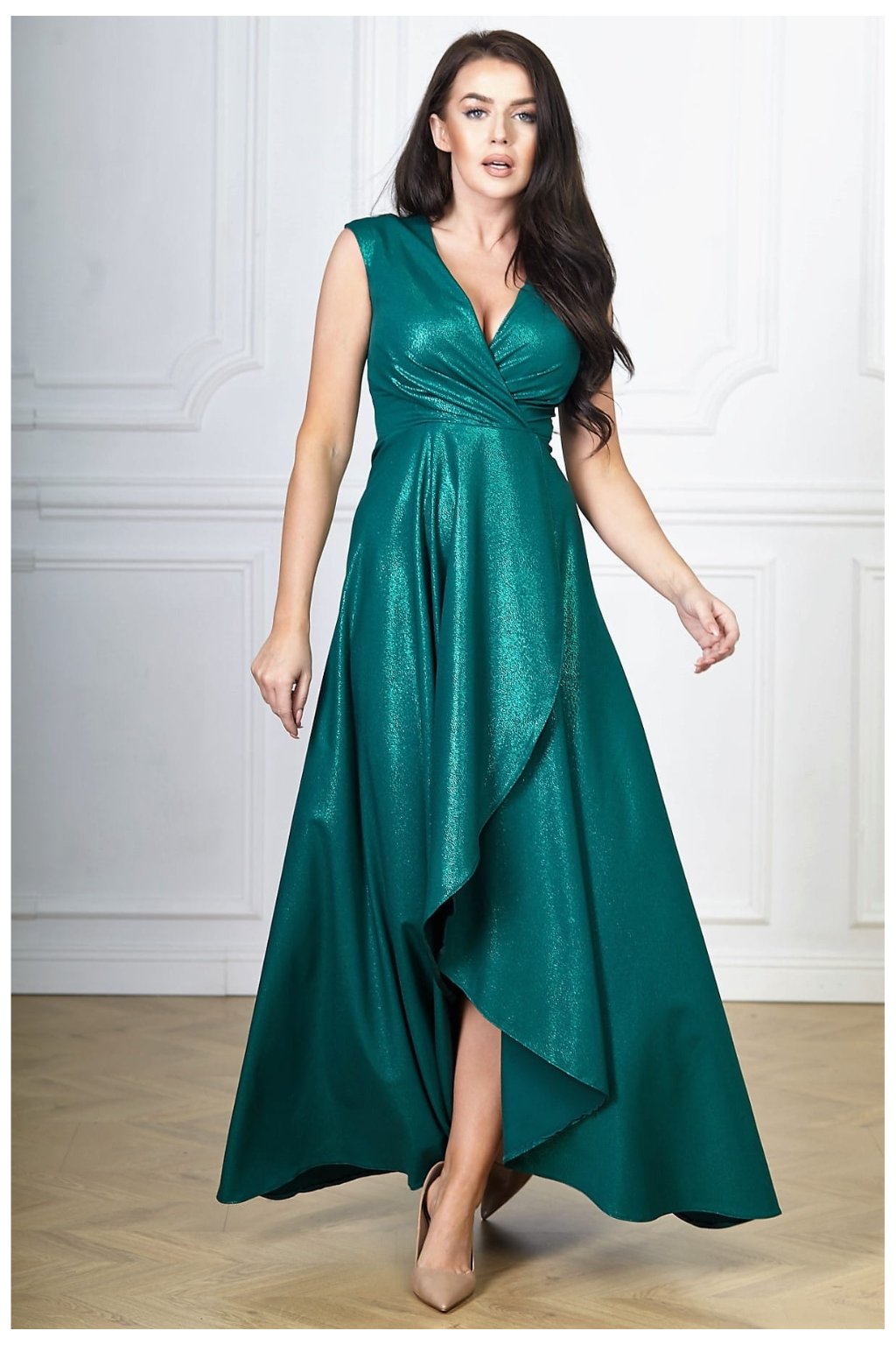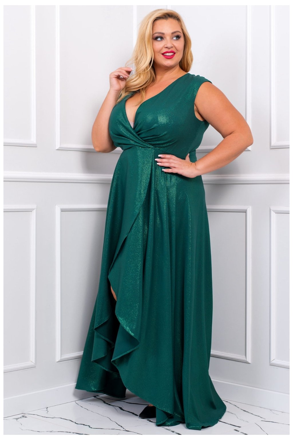 zelené společenské šaty, plesové šaty pro plnoštíhlé, dlouhé večerní šaty, elegantní šaty s výstřihem, brokátové šaty, šaty na svatbu pro hosty, luxusní smaragdové šaty