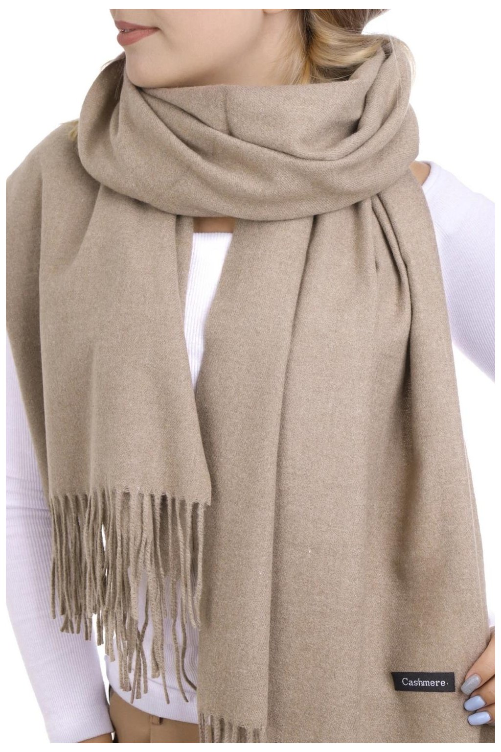 světle béžová šála, dámská hřejivá šála, zimní šála s třásněmi, elegantní šála k kabátu, viskózová šála, měkká dámská šála