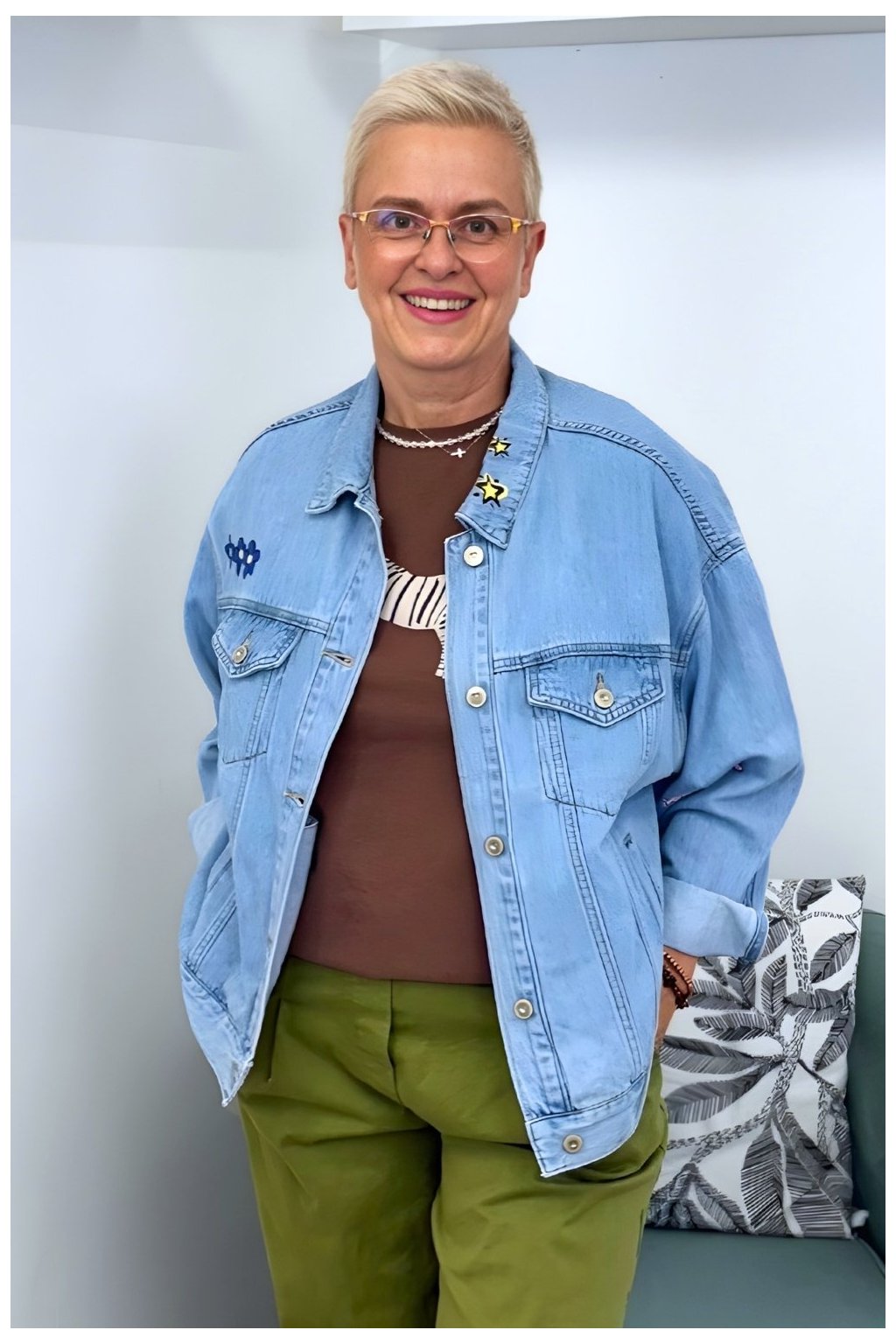 "Džíska" - musí mít šatníku každé moderní ženy. A tato je originální svými malými potištěnými obrázky - srdíčky, kytičkami, obláčky, hvězdičkami. Můžete ji nosit s džínami, plátěnými kalhotami, kraťasy, sukní, ale i šaty. Světle modrá džínovina, není drbaná, kapsy, kovové knoflíky, lehce pružný a měkký materiál 59% bavlna, 40% lyocell, 2% polyester. Velikost oversize - můžete nosit od velikosti 40 do velikosti 48, jak se komu líbí a má ráda. Rozměry: prsa 116 cm, délka 62 cm, rukáv od krku 72 cm.