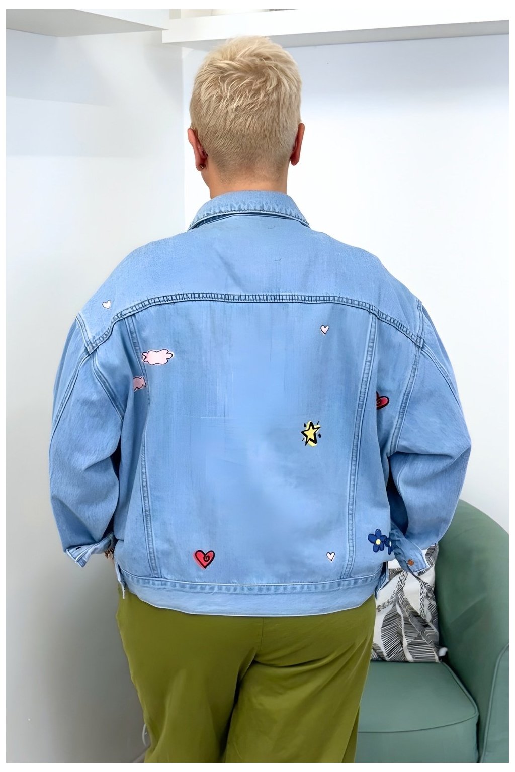 Džínová bunda volnějšího, oversize střihu s klasickým límcem a zapínáním na kovové knoflíky. Bunda má kapsy a je ozvláštněná drobnými potištěnými motivy – srdíčky, kytičkami, obláčky a hvězdičkami, které jí dodávají hravý, ale stále nositelný charakter. Světle modrá džínovina není drbaná, působí čistě a upraveně. Materiál je měkký a lehce pružný.