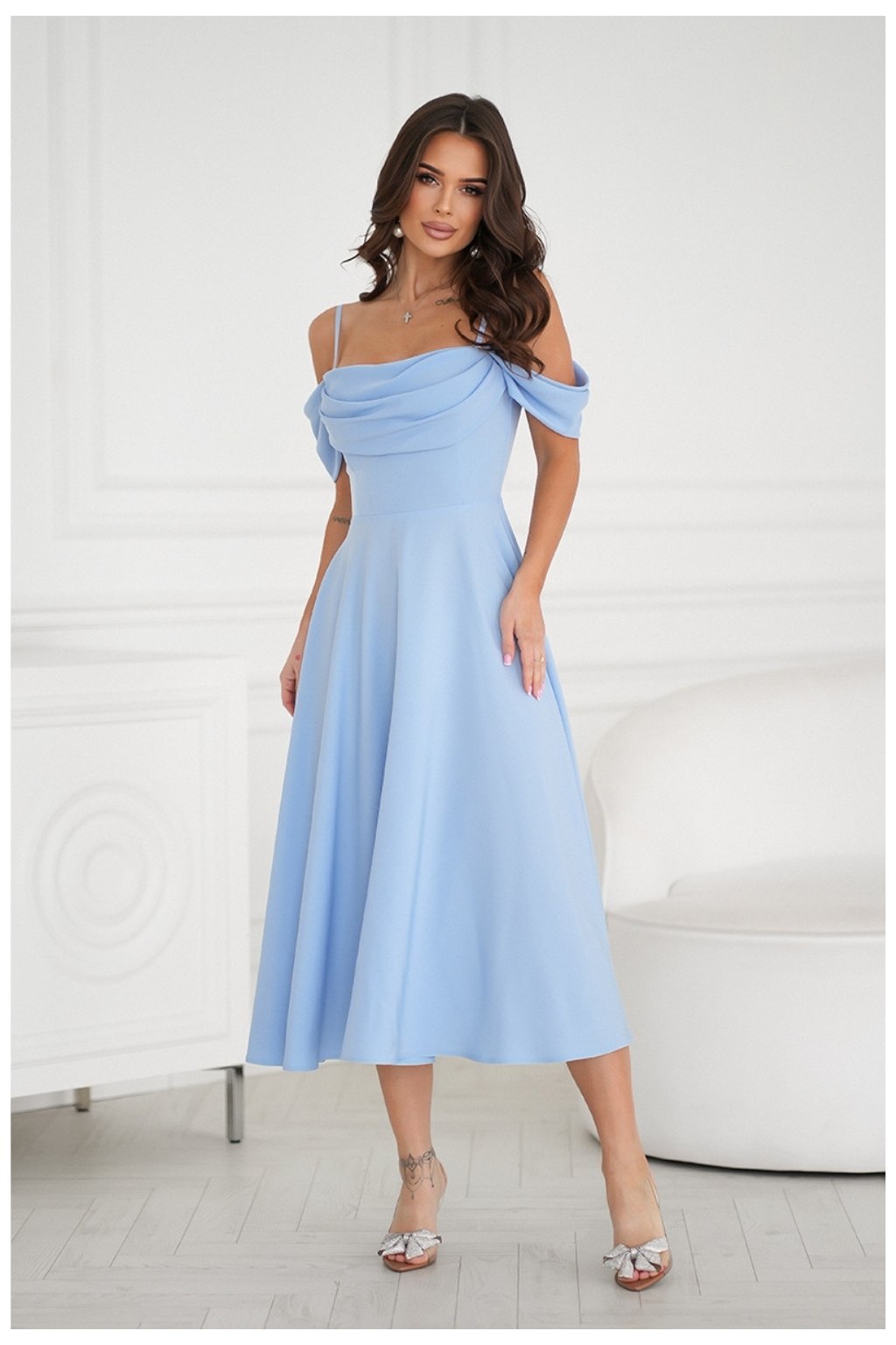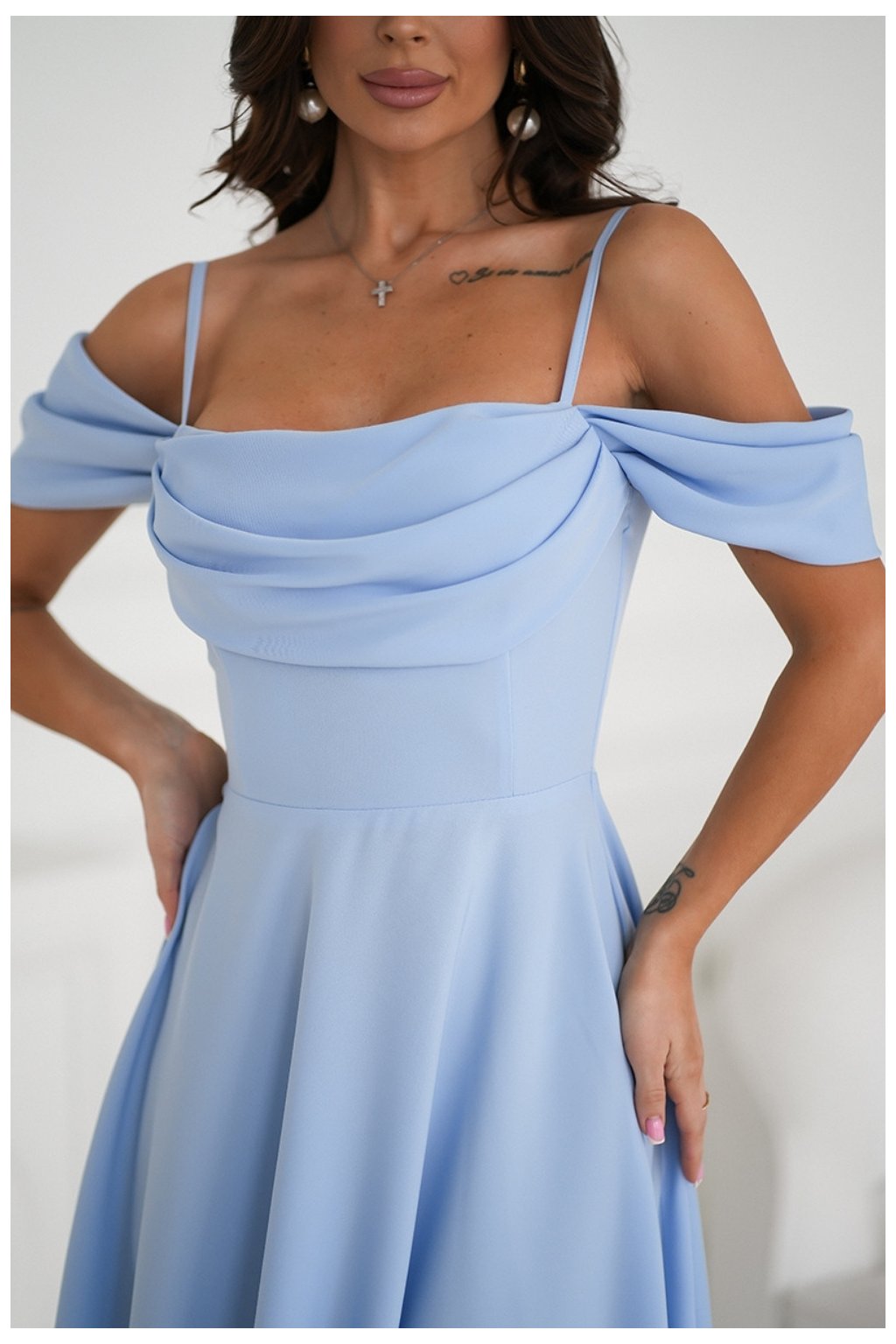 Krásné modré šaty, které vynesete na svatby, plesy, galavečery, taneční i další společenské události. Šaty mají nastavitelná špagetová ramínka, rovný výstřih s vodou spadající na ramena, zapínání vzadu na zip. Materiál: 93% polyester, 7% elastan.