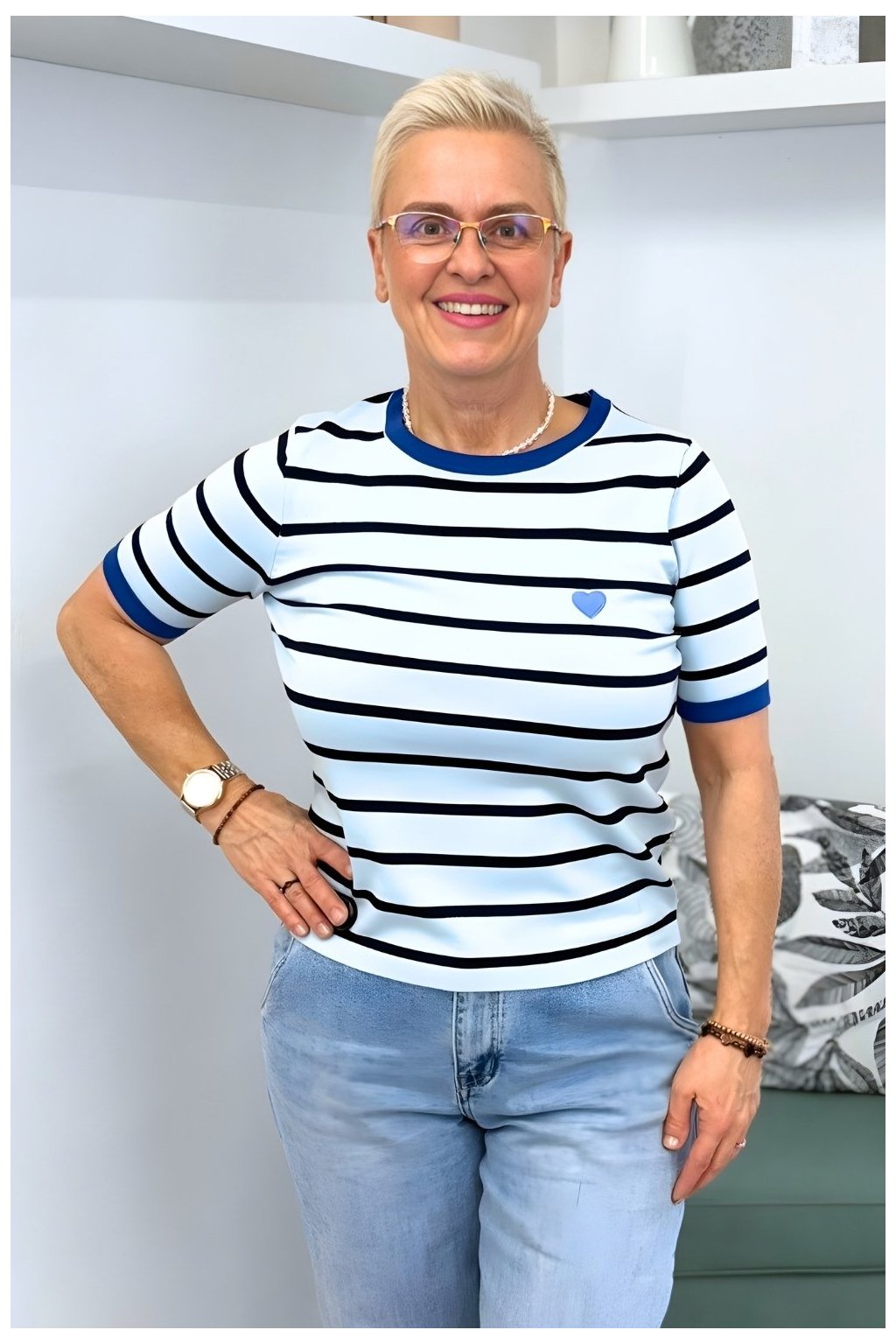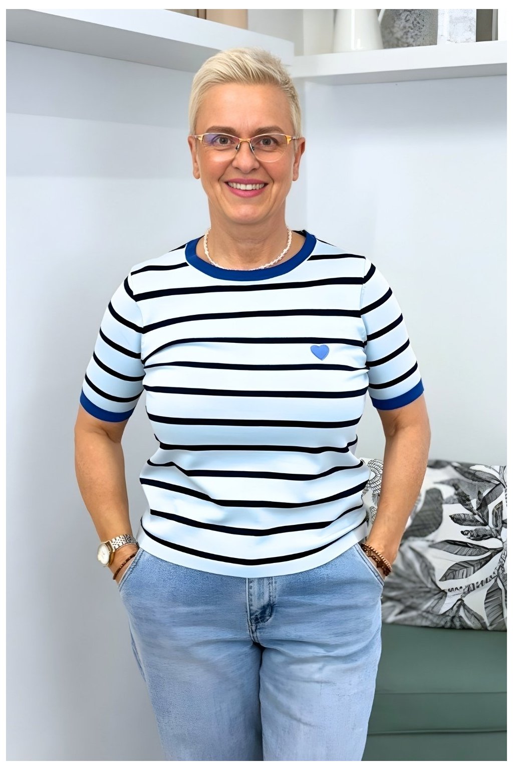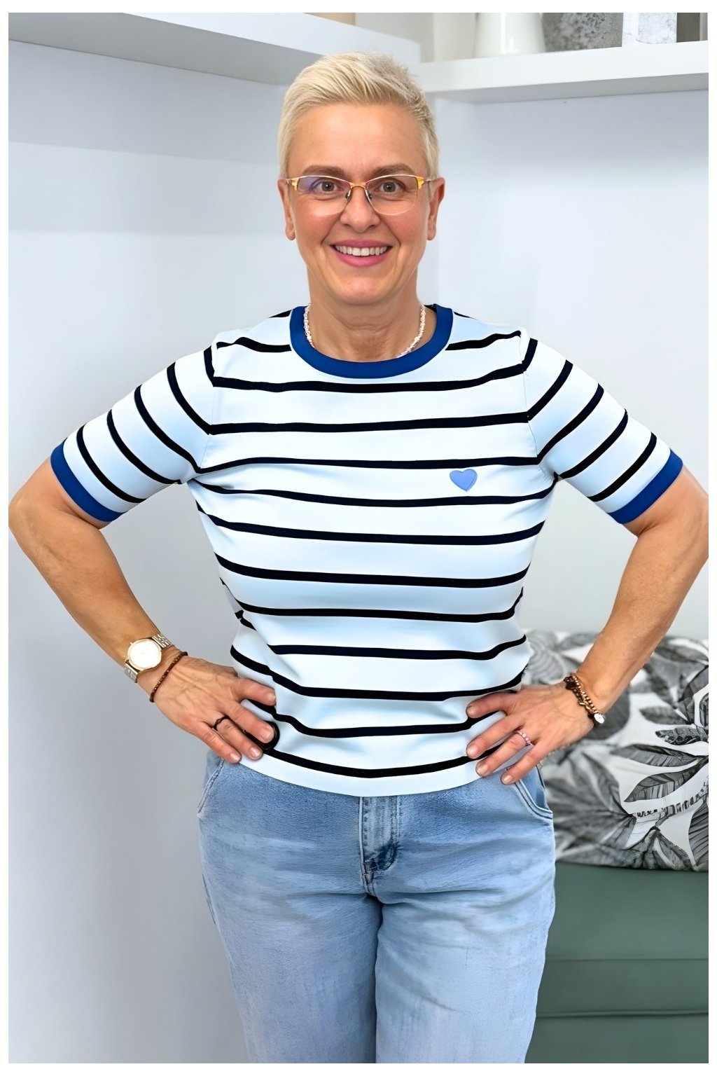 Lehký dámský svetr s krátkým rukávem a kulatým výstřihem. Přiléhavý, ale pohodlný střih jemně kopíruje postavu. Design doplňují vodorovné proužky a malé srdíčko na hrudi, které dodává modelu hravý detail.