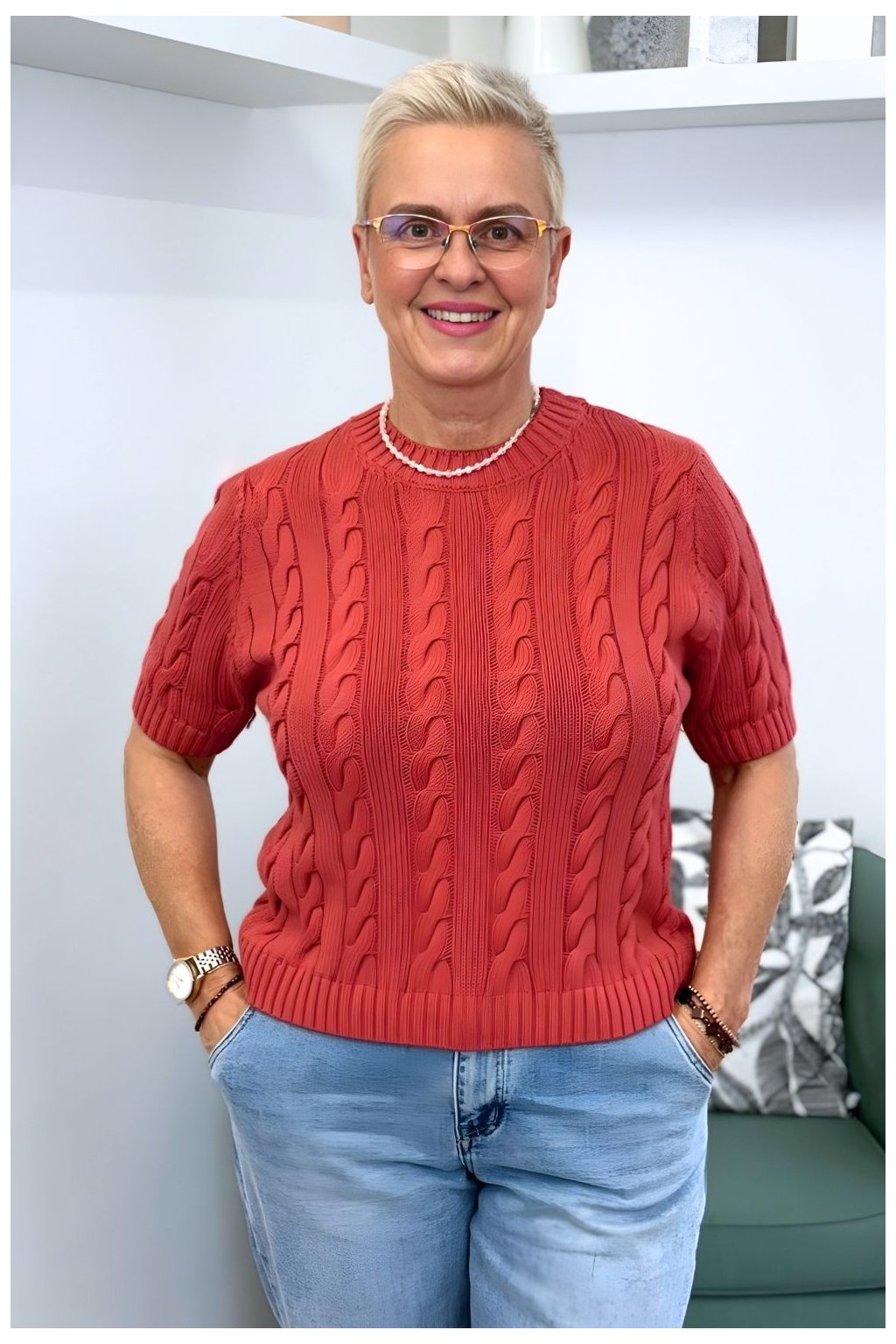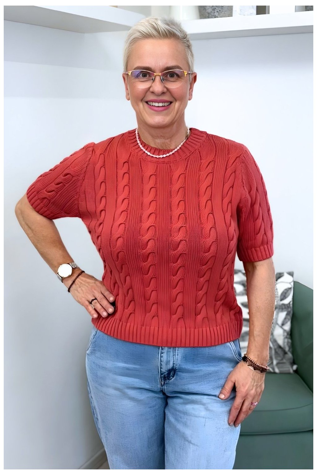 Vhodný pro ženy, které hledají pohodlný, nadčasový svetr s jemným vzorem. Díky volnějšímu střihu sedí přibližně velikostem 40–44.