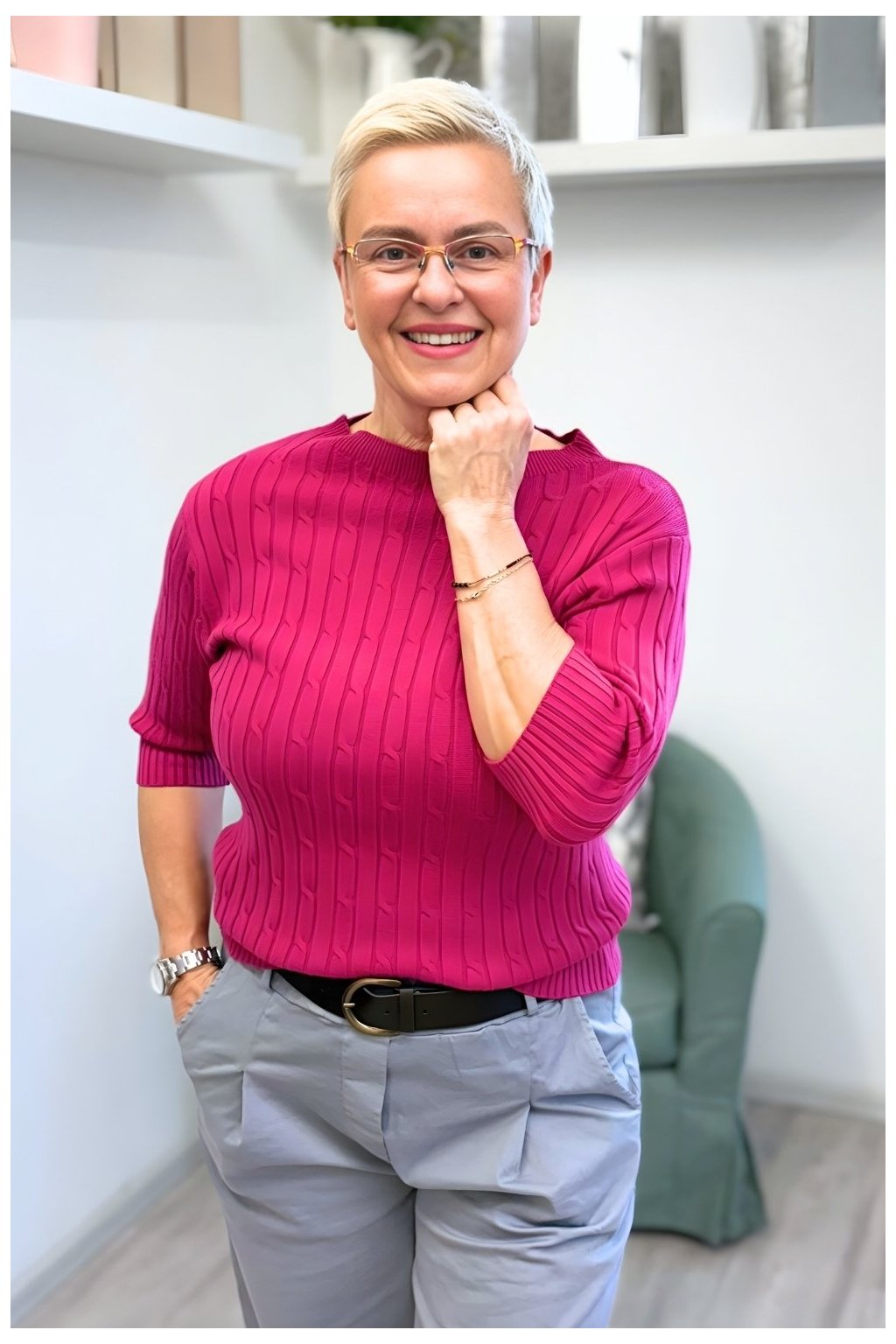 Pro ženy ve velikosti cca 38–42, které hledají pohodlný, ale upravený kousek do šatníku. Ideální pro dámy, které chtějí jemně zvýraznit postavu, ale zároveň ocení komfort pružného materiálu a nadčasový styl.