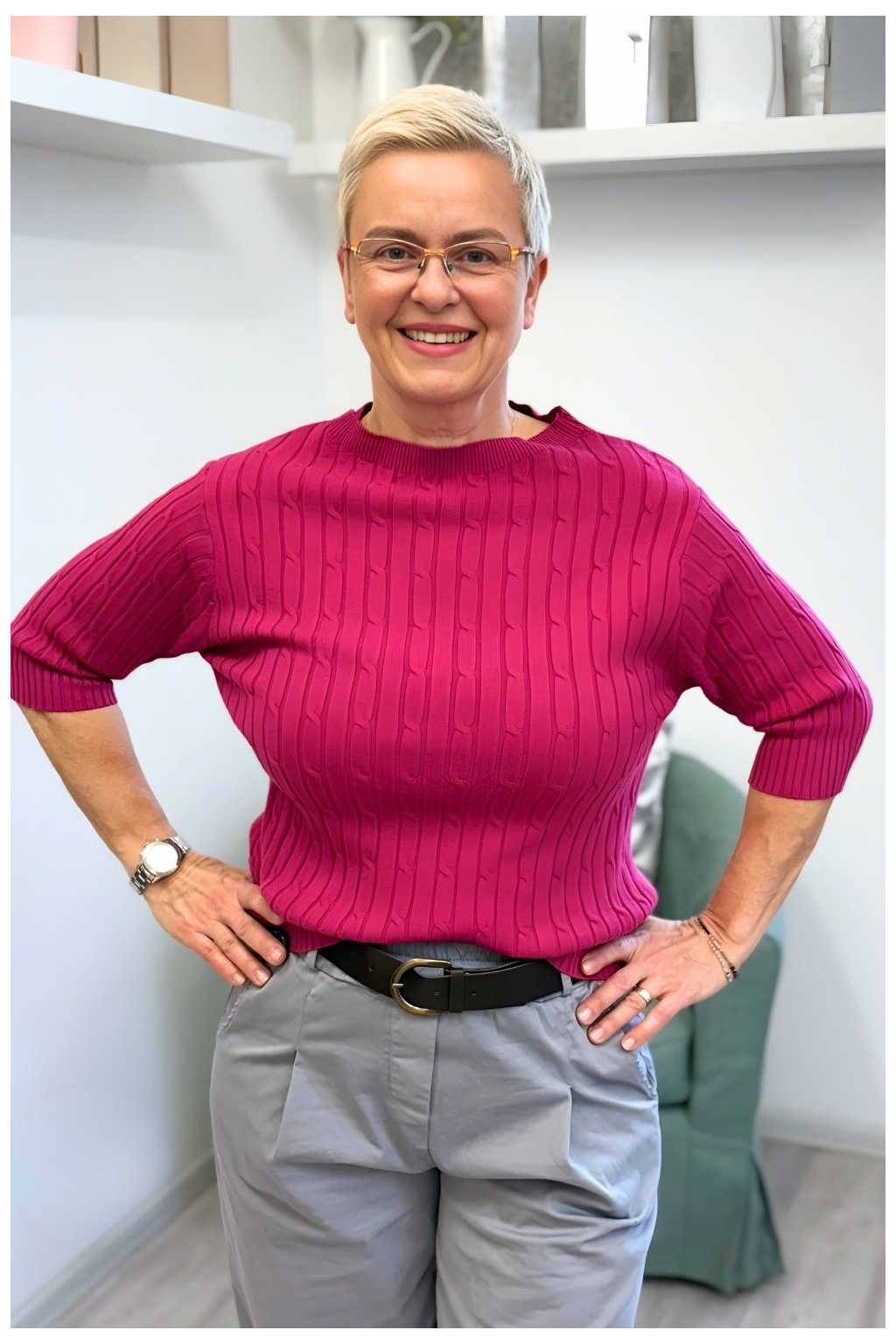 Elegantní svetřík s vyplétaným vzorem na přední straně působí nadčasově a velmi žensky. Má rovný, lehce přiléhavý střih, který hezky kopíruje postavu, aniž by ji svazoval. Rukávy ke lokti dodávají svetříku univerzální charakter a činí jej vhodným pro celoroční nošení. Jemná struktura úpletu přidává vizuální zajímavost, ale zůstává decentní a snadno kombinovatelná.