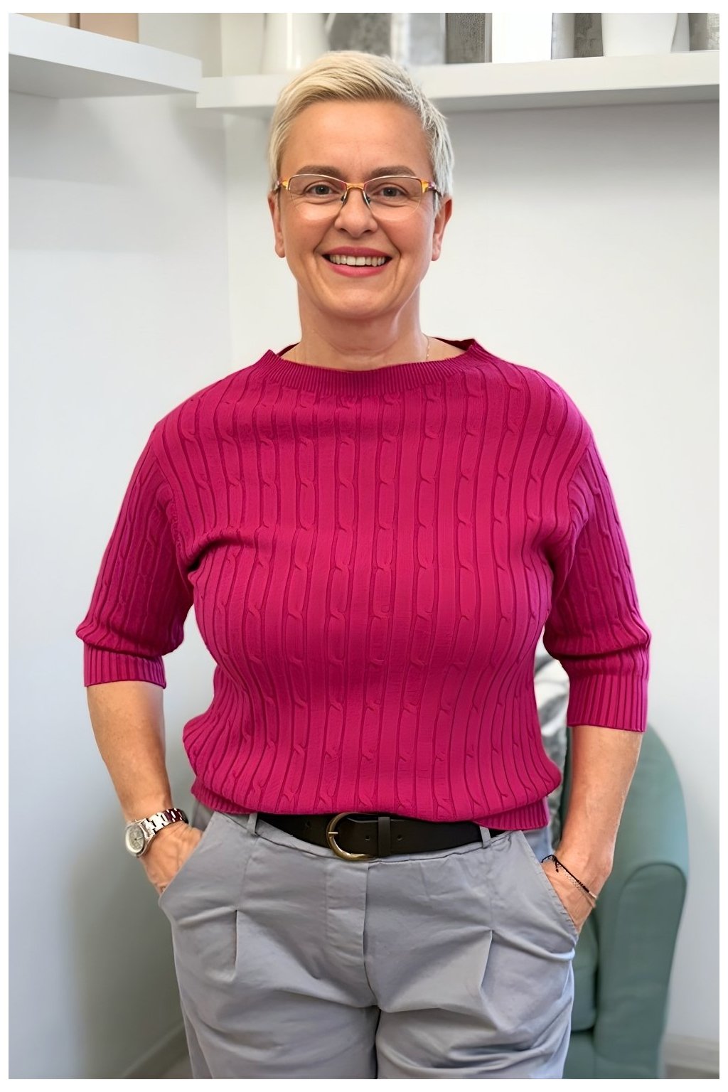 dámský svetřík se vzorem, úpletový svetřík, elegantní dámský svetr, svetřík s rukávem ke lokti, pohodlný svetr pro ženy, svetřík do práce, dámský svetr na celý rok.